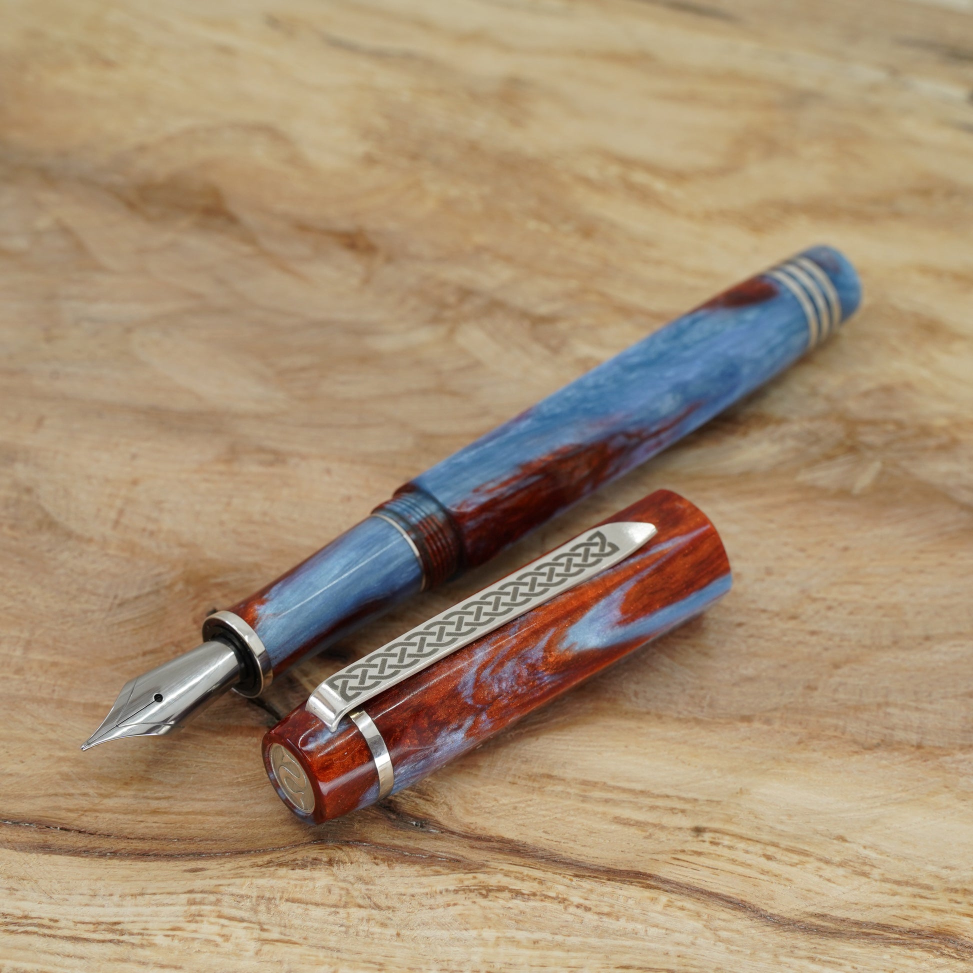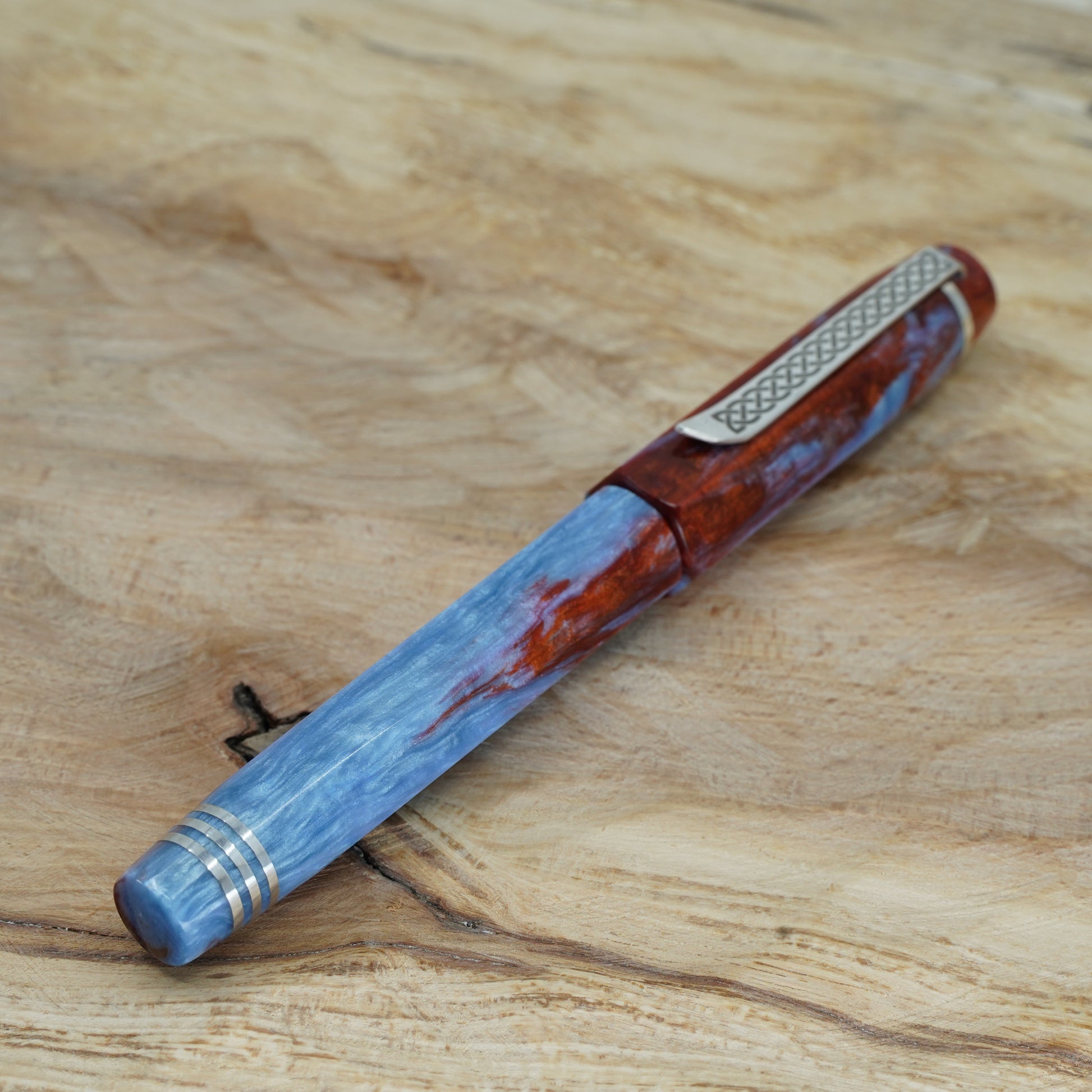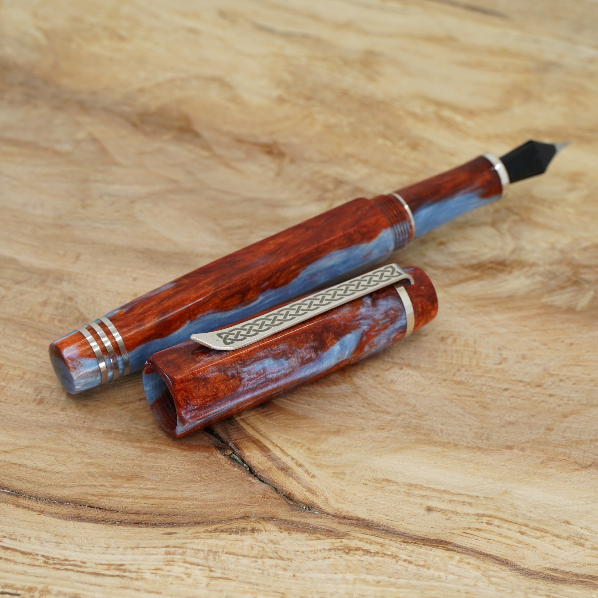 Ten Wisps Hexagon with complimentary finials, fitted with a polished steel Jowo nib size 6. PEN SIZE: Approximately is 145m/m long including cap. 135m/m nib to body end. Body diameter 15m/m with a 13m/m thread. Cap diameter 16m/m. Nib make fitted is a Jowo size six polished steel medium tip other tip sizes available at no extra cost extra fine, fine, broad. please use the contact form to send me your preferred size. The pen comes with a Schmidt K5 ink converter, other nib options available please contact me for information and pricing. A totally hand crafted pen including all the silver work.