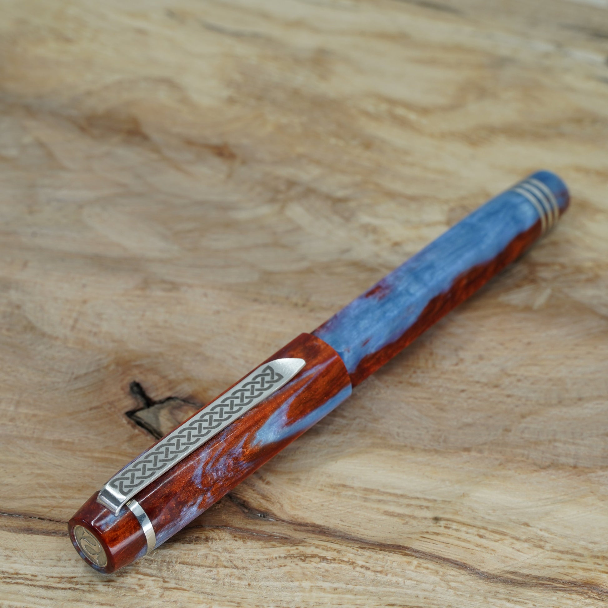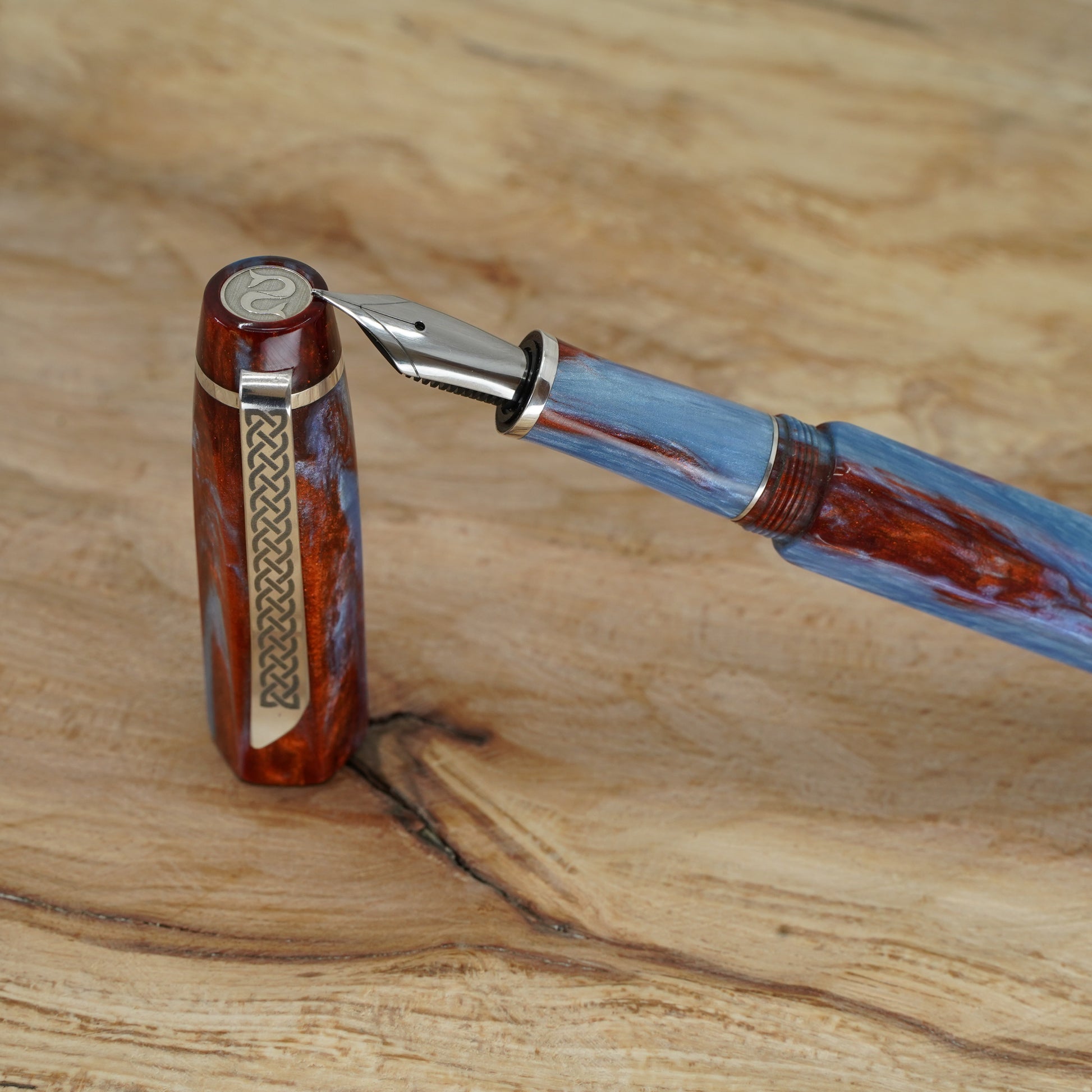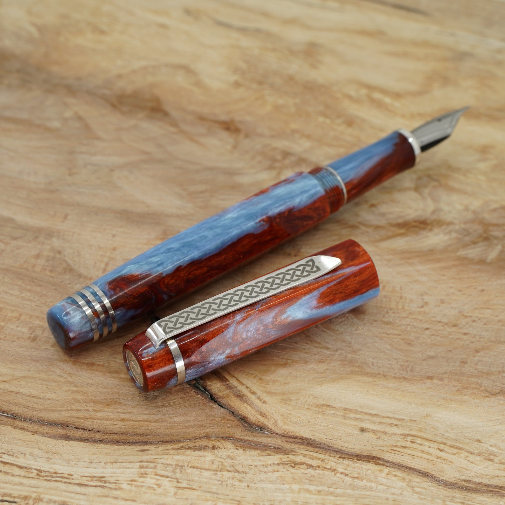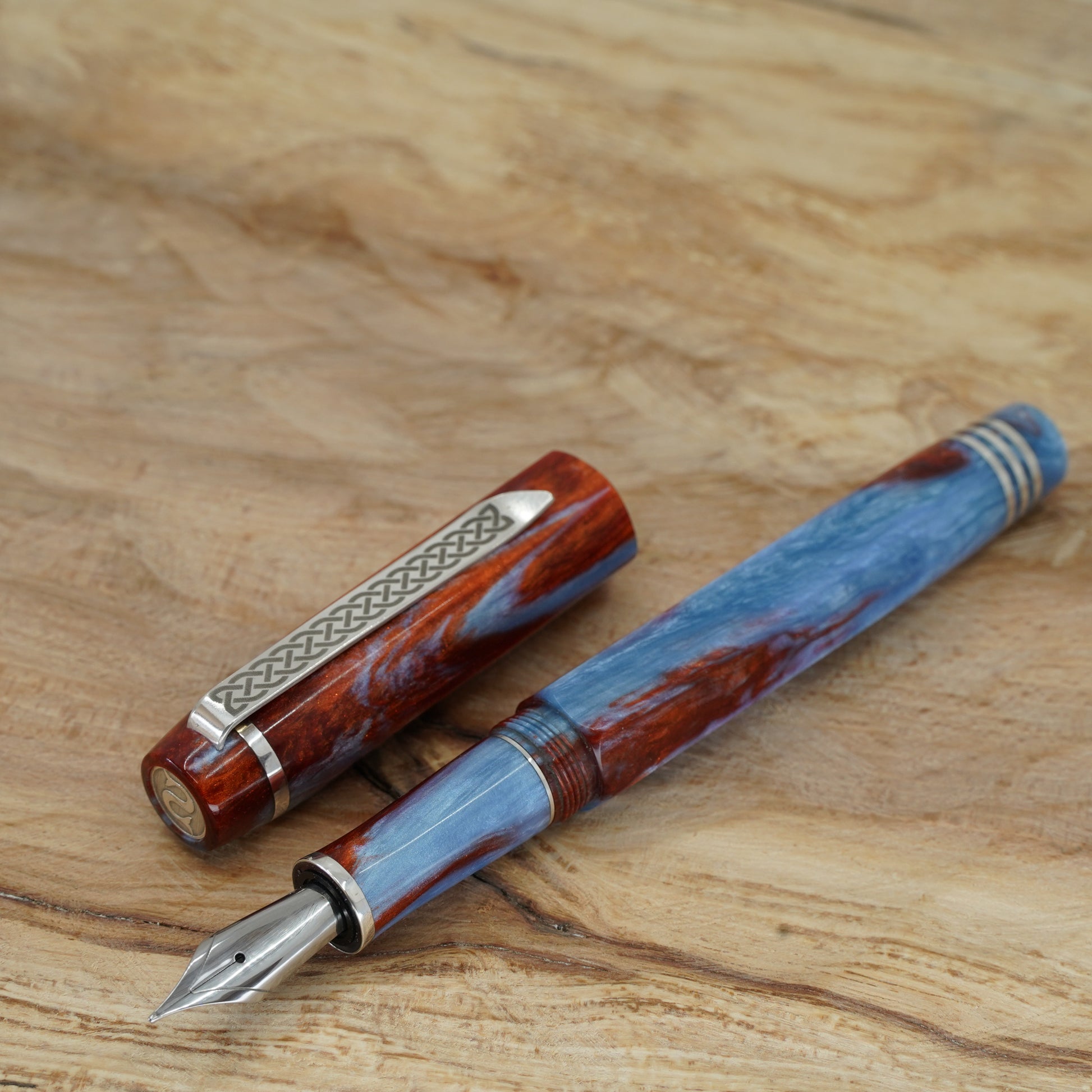 Ten Wisps Hexagon with complimentary finials, fitted with a polished steel Jowo nib size 6. PEN SIZE: Approximately is 145m/m long including cap. 135m/m nib to body end. Body diameter 15m/m with a 13m/m thread. Cap diameter 16m/m. Nib make fitted is a Jowo size six polished steel medium tip other tip sizes available at no extra cost extra fine, fine, broad. please use the contact form to send me your preferred size. The pen comes with a Schmidt K5 ink converter, other nib options available please contact me for information and pricing. A totally hand crafted pen including all the silver work.