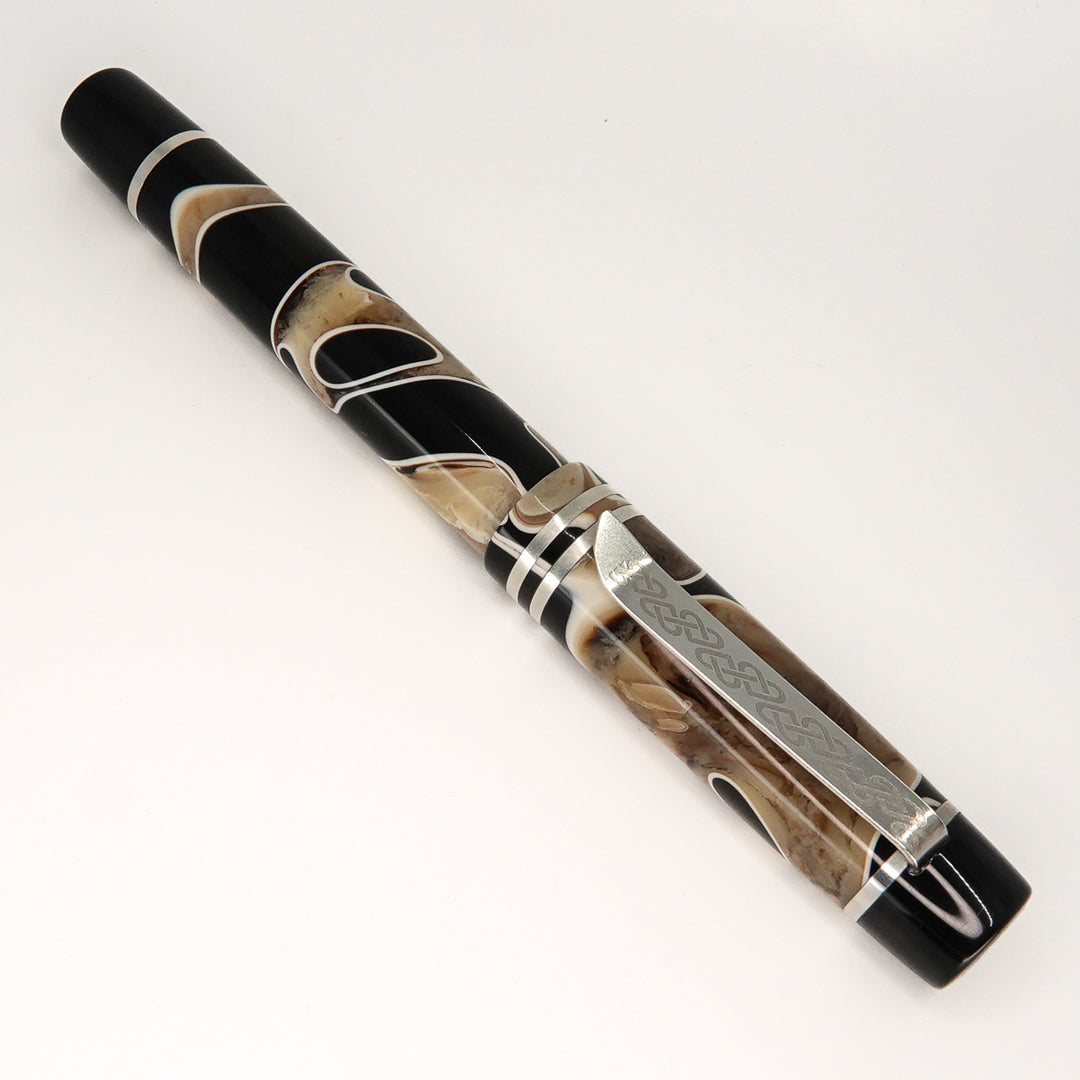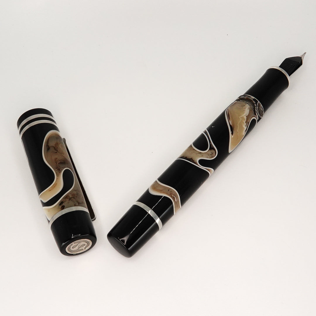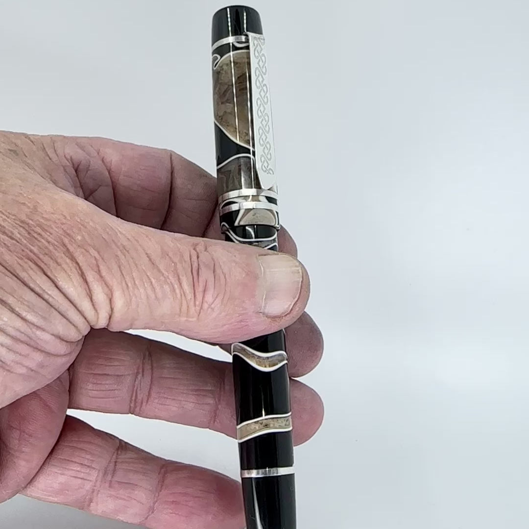 Triassic Lava Italian acrylic from Silverburlpens is a totally hand crafted pen, the pen is fitted with a polished steel Jowo nib size 6, and comes with any nib tip size and Schmidt K5 ink converter. Other nibs are available upon request. The pen size is approximately 145m/m long including cap, 135m/m nib to body end, body diameter 15m/m with a 14m/m thread, and cap diameter 16m/m. The silver used in this pen is Argentium .940, which is whiter and brighter than traditional .925 sterling and much more tarnish resistant. Argentium Silver is hypoallergenic and is well-suited for those who are unable to wear traditional Sterling silver jewellery. Argentium also has antibacterial properties, and alloys do not contain nickel.