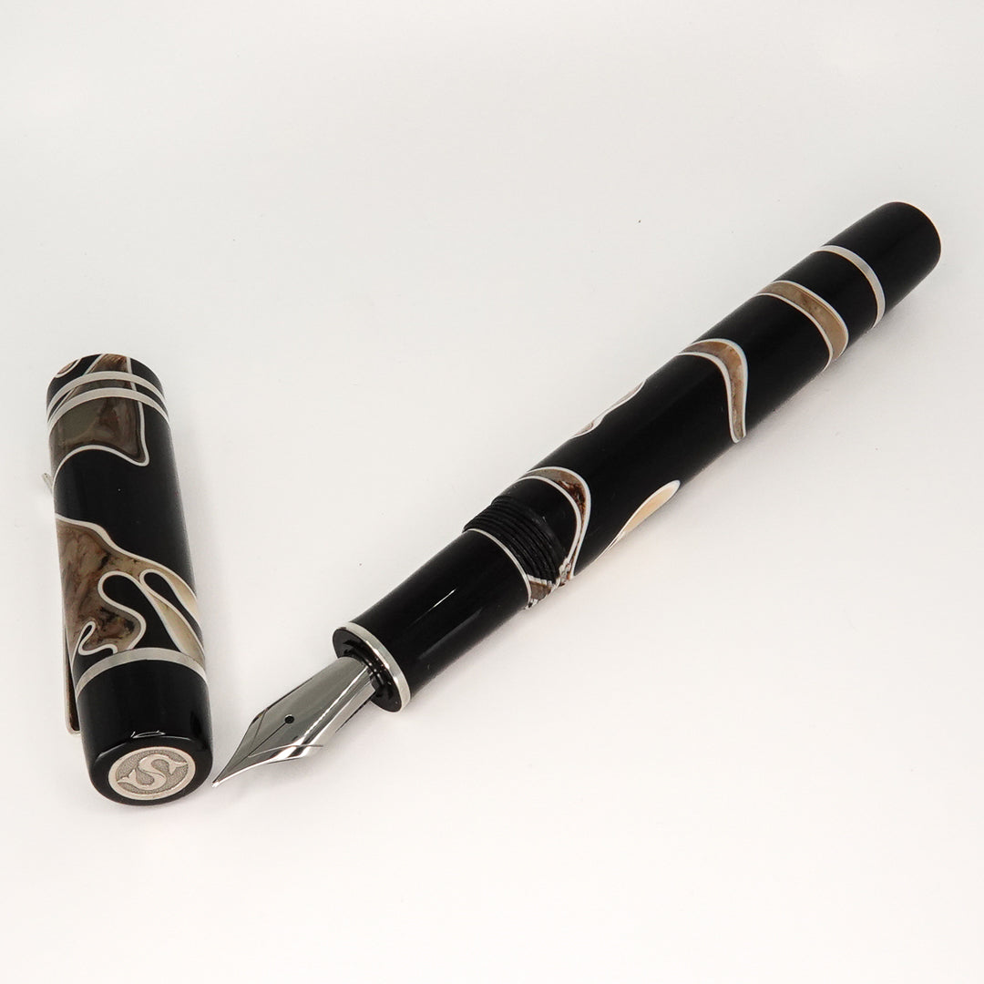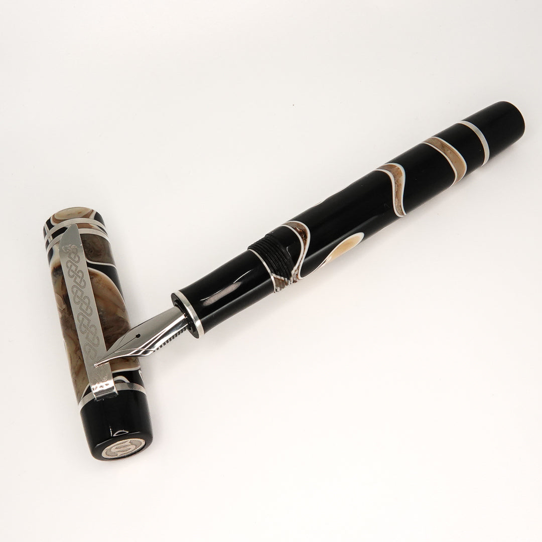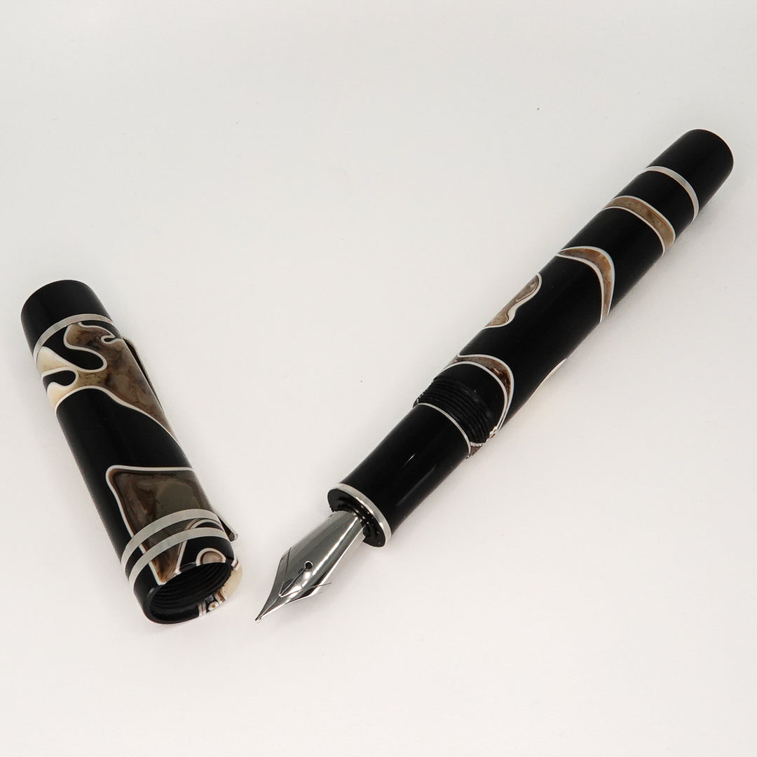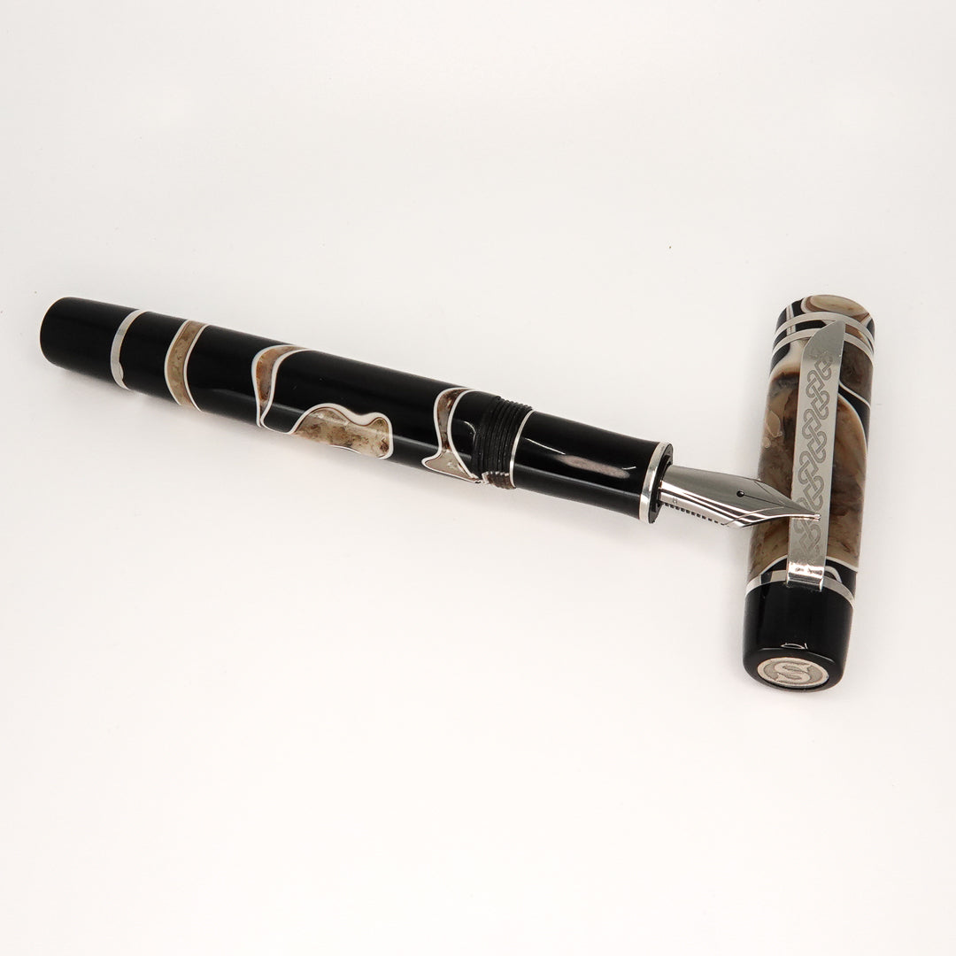 Triassic Lava Italian acrylic from Silverburlpens is a totally hand crafted pen, the pen is fitted with a polished steel Jowo nib size 6, and comes with any nib tip size and Schmidt K5 ink converter. Other nibs are available upon request. The pen size is approximately 145m/m long including cap, 135m/m nib to body end, body diameter 15m/m with a 14m/m thread, and cap diameter 16m/m. The silver used in this pen is Argentium .940, which is whiter and brighter than traditional .925 sterling and much more tarnish resistant. Argentium Silver is hypoallergenic and is well-suited for those who are unable to wear traditional Sterling silver jewellery. Argentium also has antibacterial properties, and alloys do not contain nickel.