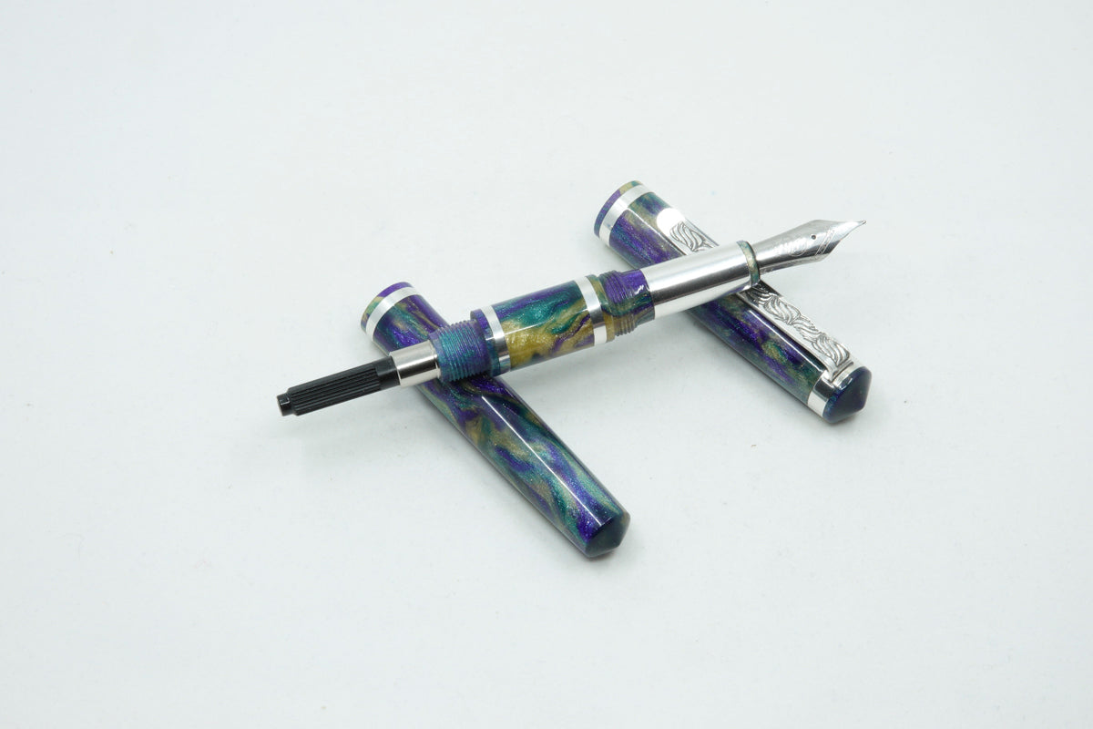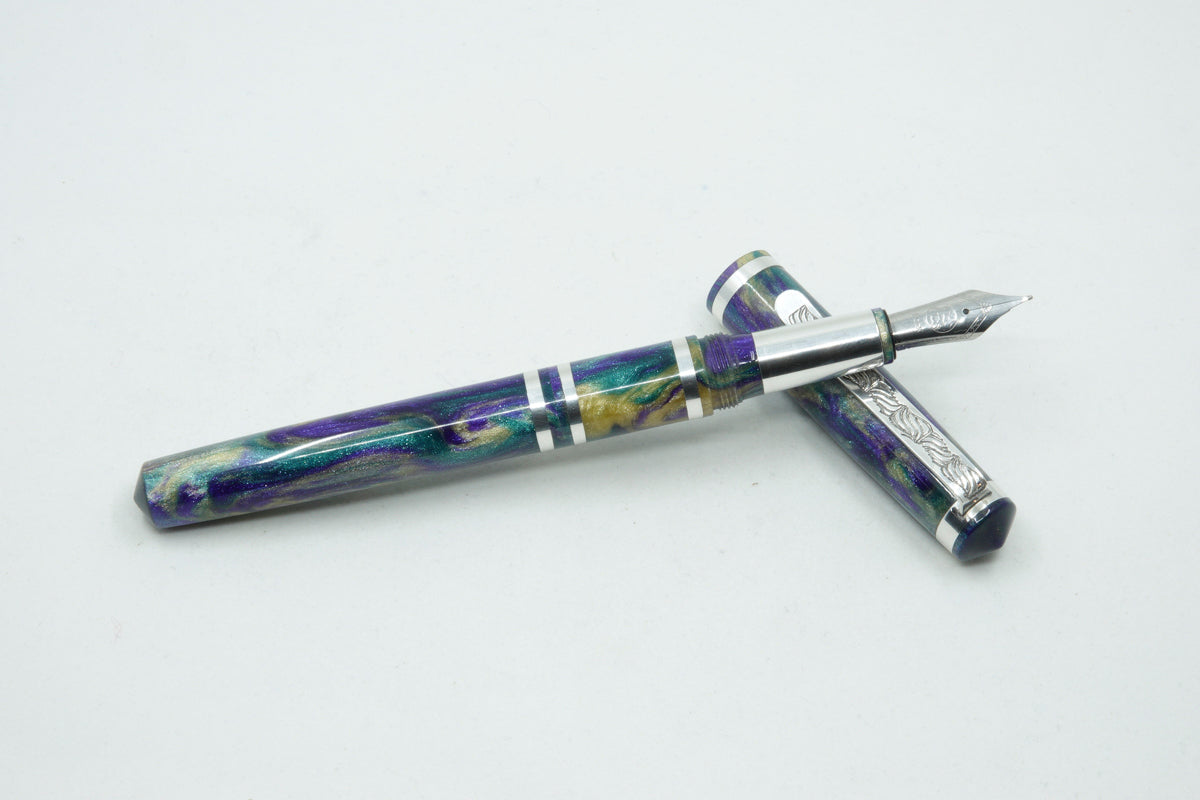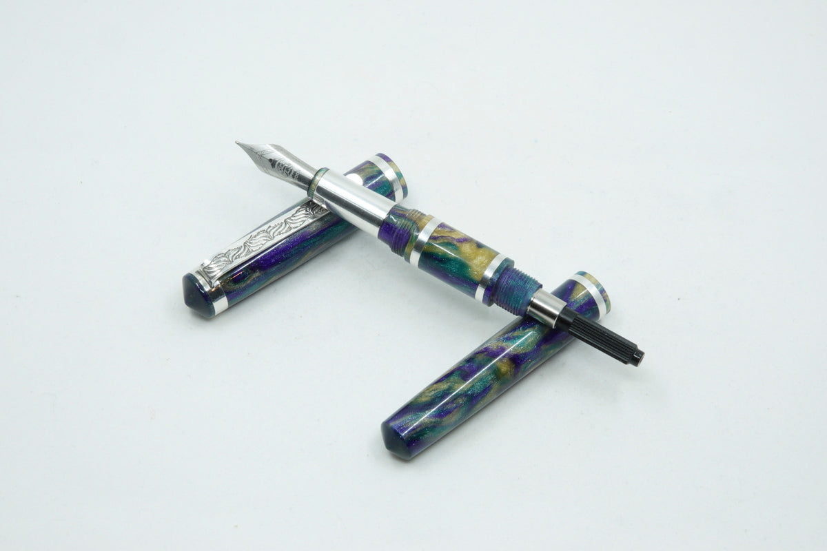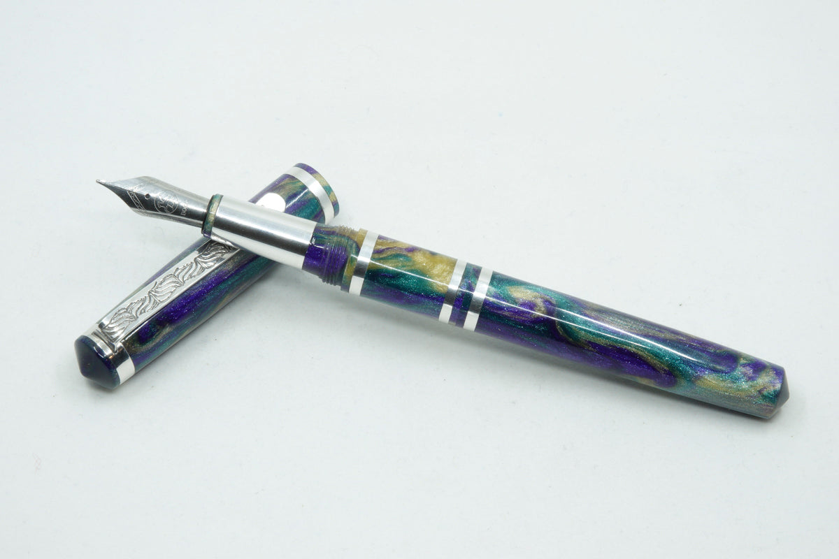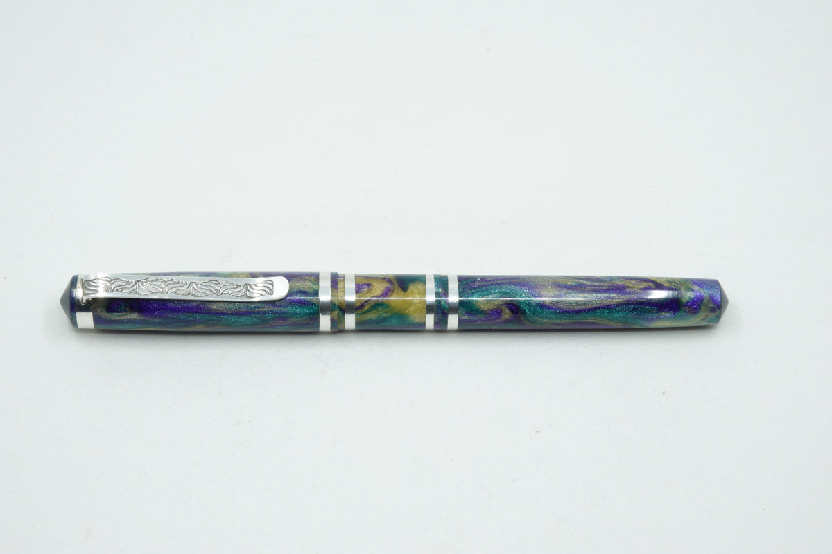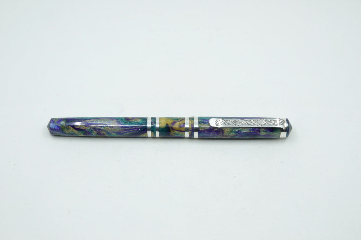 The French Quarter fountain pen is a totally unique writing instrument. It is made with Argentium silver .935, which has increased tarnish resistance, a whiter colour, antibacterial and hypoallergenic properties. The pen clip and accent rings, including the nib section, are all made from this superior silver.