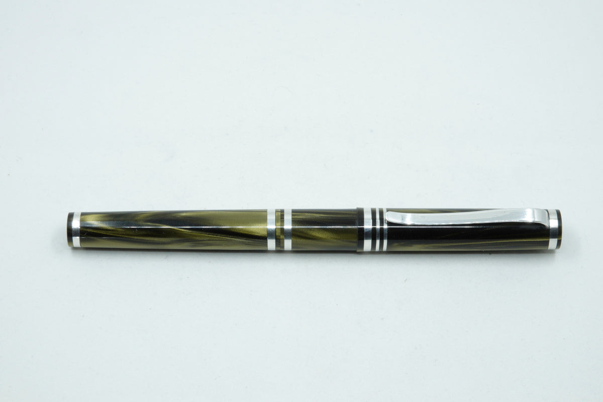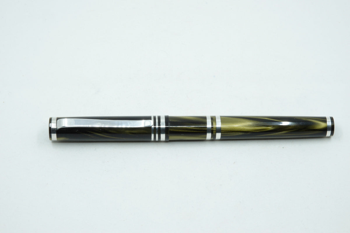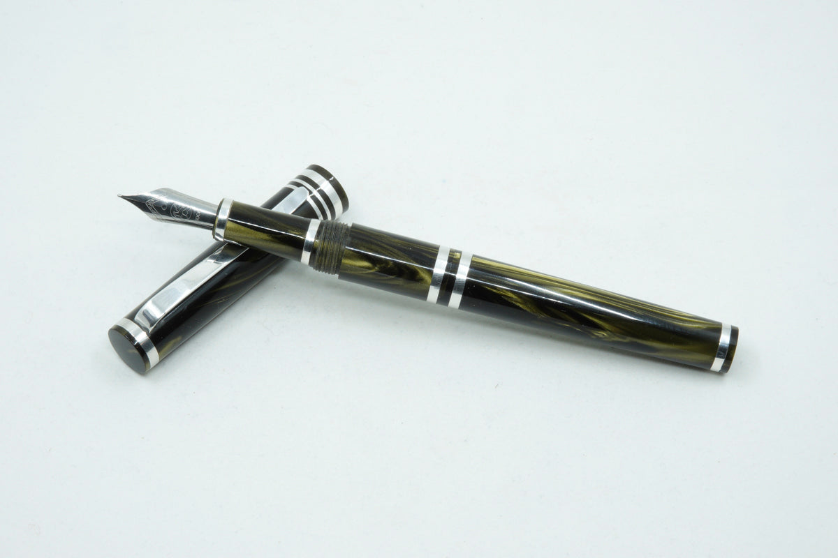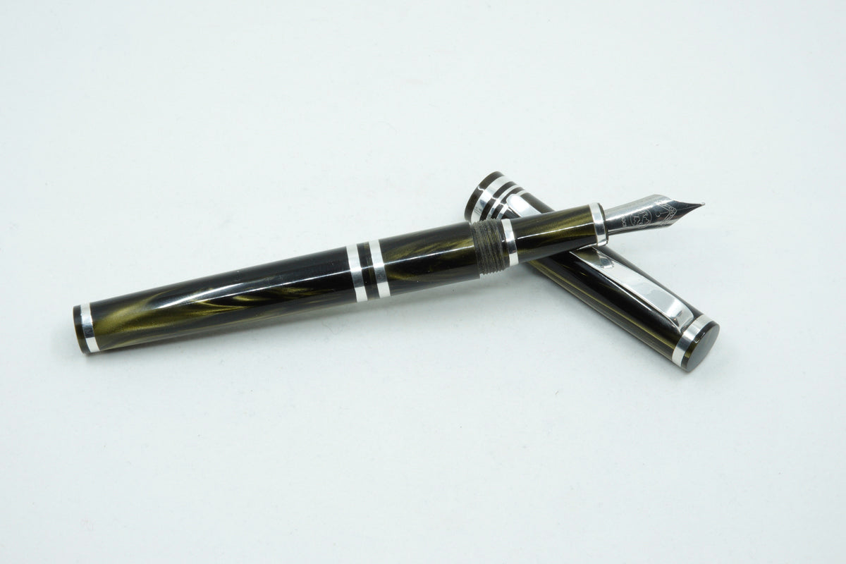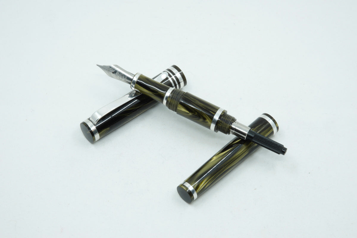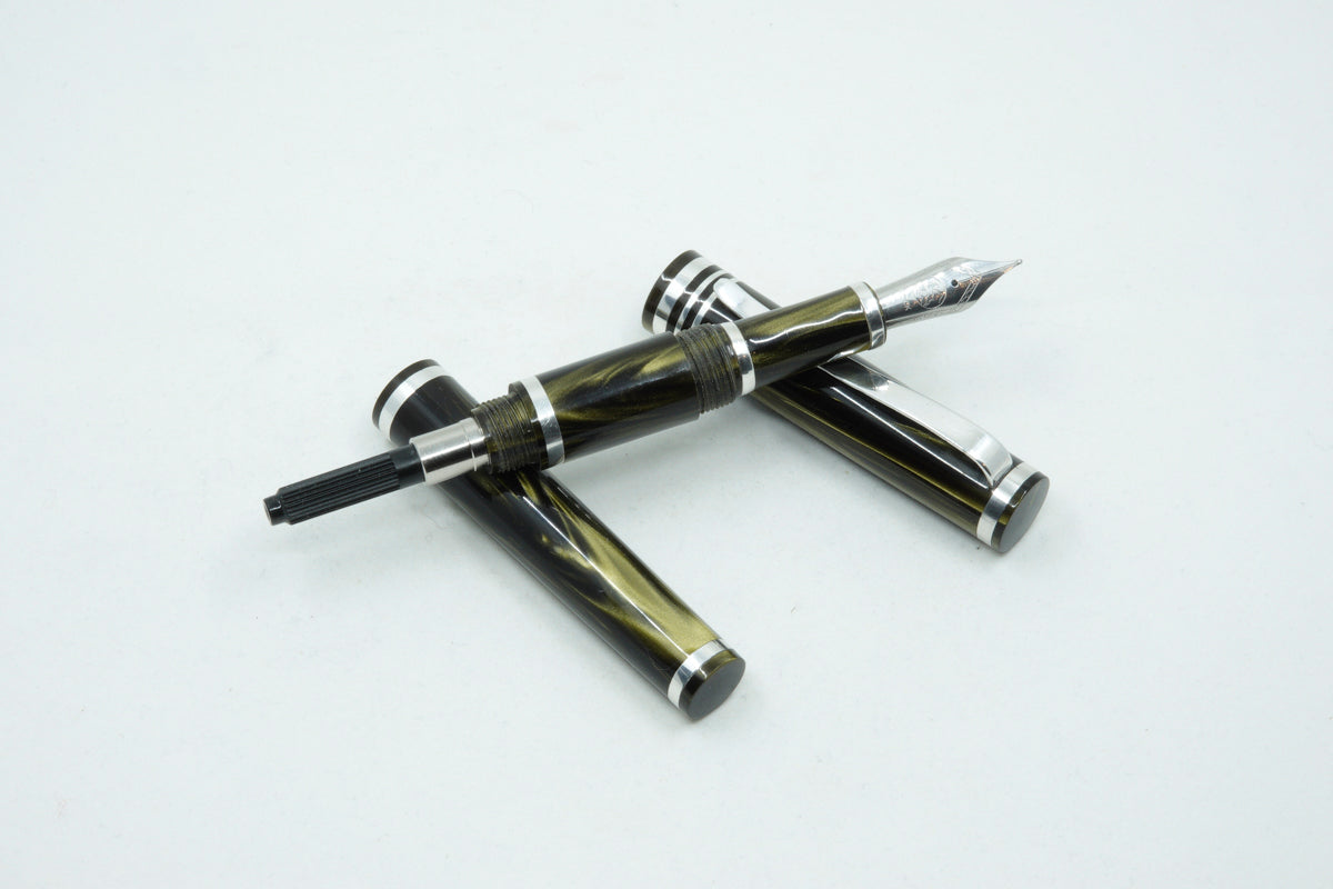 The Venom Pearl is a totally unique fountain pen made with Argentium silver .935. This superior silver has increased tarnish resistance, a whiter colour, antibacterial and hypoallergenic properties. The pen clip and accent rings including the nib section are all made from this superior silver. It features a completely new ink filling method with a very unique and practical design. Easier than removing a nib section, this pen is called the Trio pen. To fill the ink cartridge, simply unscrew the front end of the pen barrel to access the twist mechanism of the ink cartridge.
