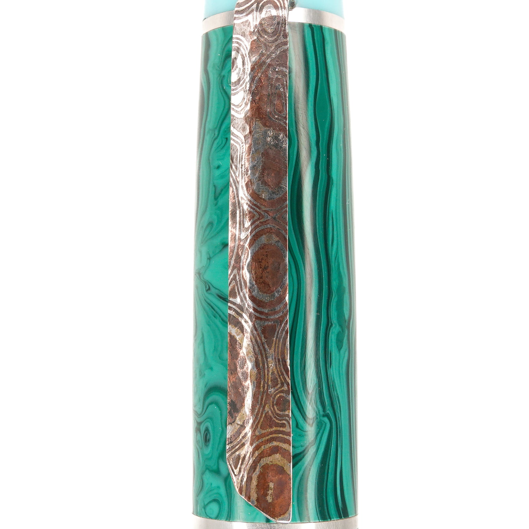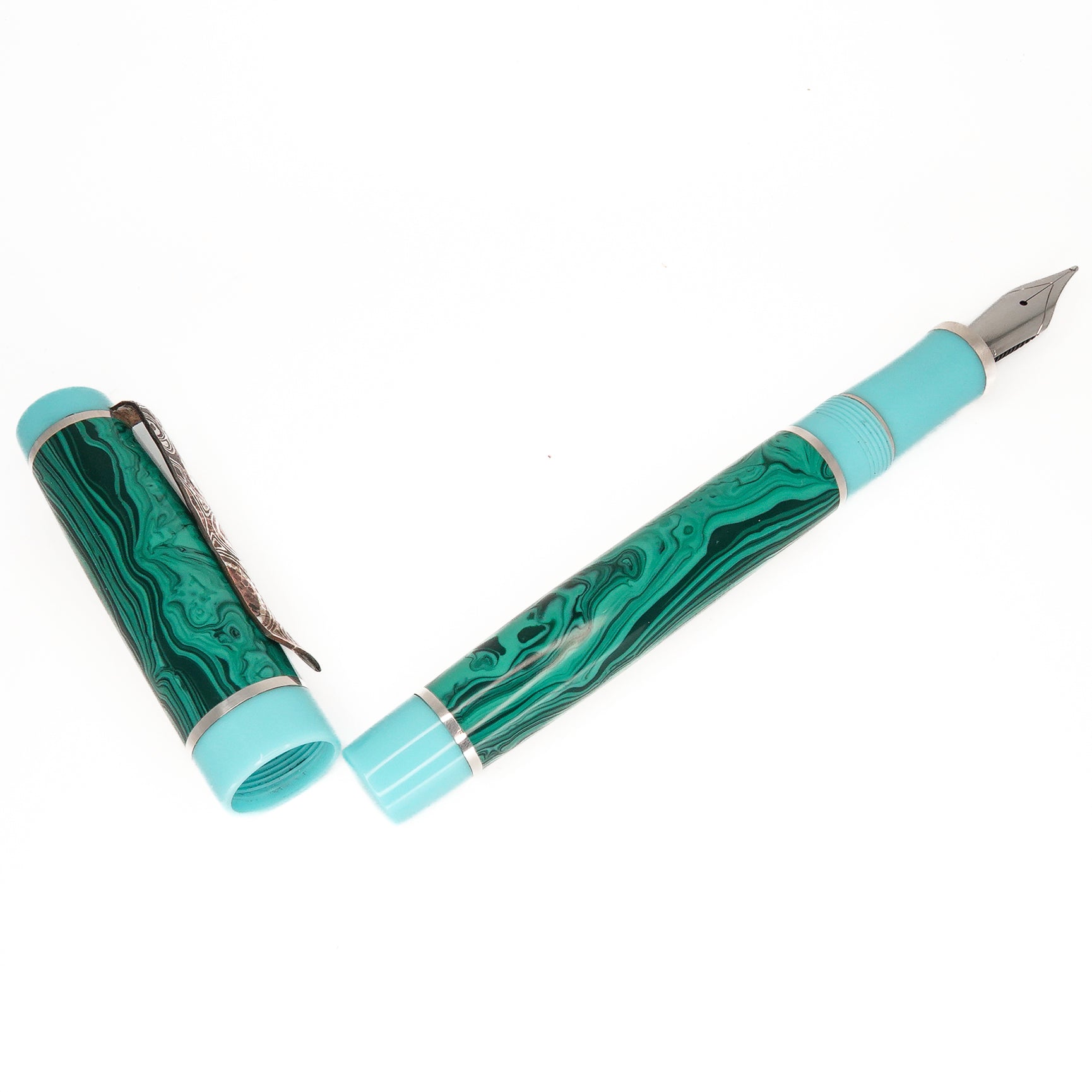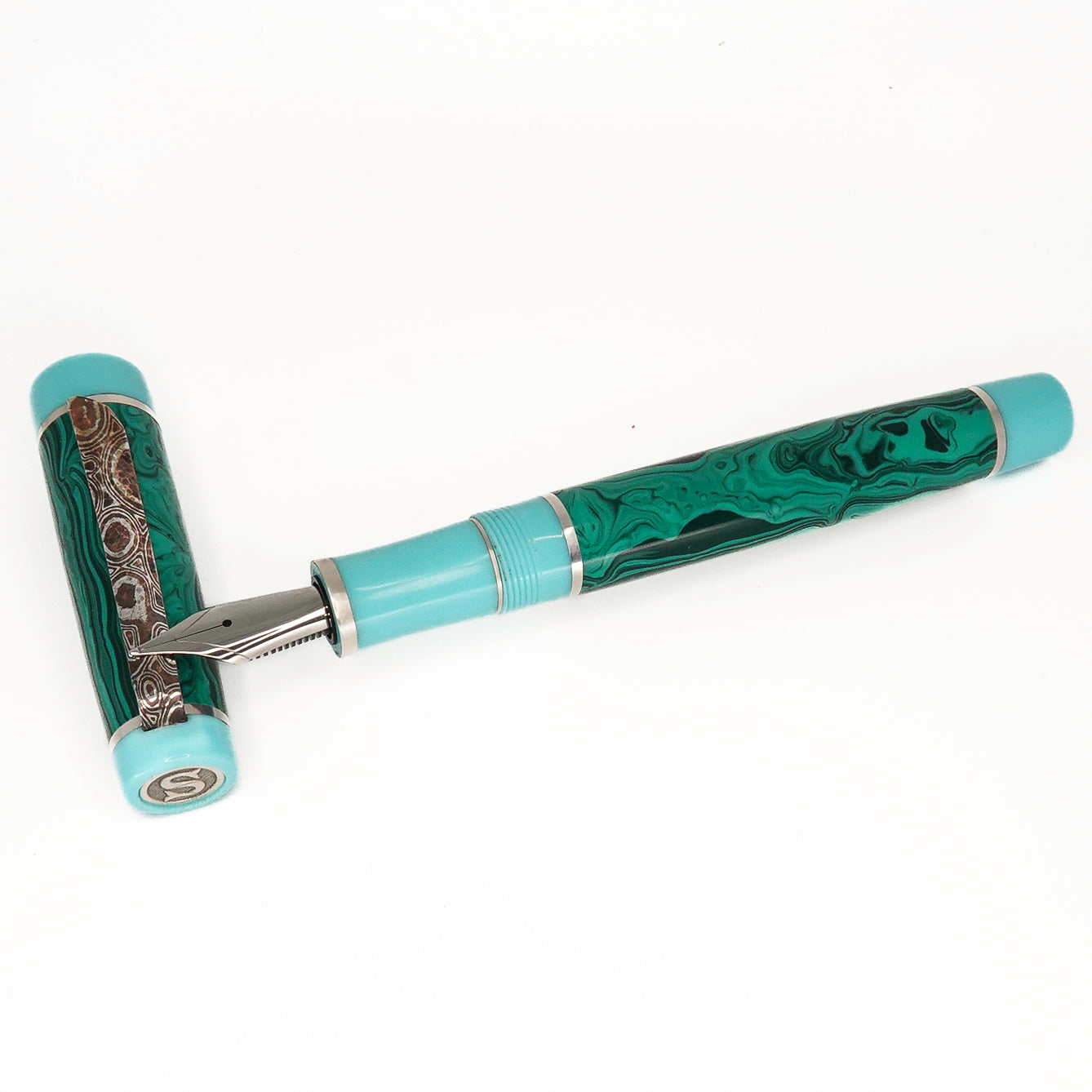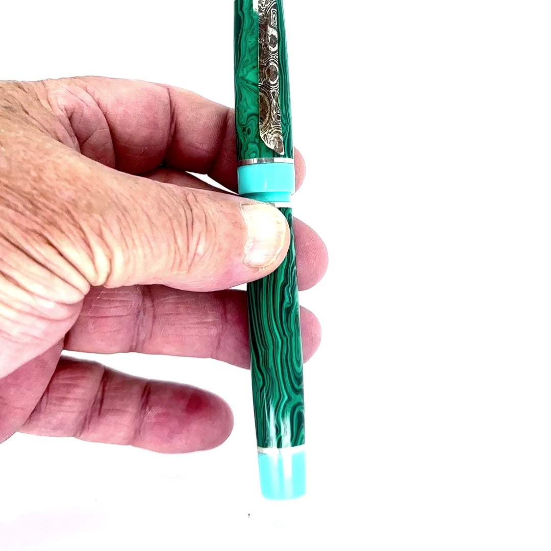True stone jade complimented with Italian acrylic in turquoise , the pocket clip is argentium Mokume gain with a hammered finish from, totally hand made by John at Silverburlpens is a totally hand crafted pen,It is fitted with a polished steel Jowo nib size 6, and comes with any nib tip size and Schmidt K5 ink converter. Other nibs are available upon request.