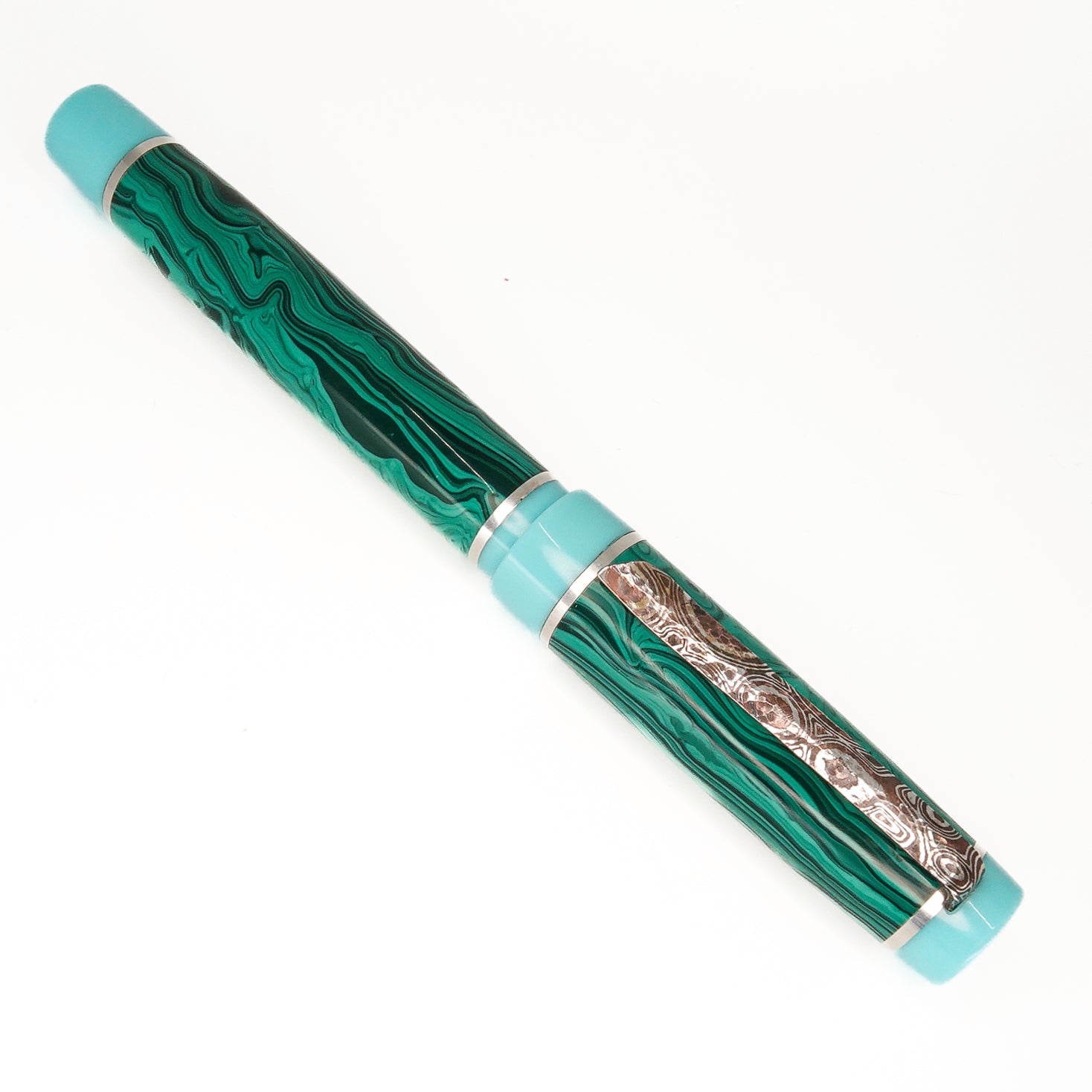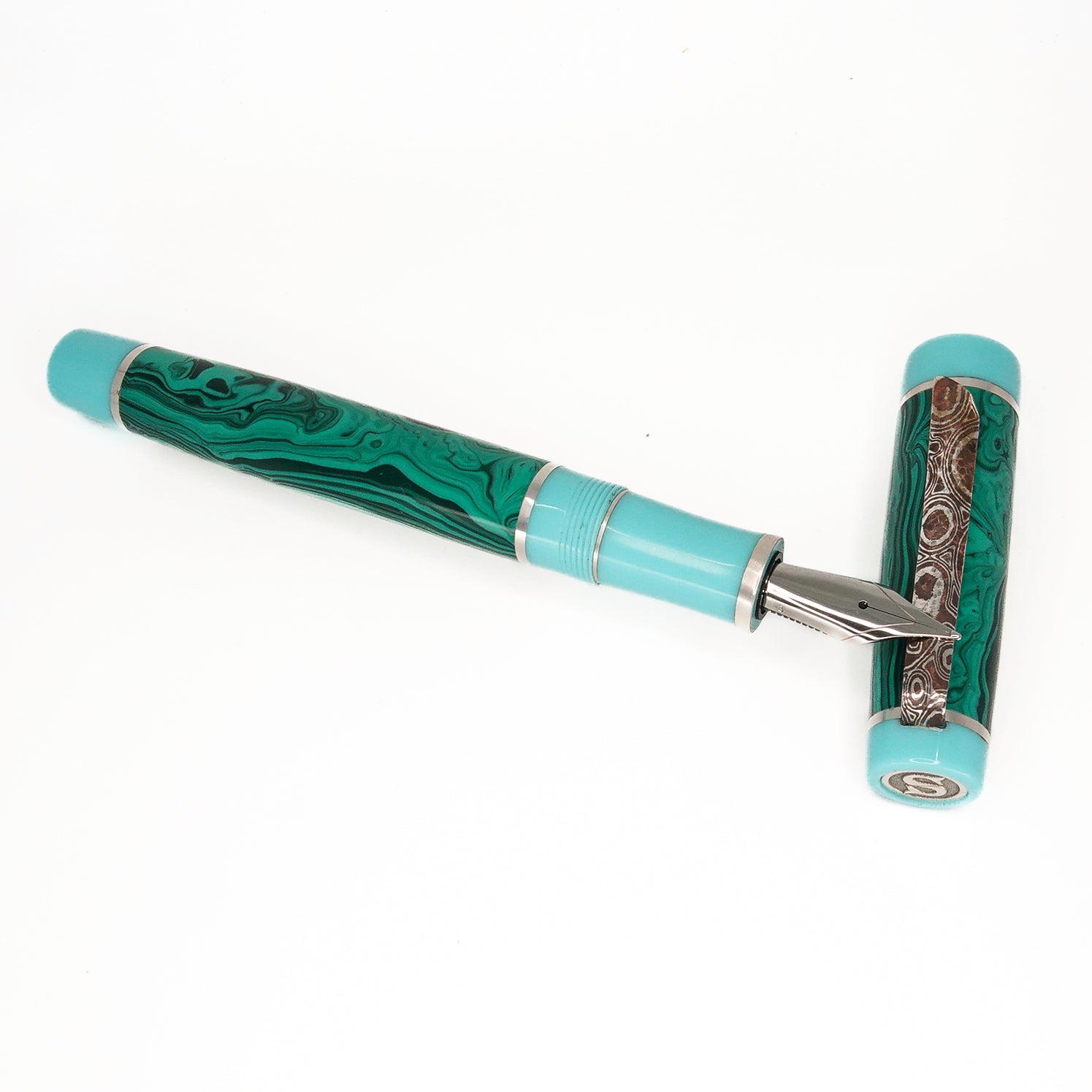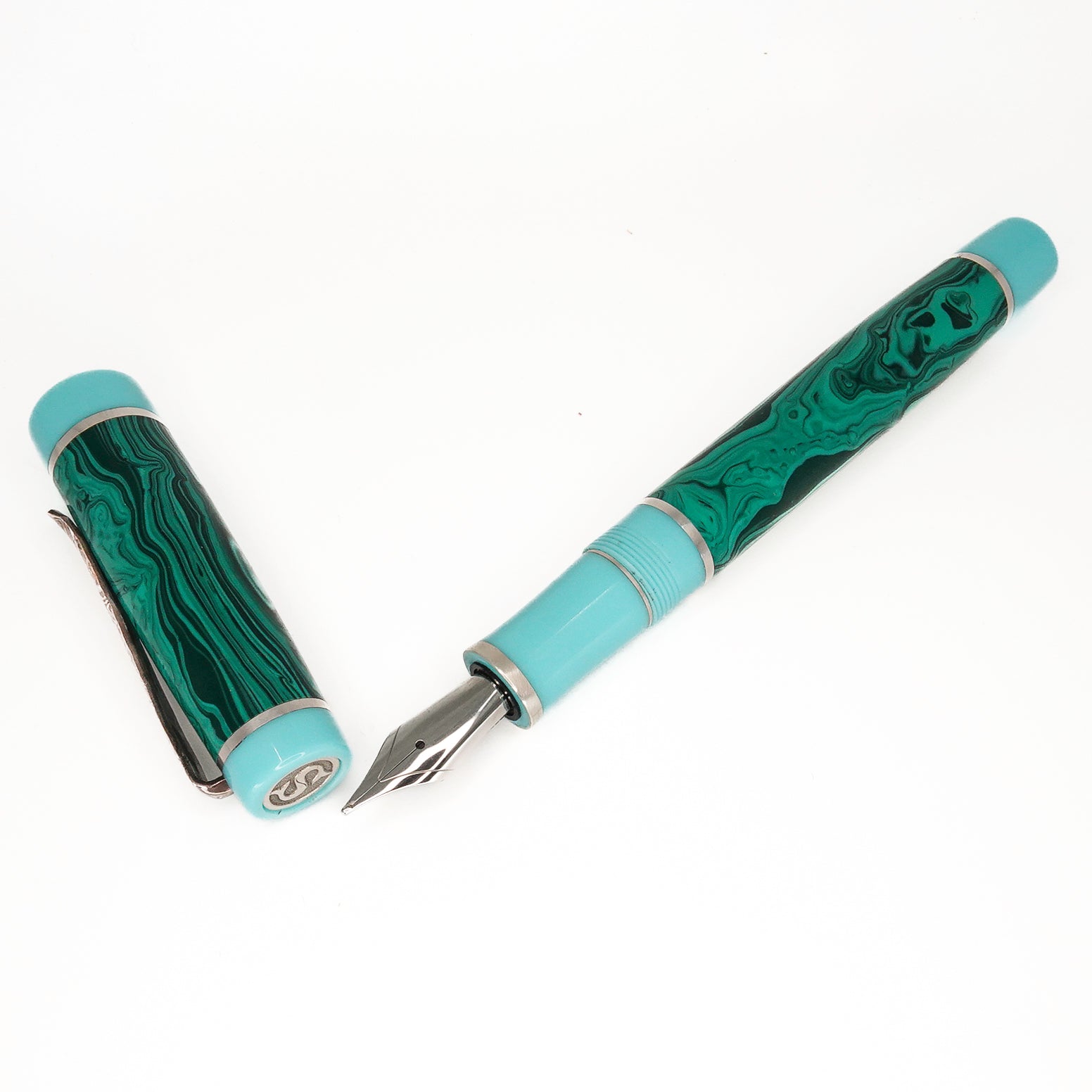 True stone jade complimented with Italian acrylic in turquoise , the pocket clip is argentium Mokume gain with a hammered finish from, totally hand made by John at Silverburlpens is a totally hand crafted pen,It is fitted with a polished steel Jowo nib size 6, and comes with any nib tip size and Schmidt K5 ink converter. Other nibs are available upon request.