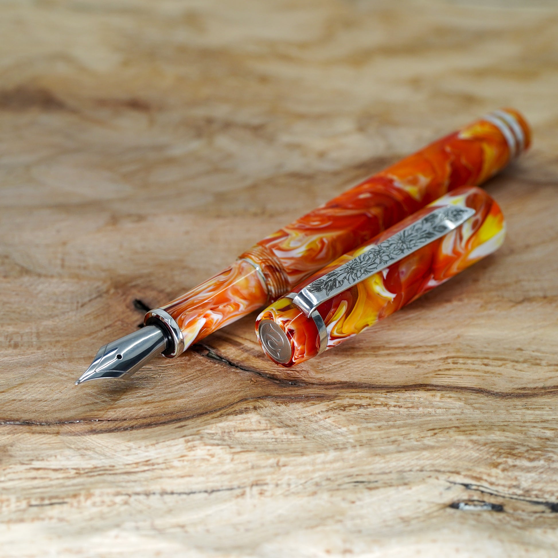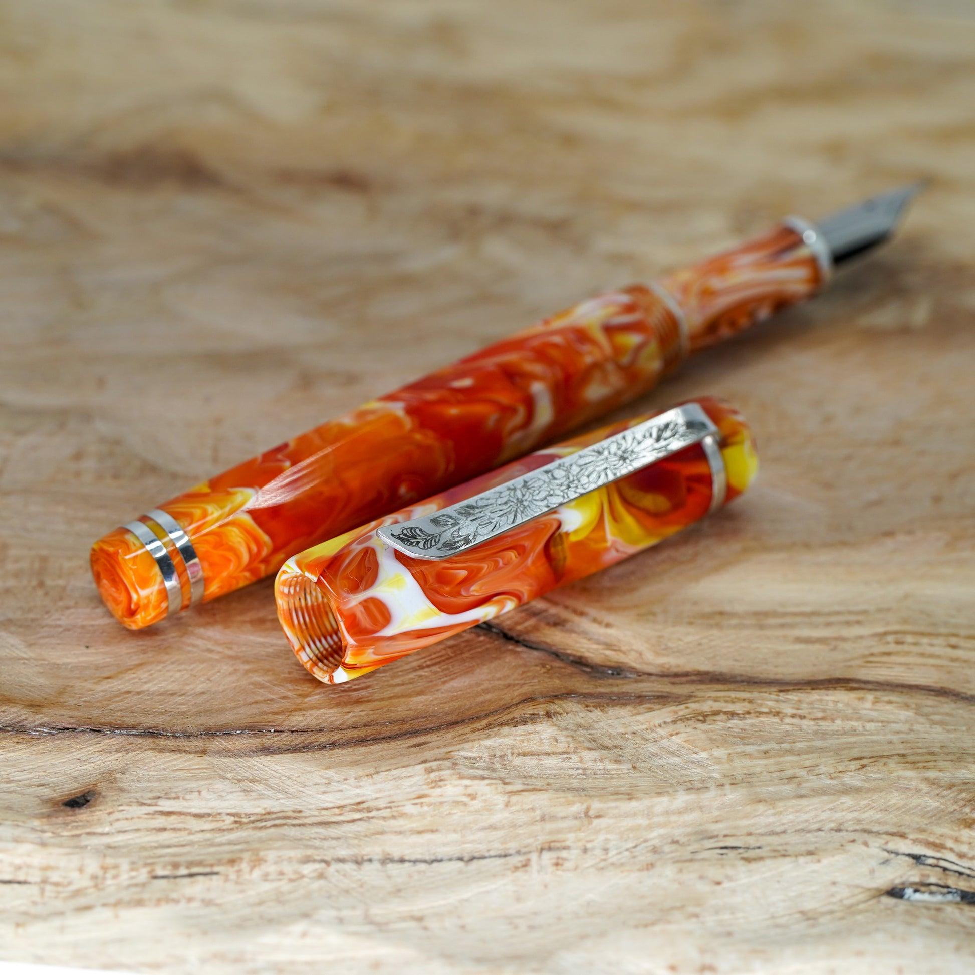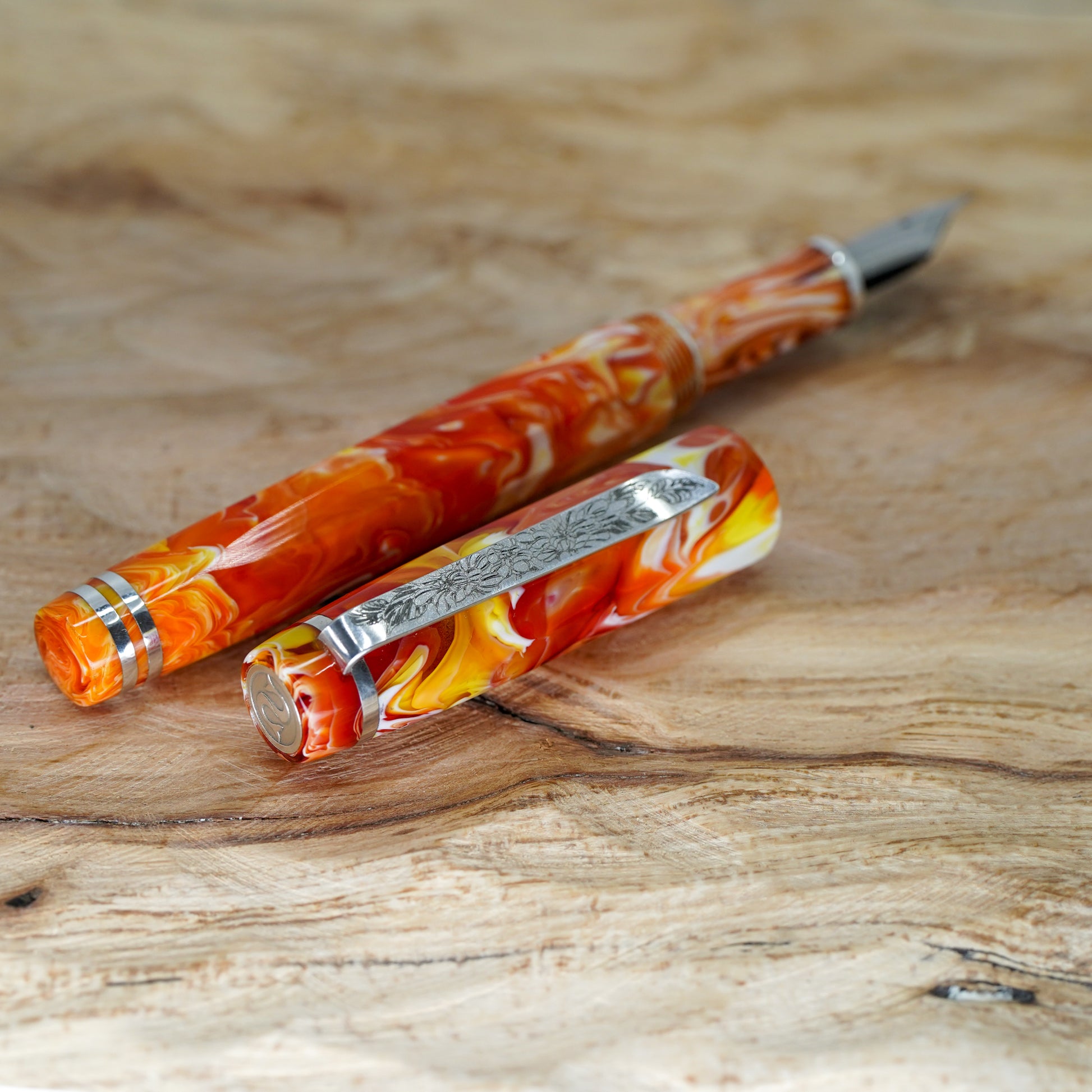 Warm Tone Nonagon fitted with a polished steel Jowo nib size 6. PEN SIZE: Approximately is 145m/m long including cap. 135m/m nib to body end. Body diameter 15m/m with a 13m/m thread. Cap diameter 16m/m. Nib make fitted is a Jowo size six polished steel medium tip other tip sizes available at no extra cost extra fine, fine, broad. The pen comes with a Schmidt K5 ink converter. Other nibs are available; please contact john@silverburlpens.com to discuss alternatives and prices. I`ll be pleased to offer advice. A totally hand crafted pen including all the silver work.