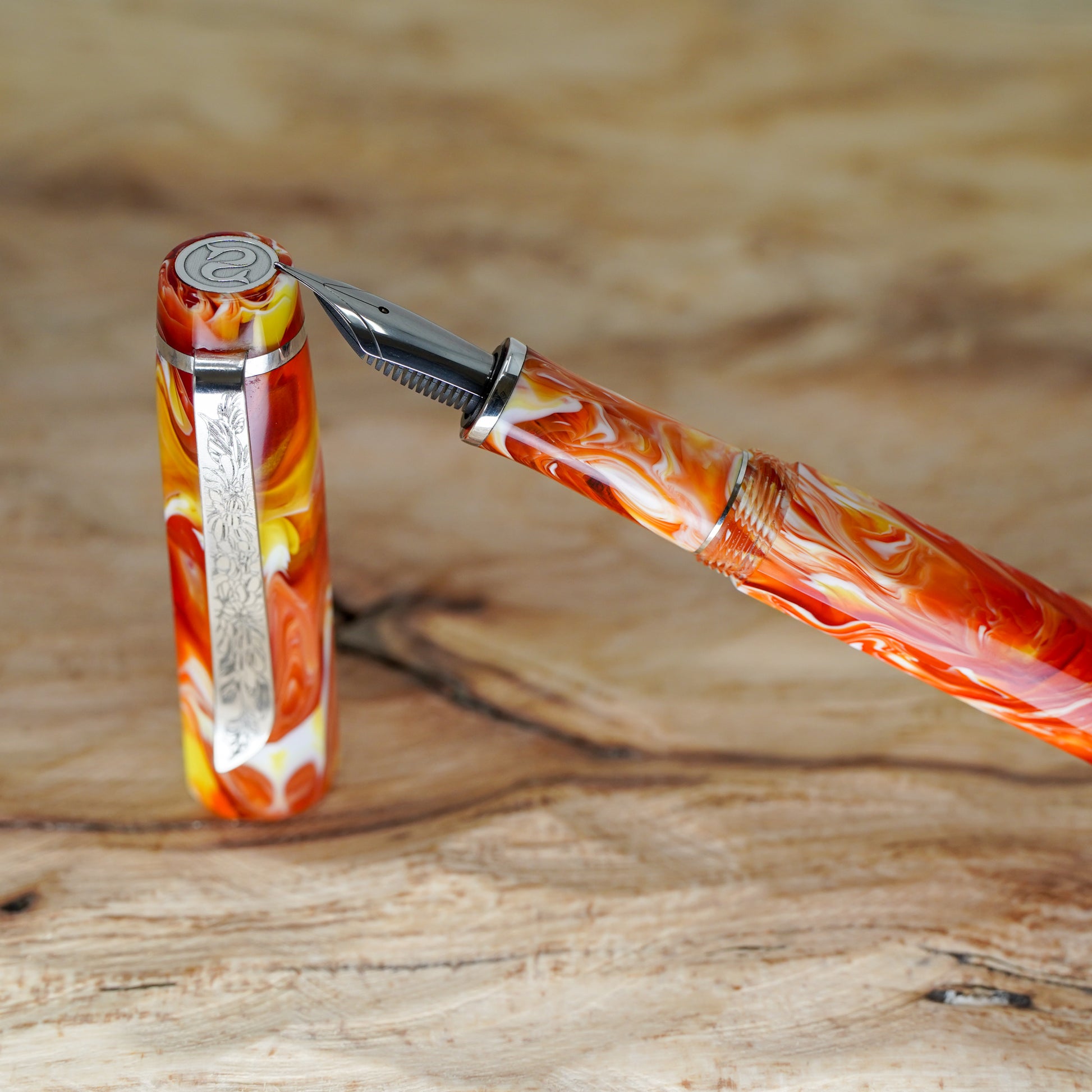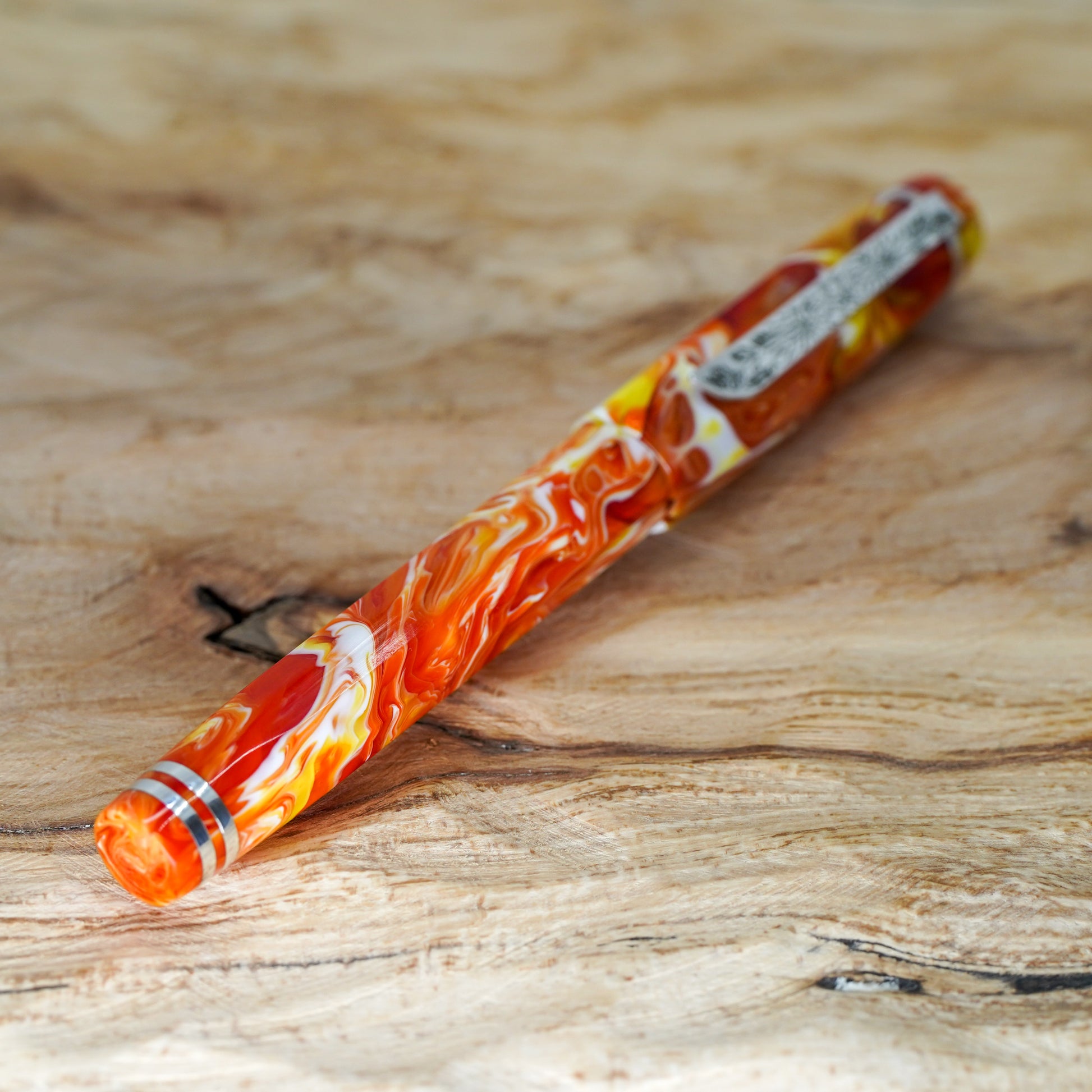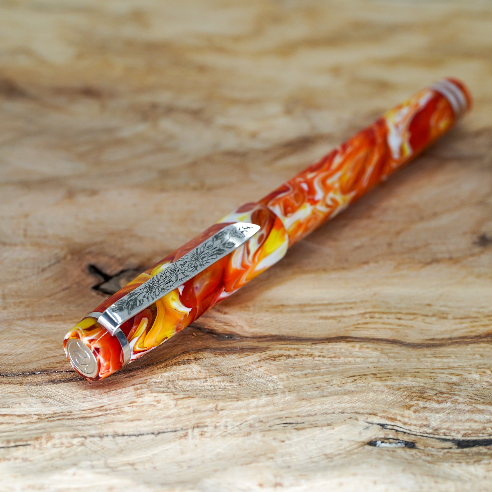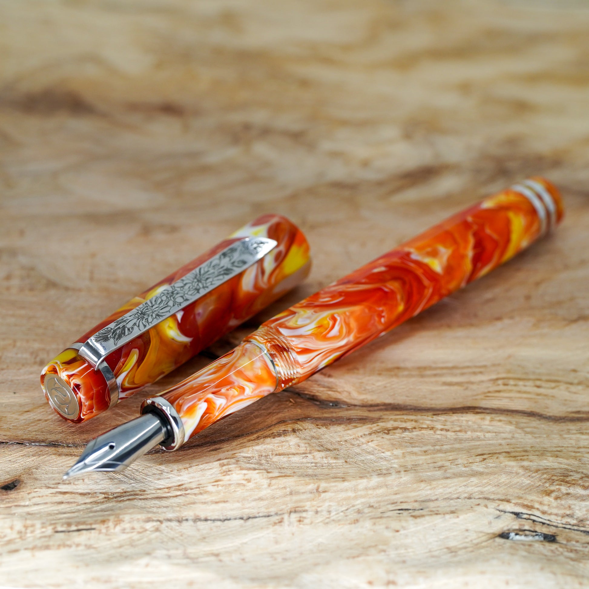 Warm Tone Nonagon fitted with a polished steel Jowo nib size 6. PEN SIZE: Approximately is 145m/m long including cap. 135m/m nib to body end. Body diameter 15m/m with a 13m/m thread. Cap diameter 16m/m. Nib make fitted is a Jowo size six polished steel medium tip other tip sizes available at no extra cost extra fine, fine, broad. The pen comes with a Schmidt K5 ink converter. Other nibs are available; please contact john@silverburlpens.com to discuss alternatives and prices. I`ll be pleased to offer advice. A totally hand crafted pen including all the silver work.