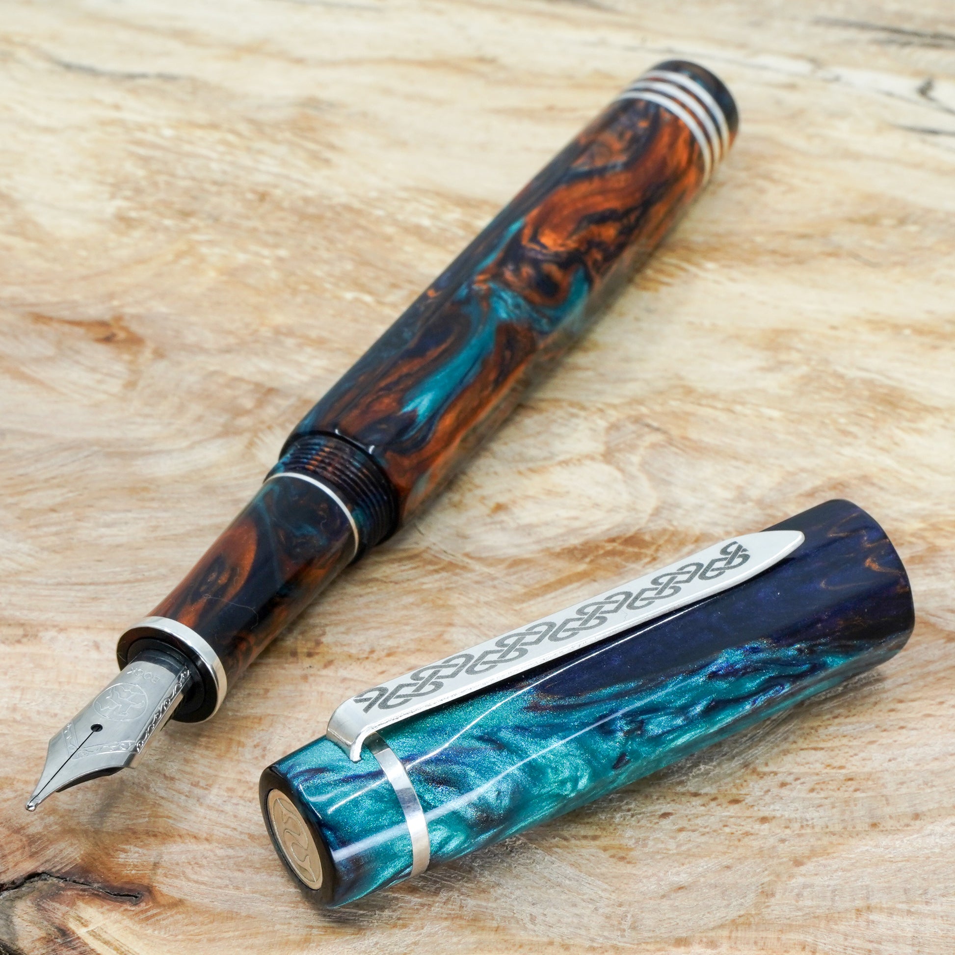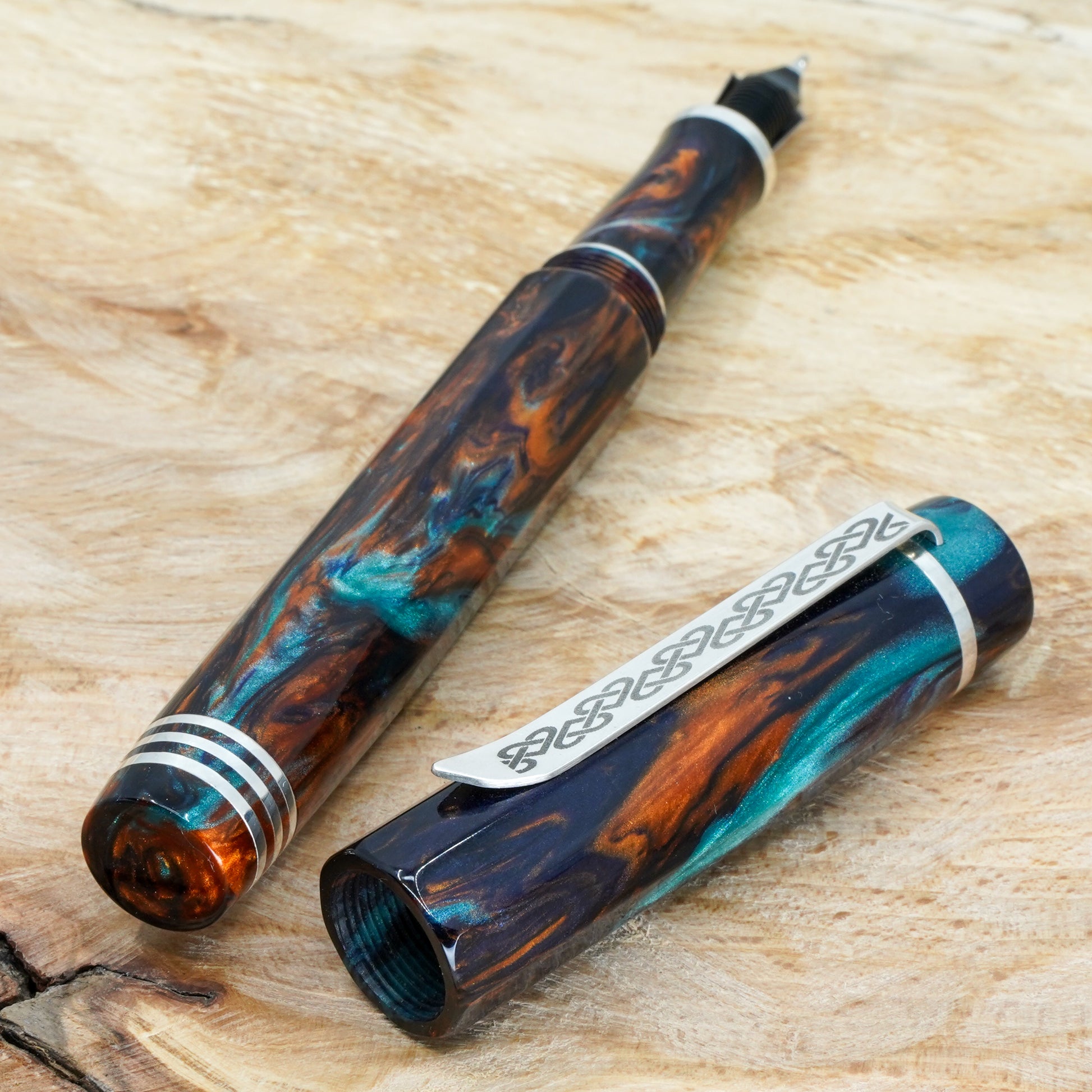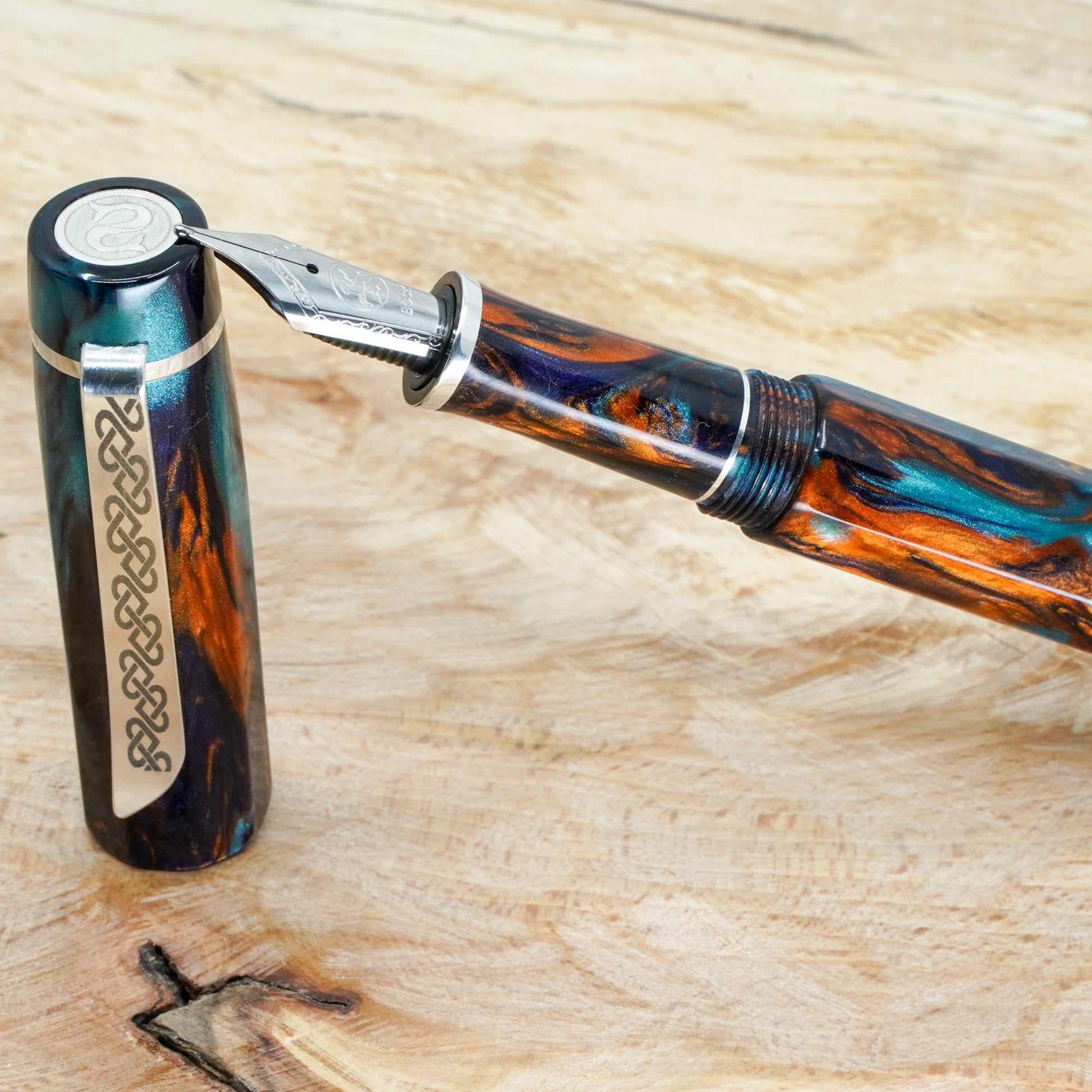 Bohemian Twilight Nonagon is a totally hand crafted pen fitted with a polished steel Bock nib size 6. It is approximately 145m/m long including cap and 135m/m nib to body end, with a body diameter of 15m/m and a cap diameter of 16m/m. The pen comes with any nib tip size and Schmidt K5 ink converter, other nib options available. The silver used is Argentium .940, whiter and brighter than traditional .925 sterling and much more tarnish resistant. Argentium Silver is hypoallergenic and has antibacterial properties, and does not contain nickel.