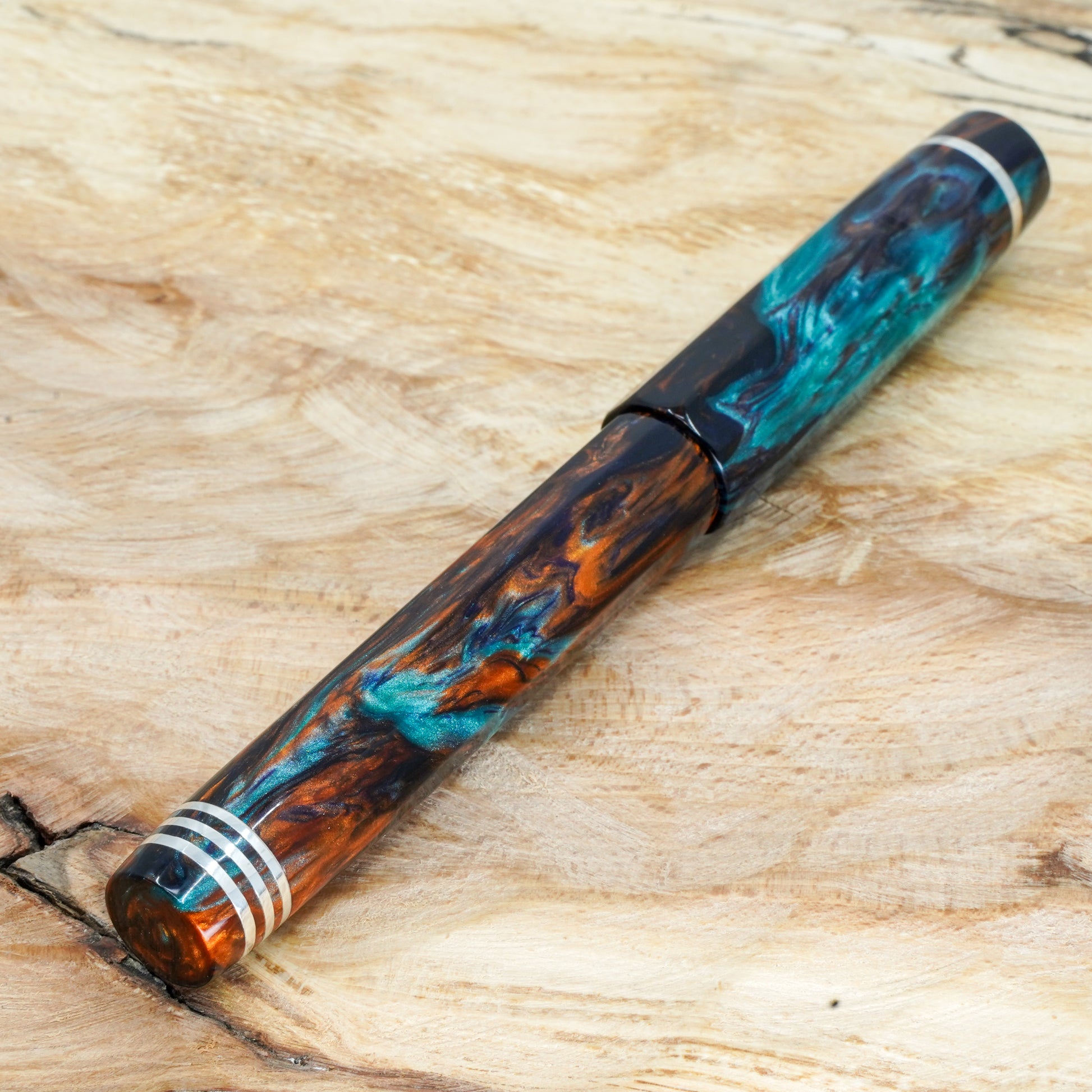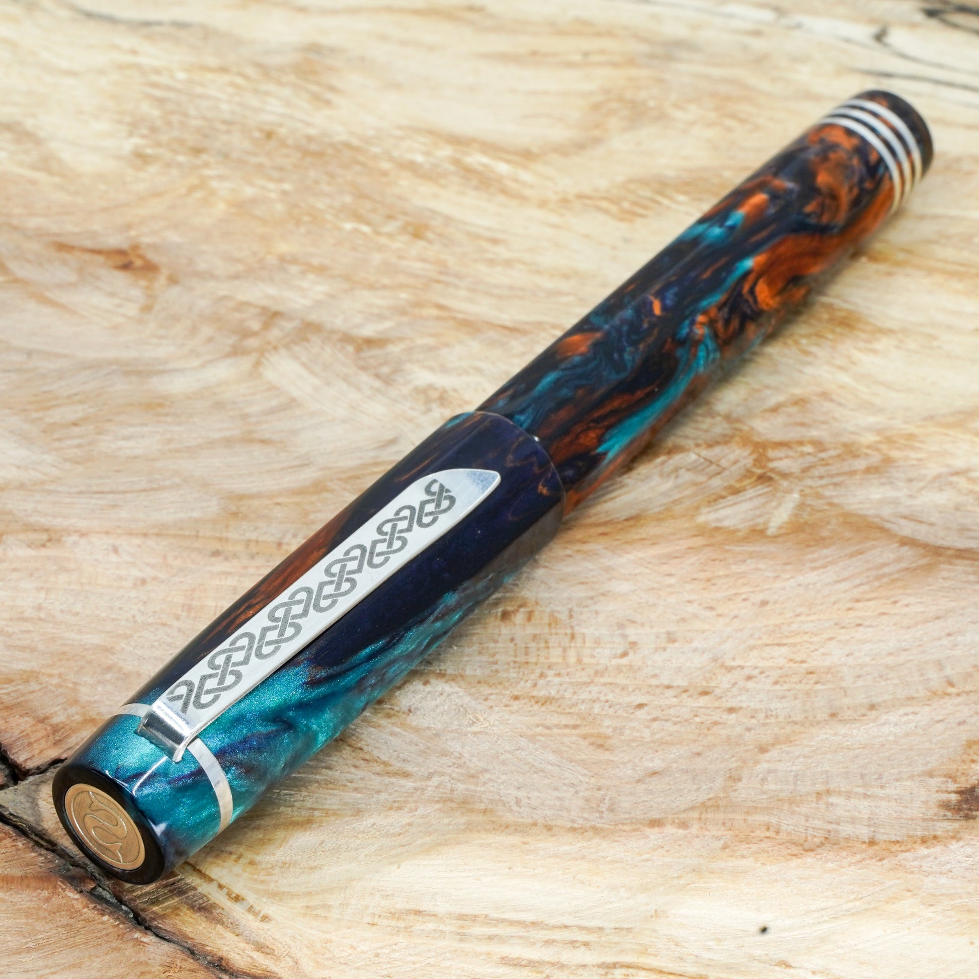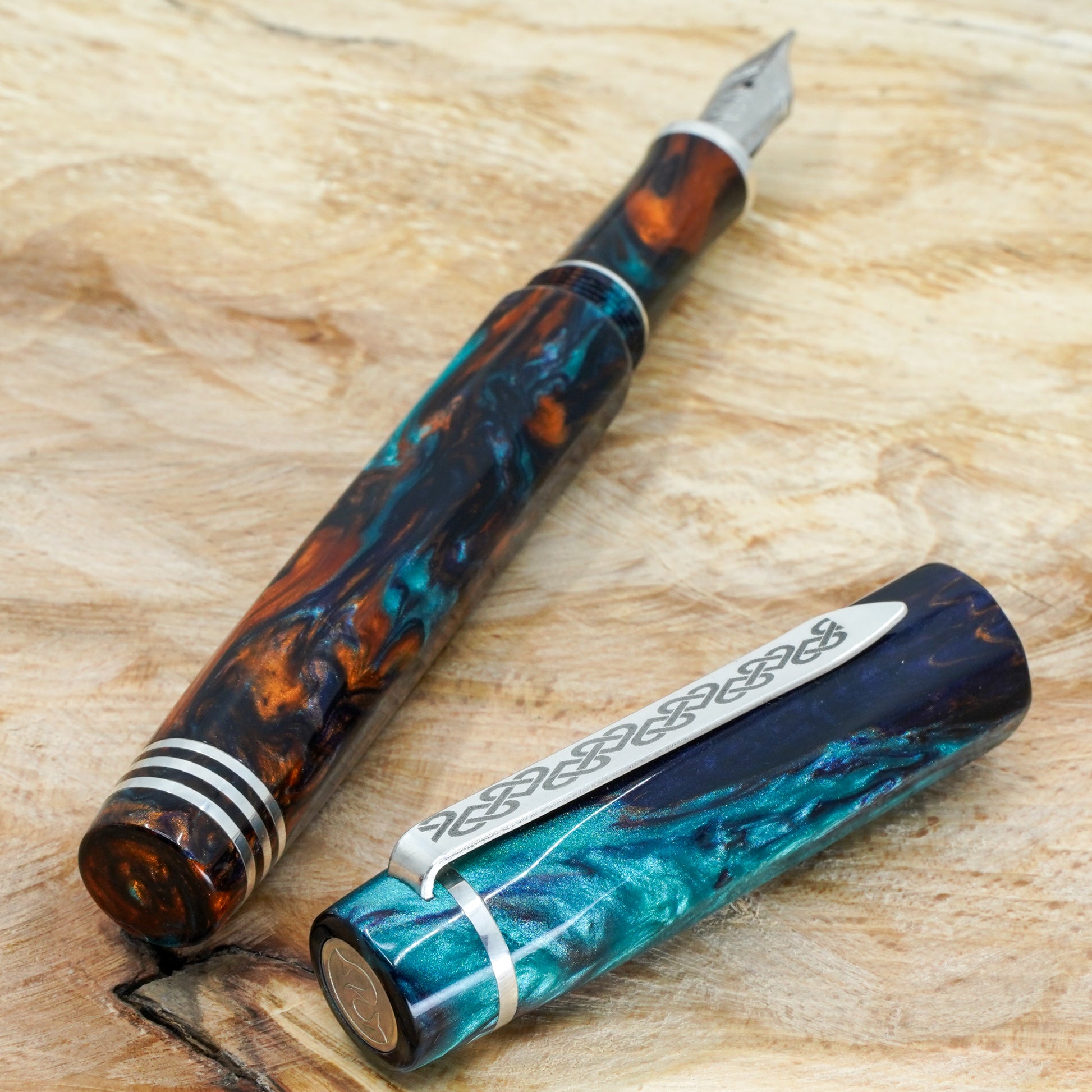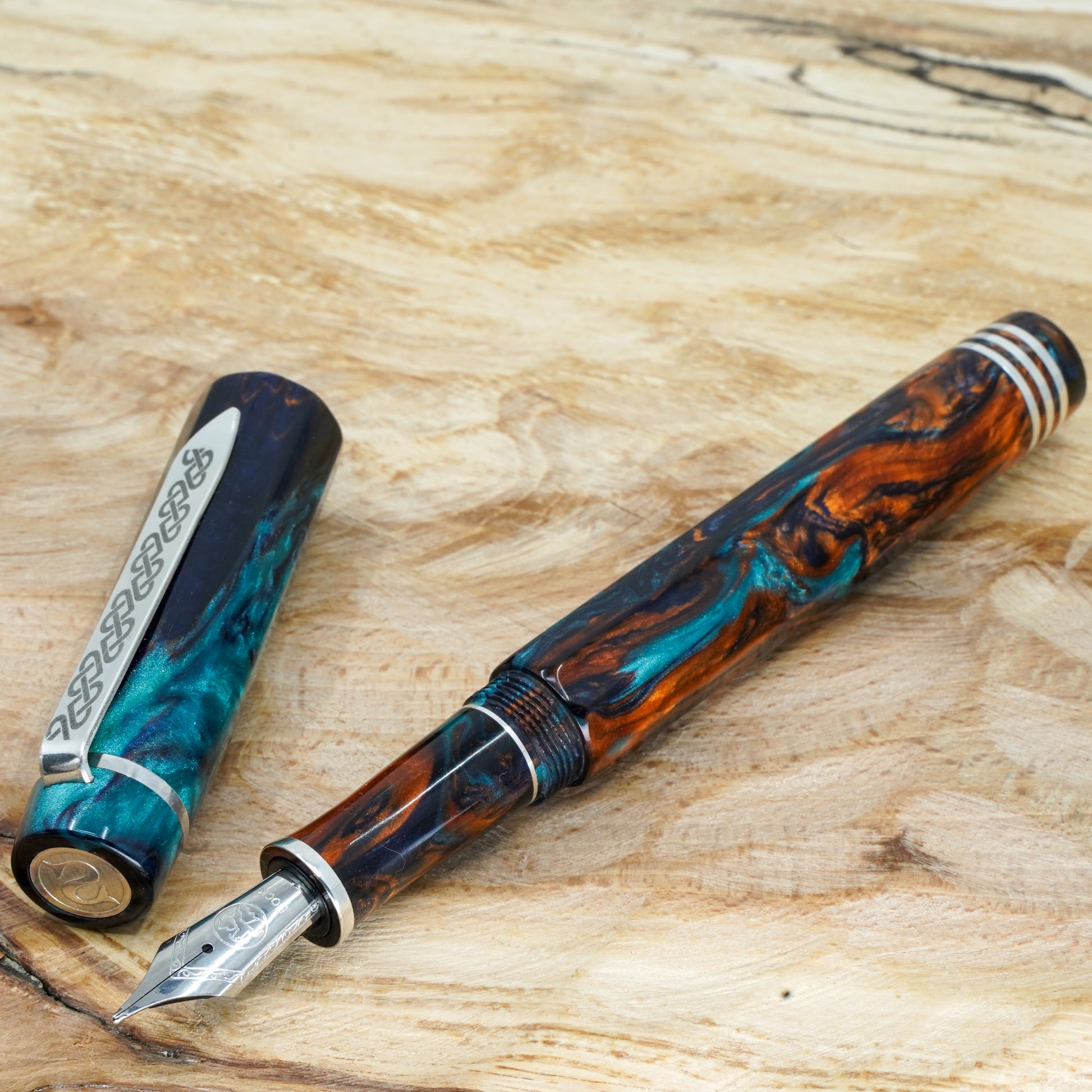 Bohemian Twilight Nonagon is a totally hand crafted pen fitted with a polished steel Bock nib size 6. It is approximately 145m/m long including cap and 135m/m nib to body end, with a body diameter of 15m/m and a cap diameter of 16m/m. The pen comes with any nib tip size and Schmidt K5 ink converter, other nib options available. The silver used is Argentium .940, whiter and brighter than traditional .925 sterling and much more tarnish resistant. Argentium Silver is hypoallergenic and has antibacterial properties, and does not contain nickel.