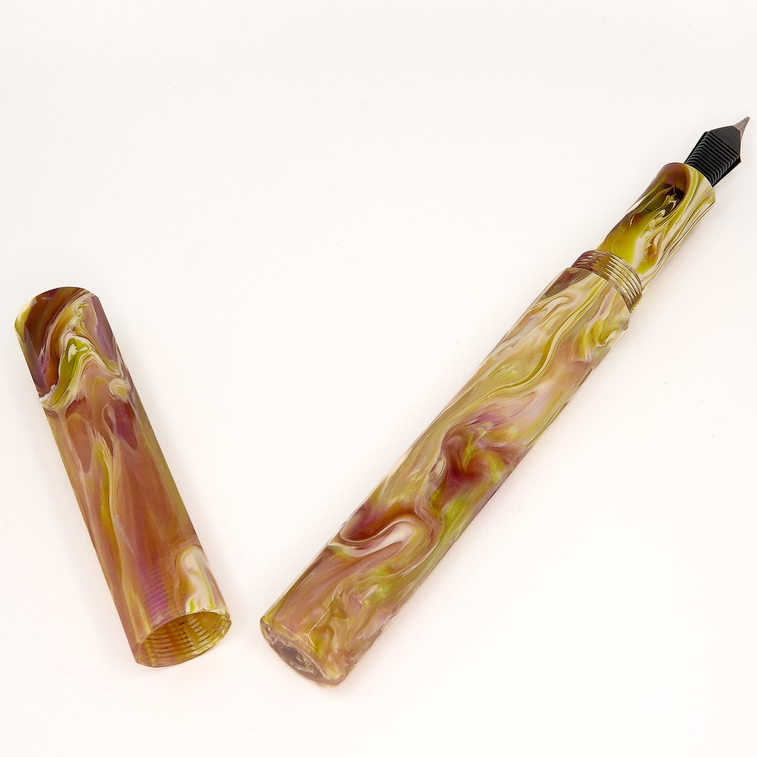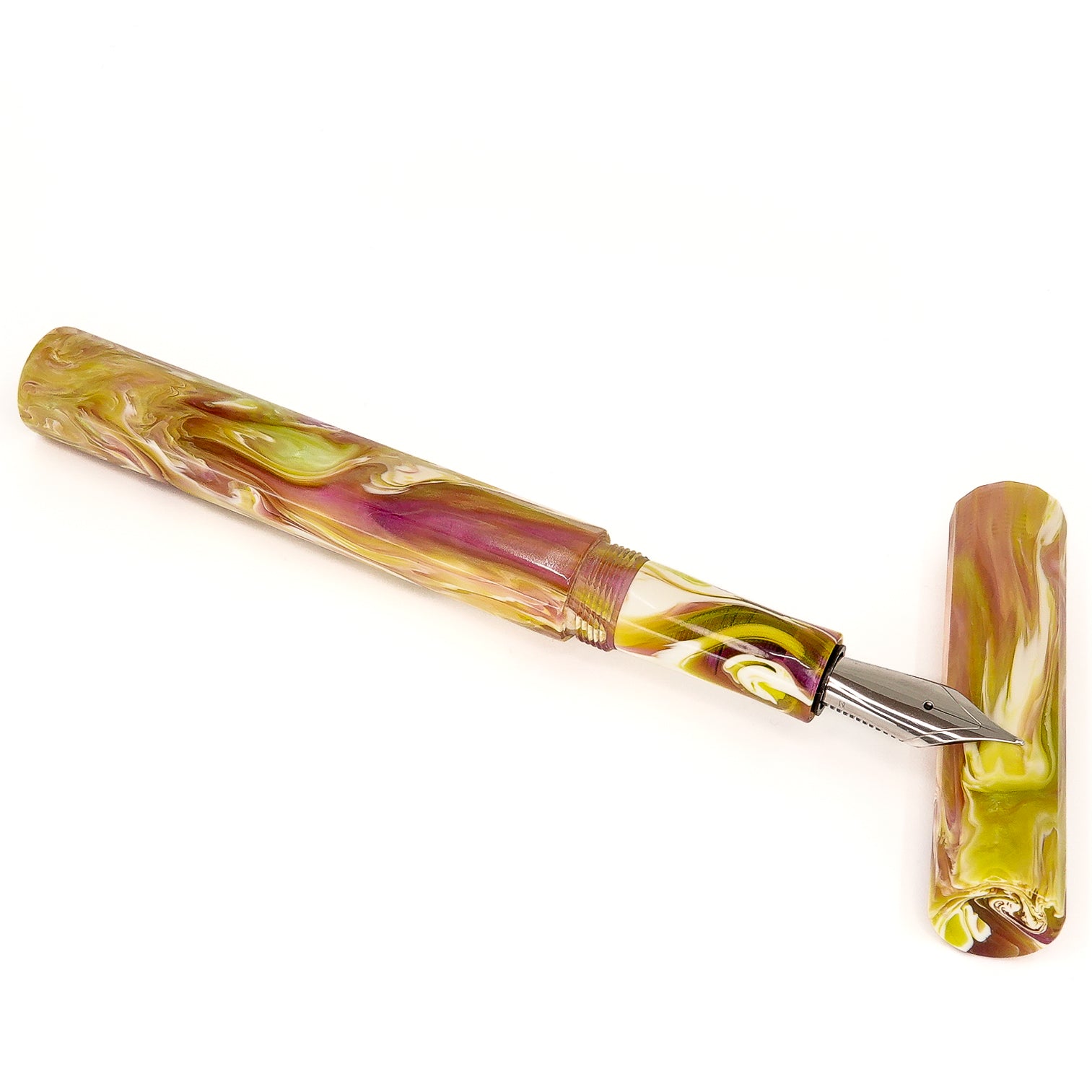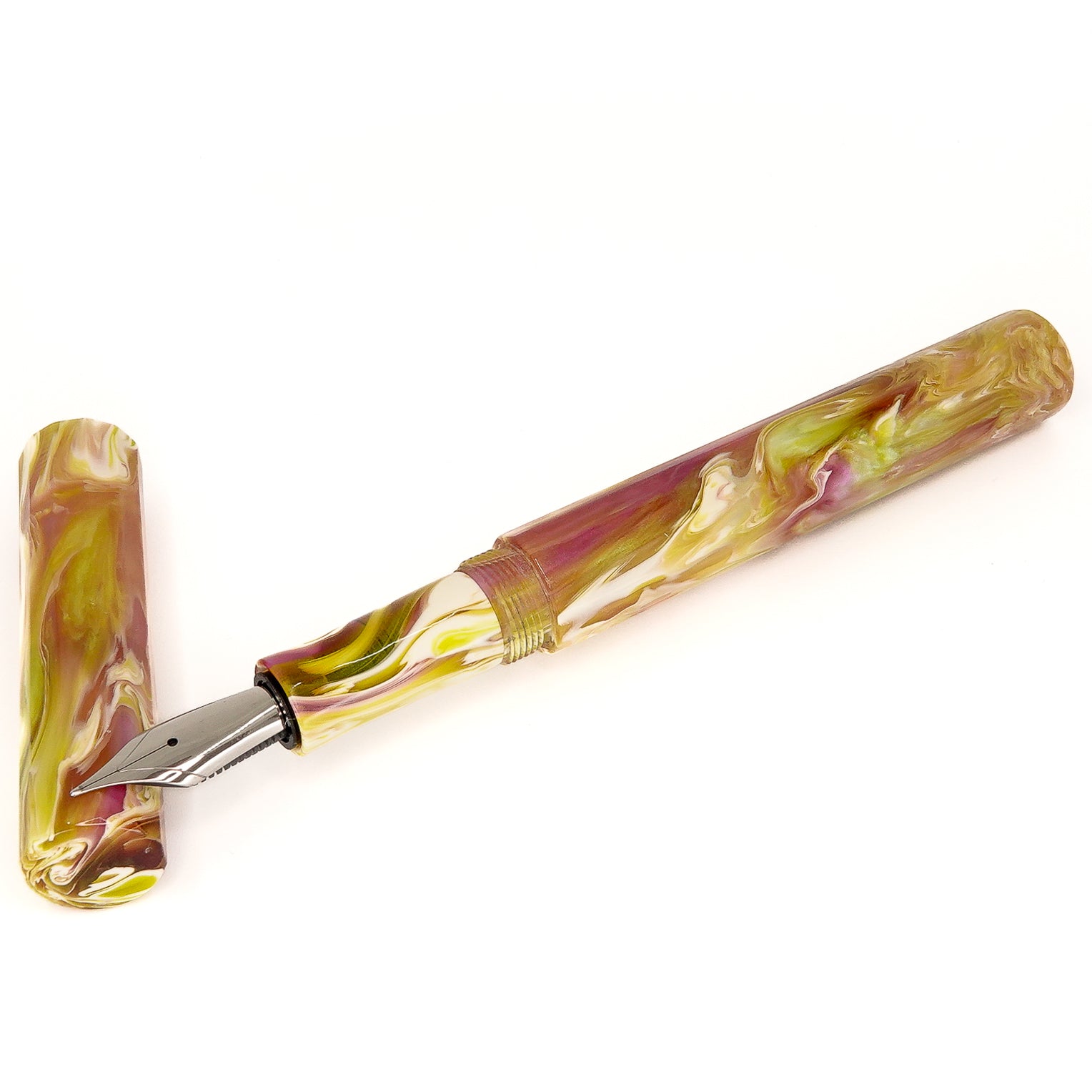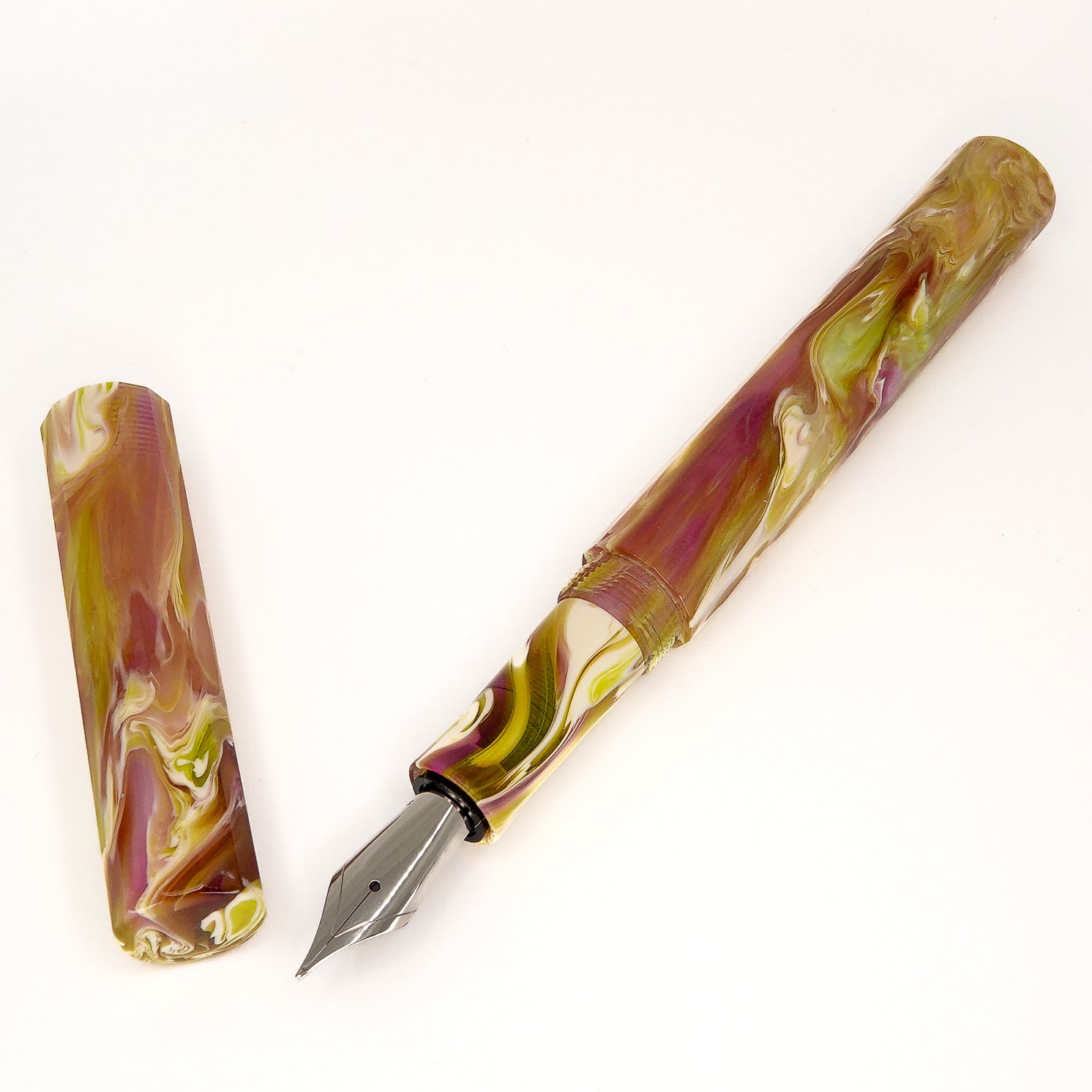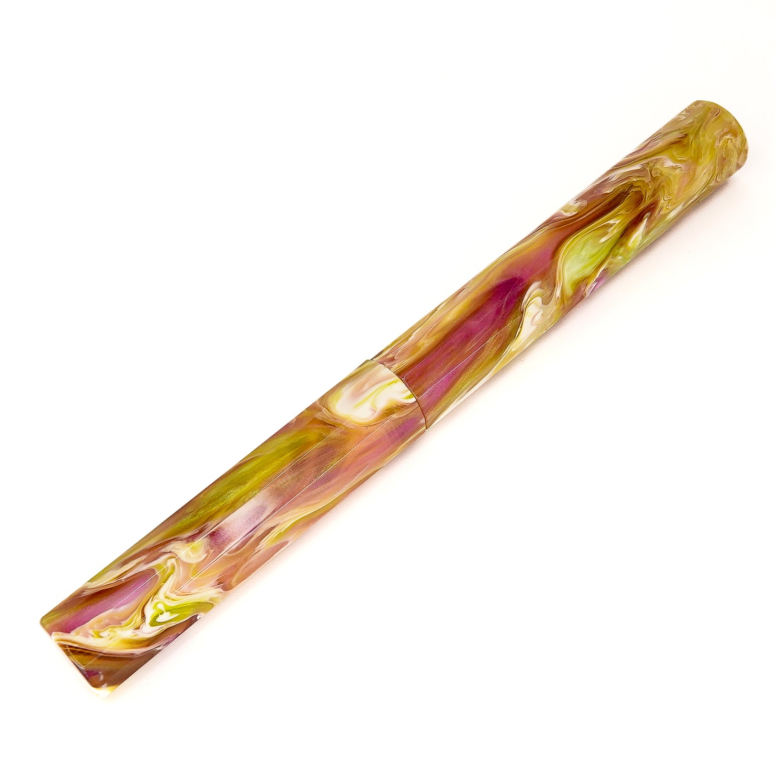 Water Lily Koi Dodecagon 12 sided pen, fitted with a size six Jowo nib and Schmidt K5 ink converter. Comes as standard with a polished steel nib, your choice of tip size. Other nibs are available; please contact john@silverburlpens.com to discuss alternatives and prices. I`ll be pleased to offer advice.