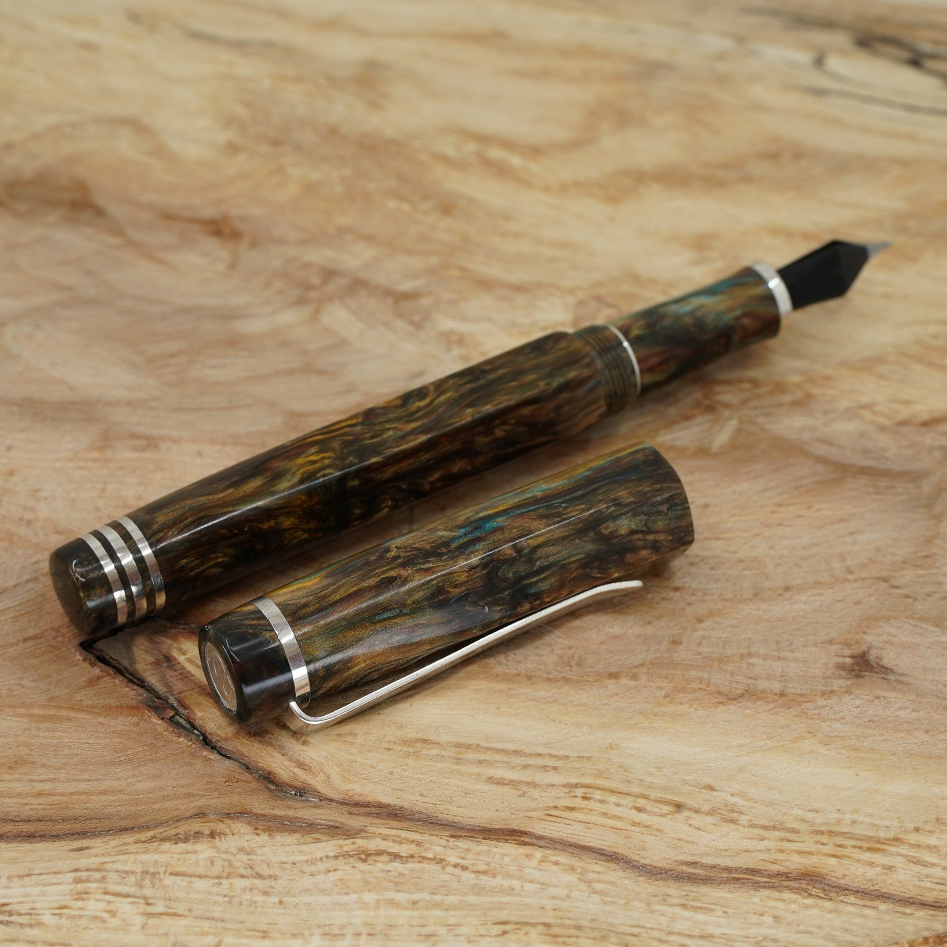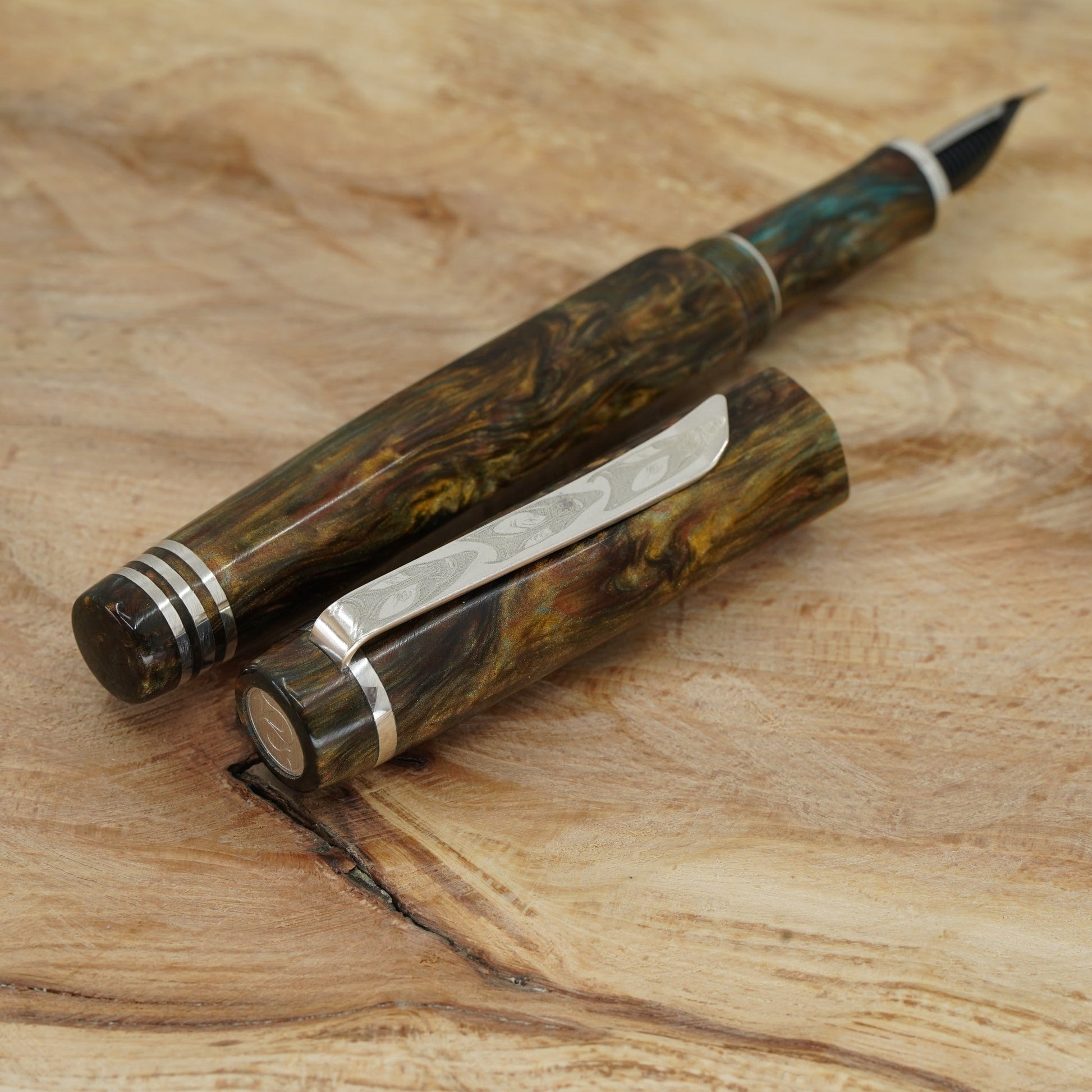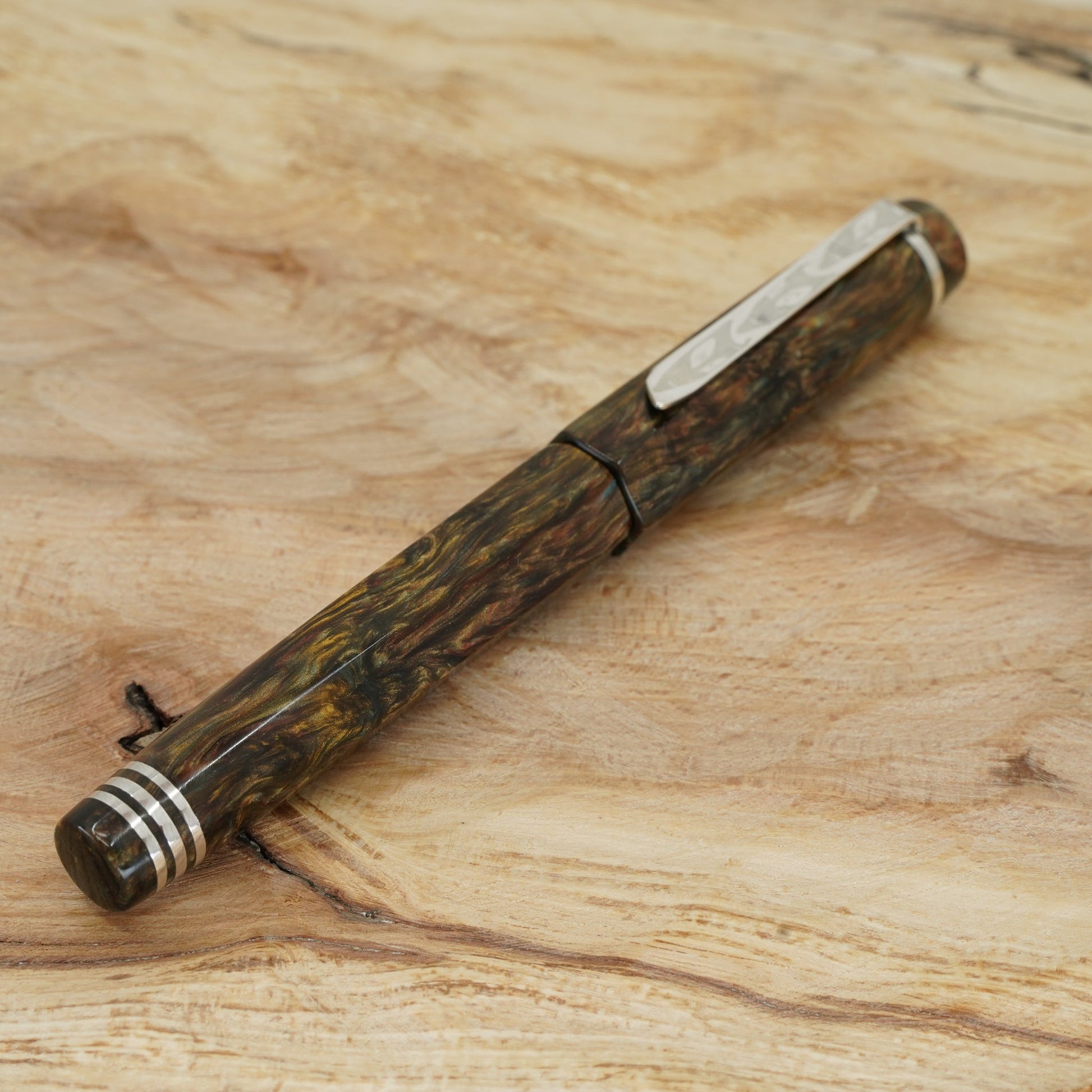 Introducing the Water Lily Koi, a totally hand crafted pen from Silverburlpens.com. Forged Patina Hexagon with complimentary finials, fitted with a polished steel Jowo nib size 6. PEN SIZE: Approximately is 145m/m long including cap. 135m/m nib to body end. Body diameter 15m/m with a 13m/m thread. Cap diameter 16m/m. Nib make Jowo polished steel. The pen comes with any nib tip size and Schmidt K5 ink converter, other nibs are available; please contact john@silverburlpens.com to discuss alternatives and prices. I`ll be pleased to offer advice.