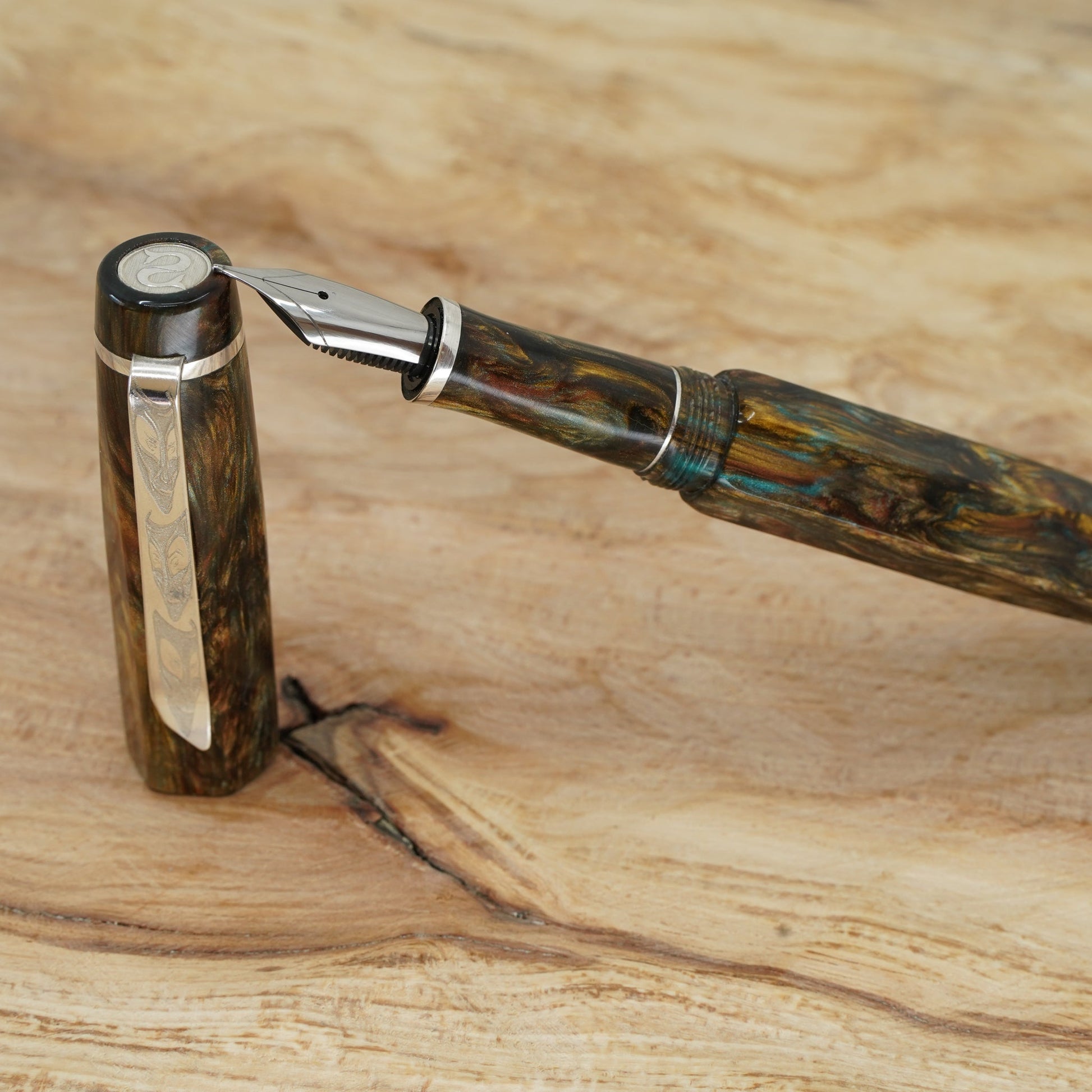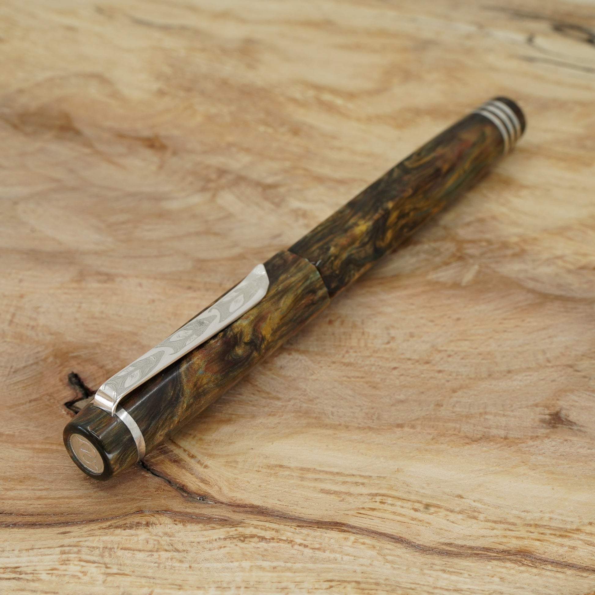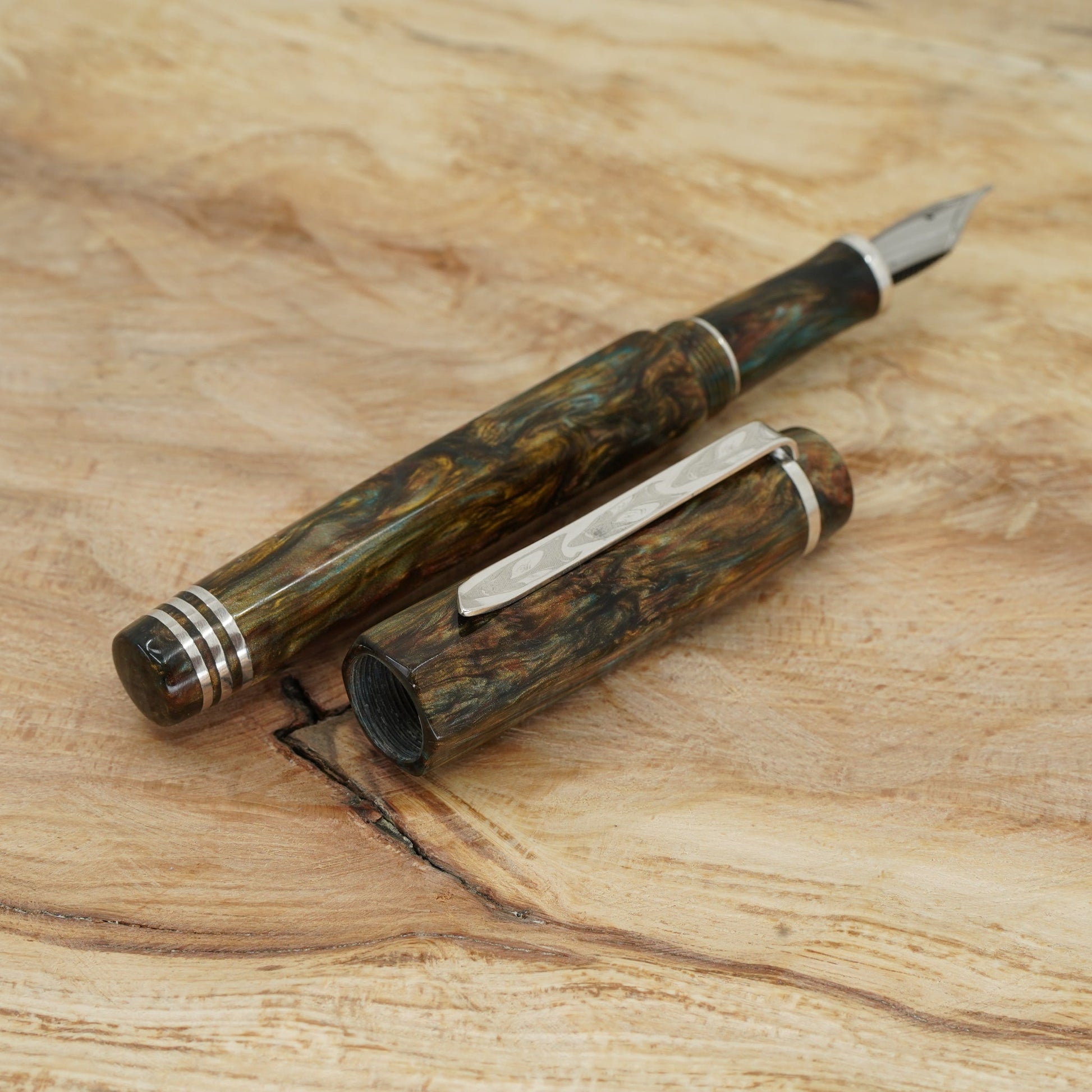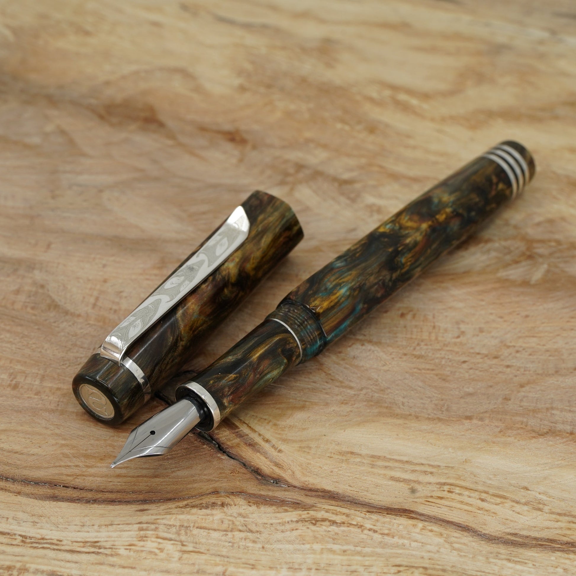 Introducing the Water Lily Koi, a totally hand crafted pen from Silverburlpens.com. Forged Patina Hexagon with complimentary finials, fitted with a polished steel Jowo nib size 6. PEN SIZE: Approximately is 145m/m long including cap. 135m/m nib to body end. Body diameter 15m/m with a 13m/m thread. Cap diameter 16m/m. Nib make Jowo polished steel. The pen comes with any nib tip size and Schmidt K5 ink converter, other nibs are available; please contact john@silverburlpens.com to discuss alternatives and prices. I`ll be pleased to offer advice.
