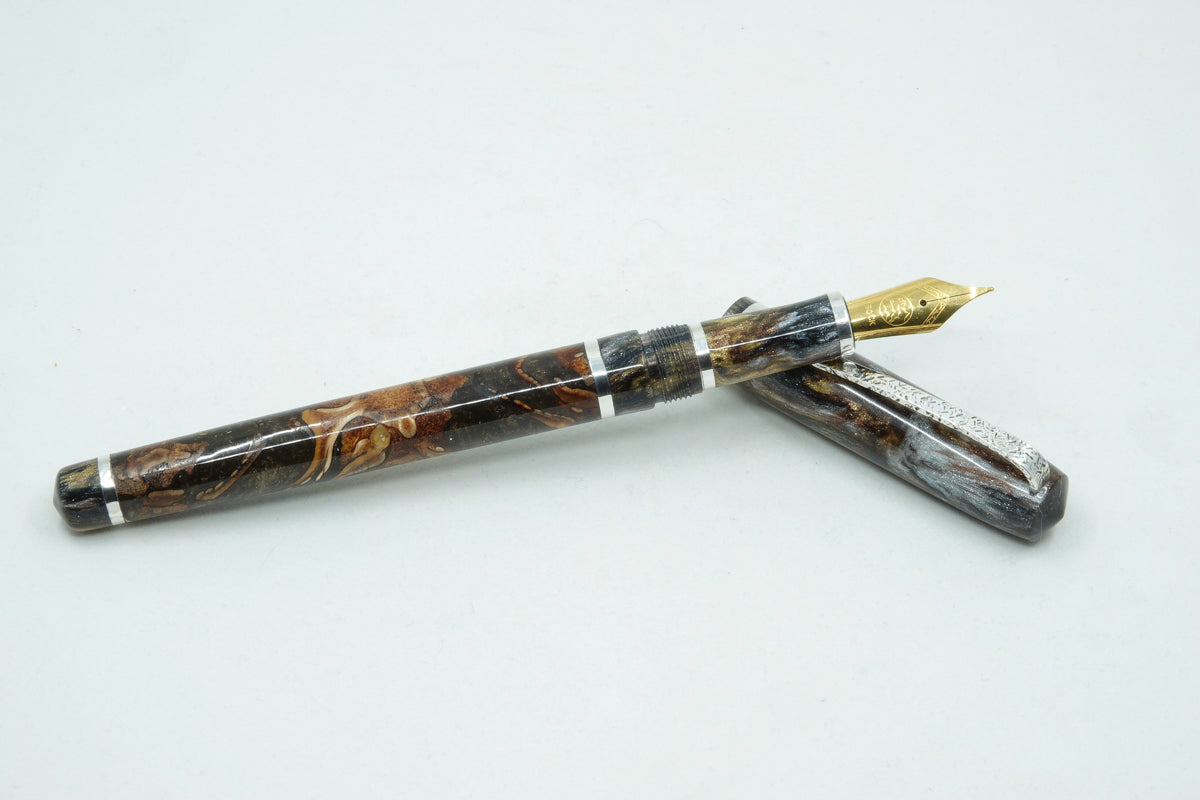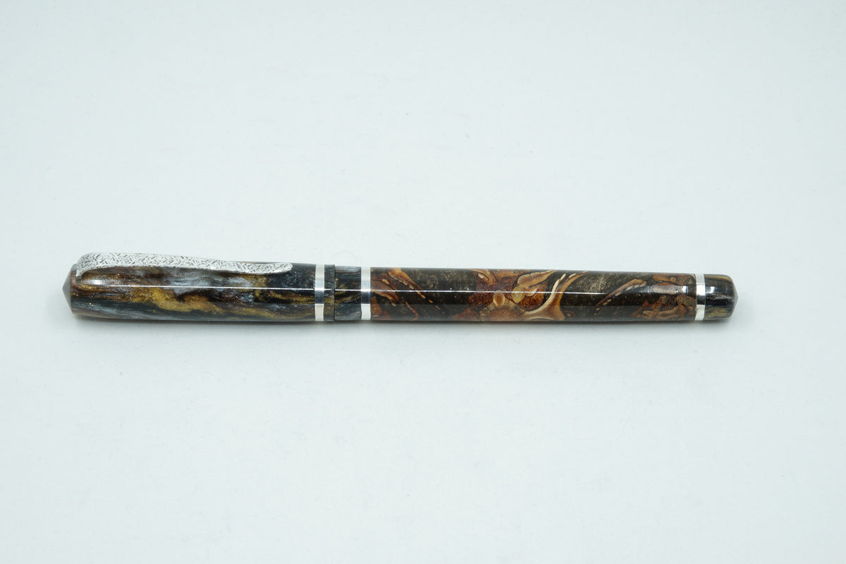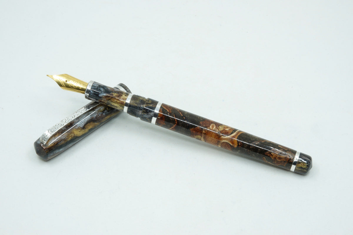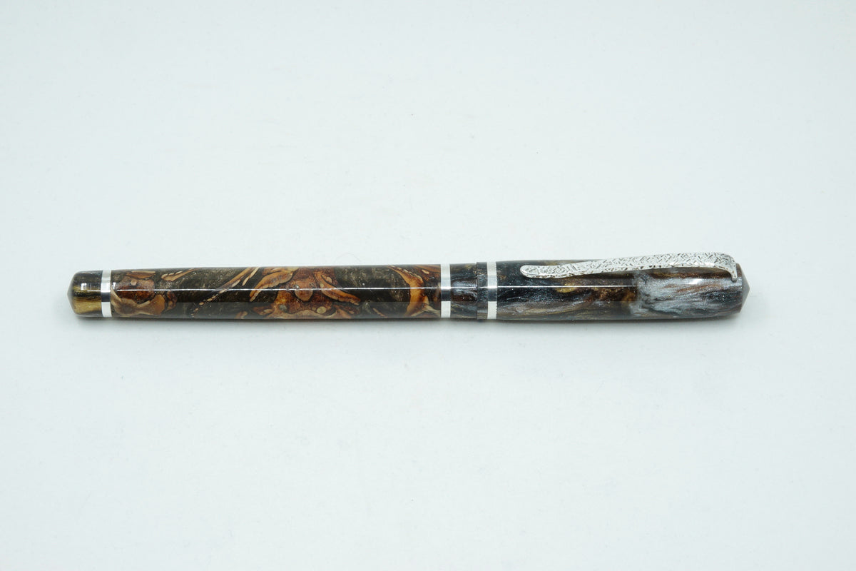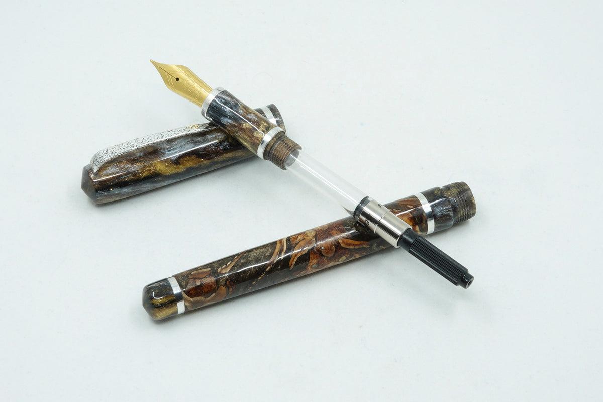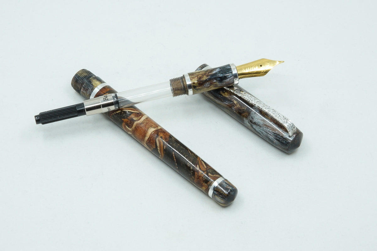 This Pine Cone Heart with Diamond cast Metallurgy cap fountain pen is a one-of-a-kind piece of art. It is handmade with Argentium silver .935, which has increased tarnish resistance, a whiter colour, antibacterial and hypoallergenic properties. The pen clip and accent rings, including the nib section, are all made from this superior silver. The pen cap and nib section are made with alumilite resin, which is made using real diamonds.