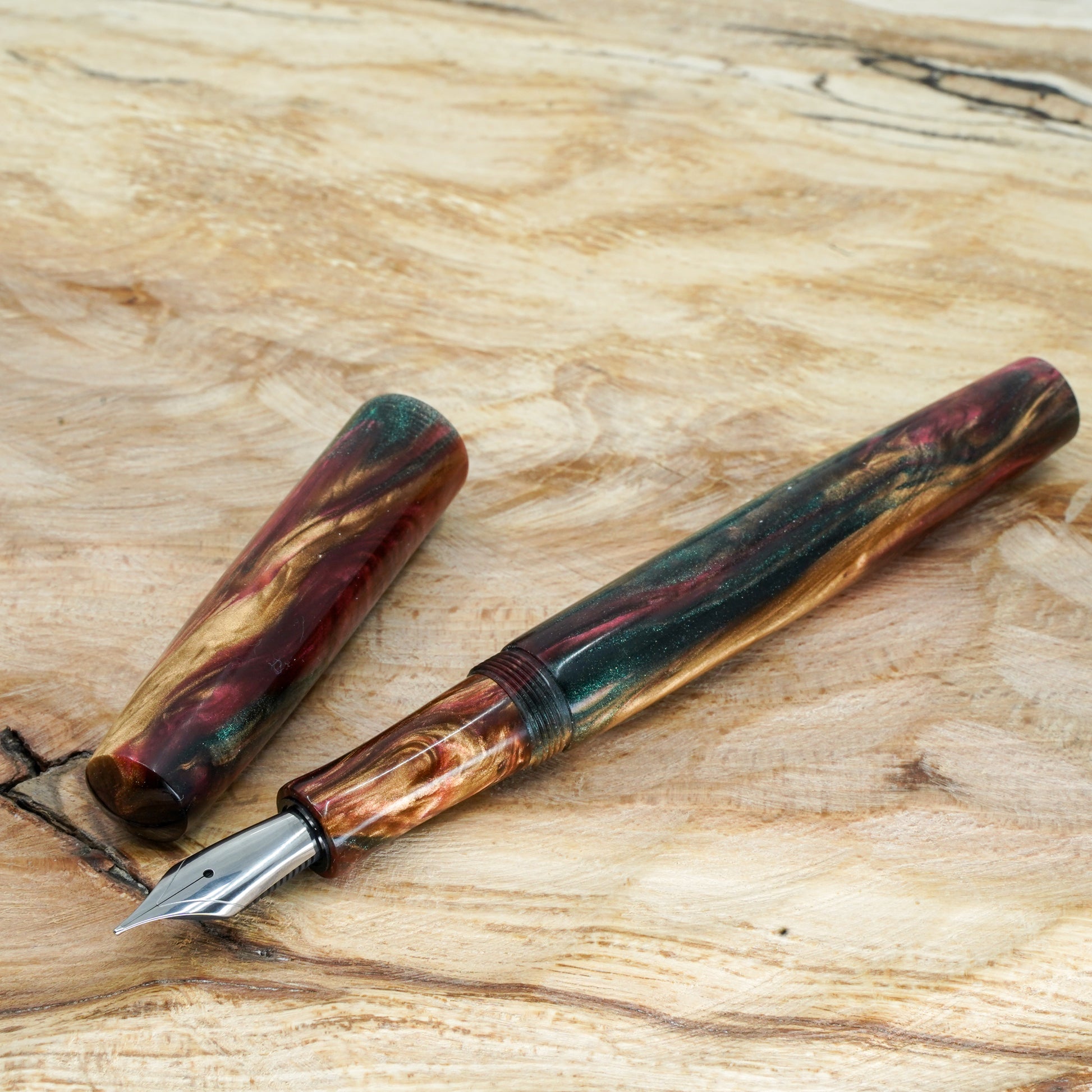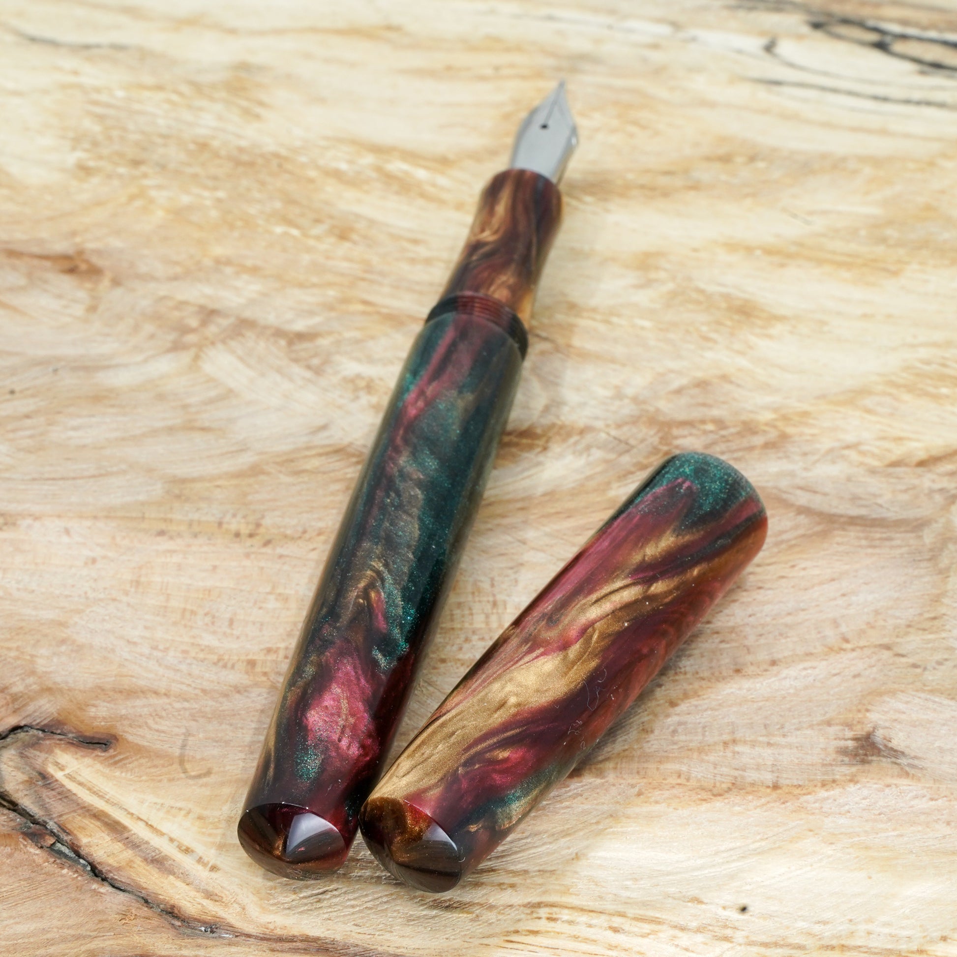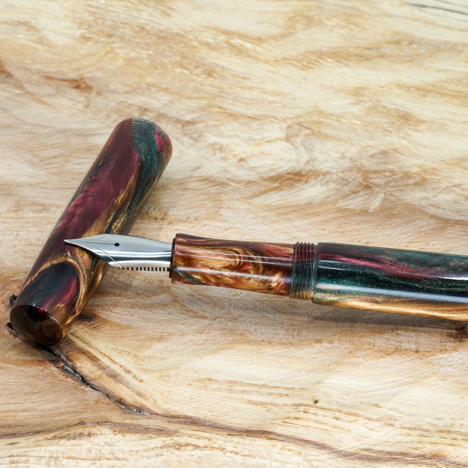 Yule Tidings, fitted with a size six Jowo nib and Schmidt K5 ink converter. Comes standard with a polished steel nib in the tip size of your choosing. Other nibs are available; please contact john@silverburlpens.com to discuss alternatives and prices. I`ll be pleased to offer advice.