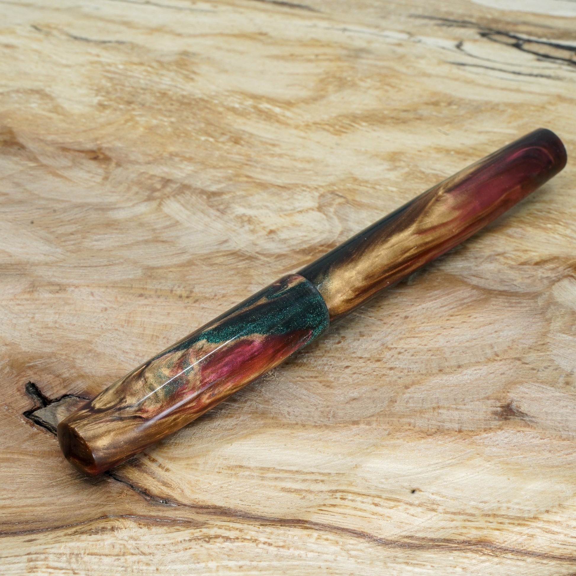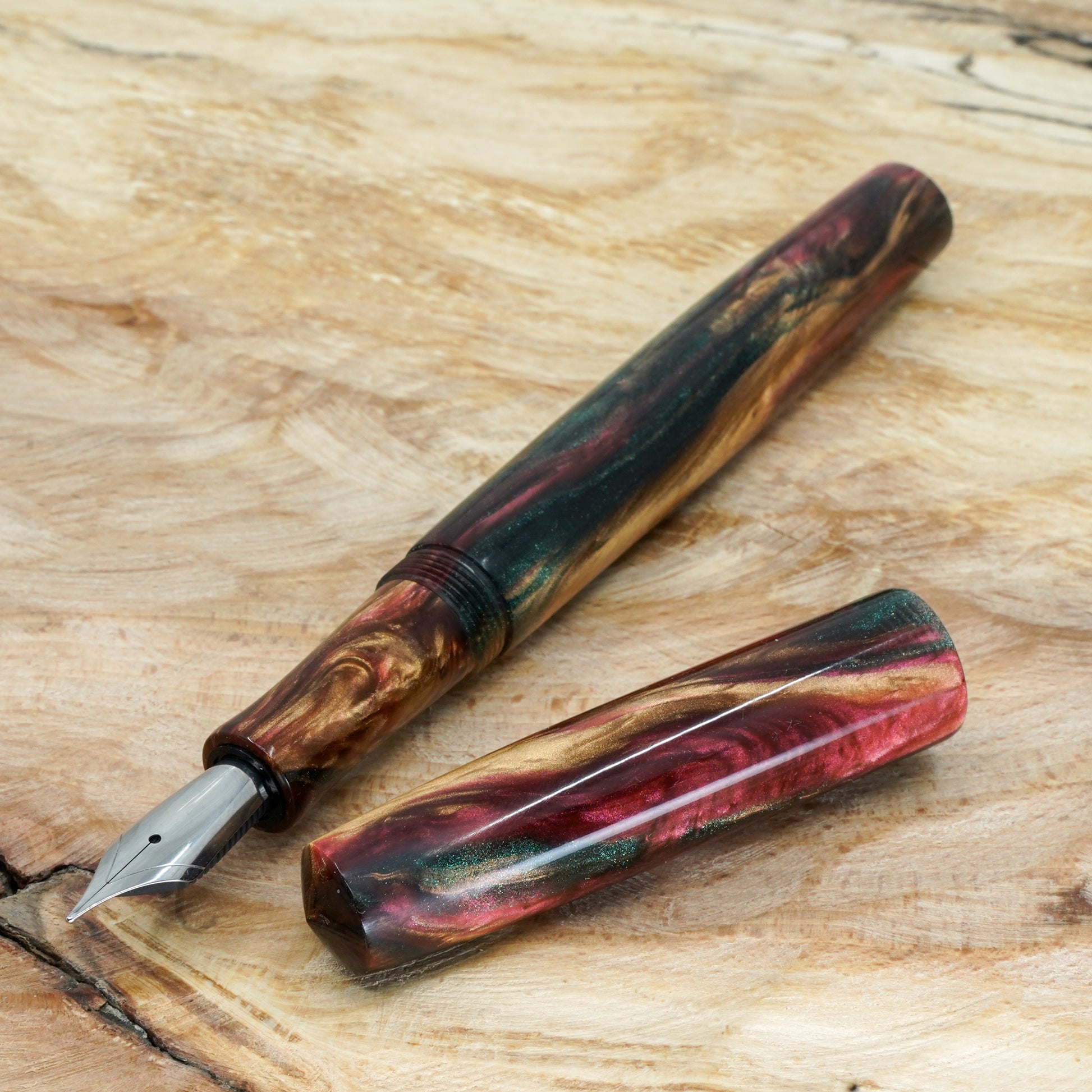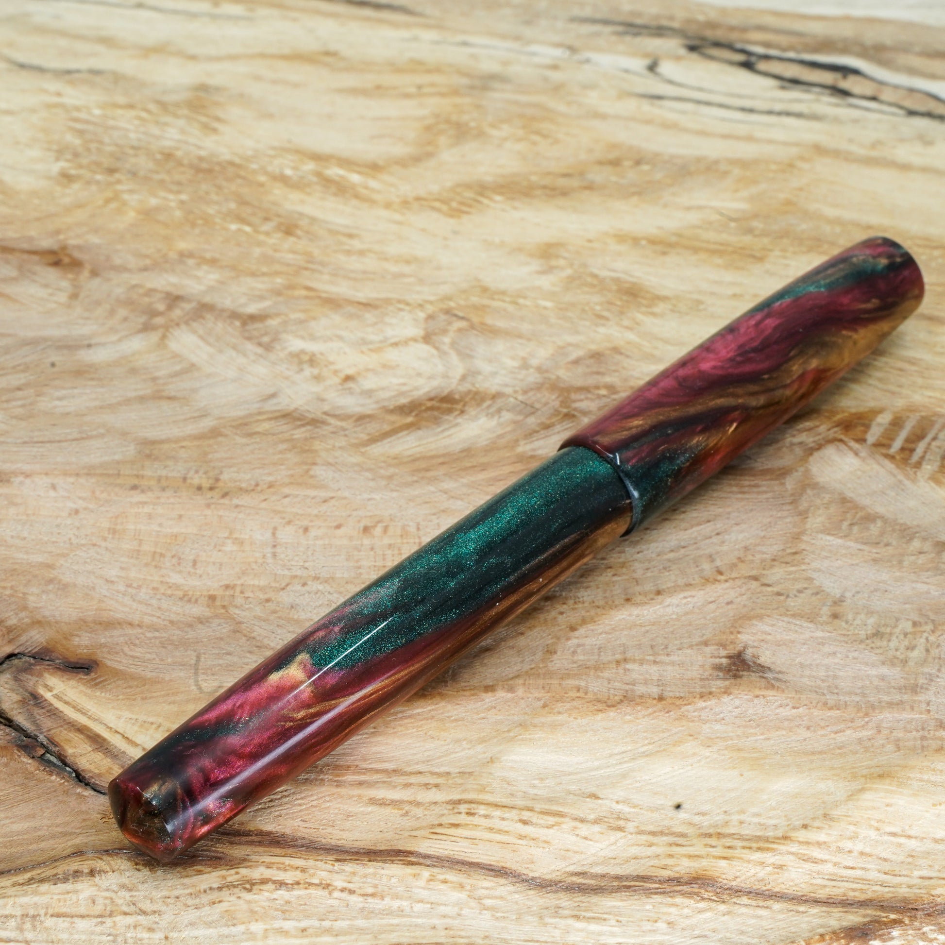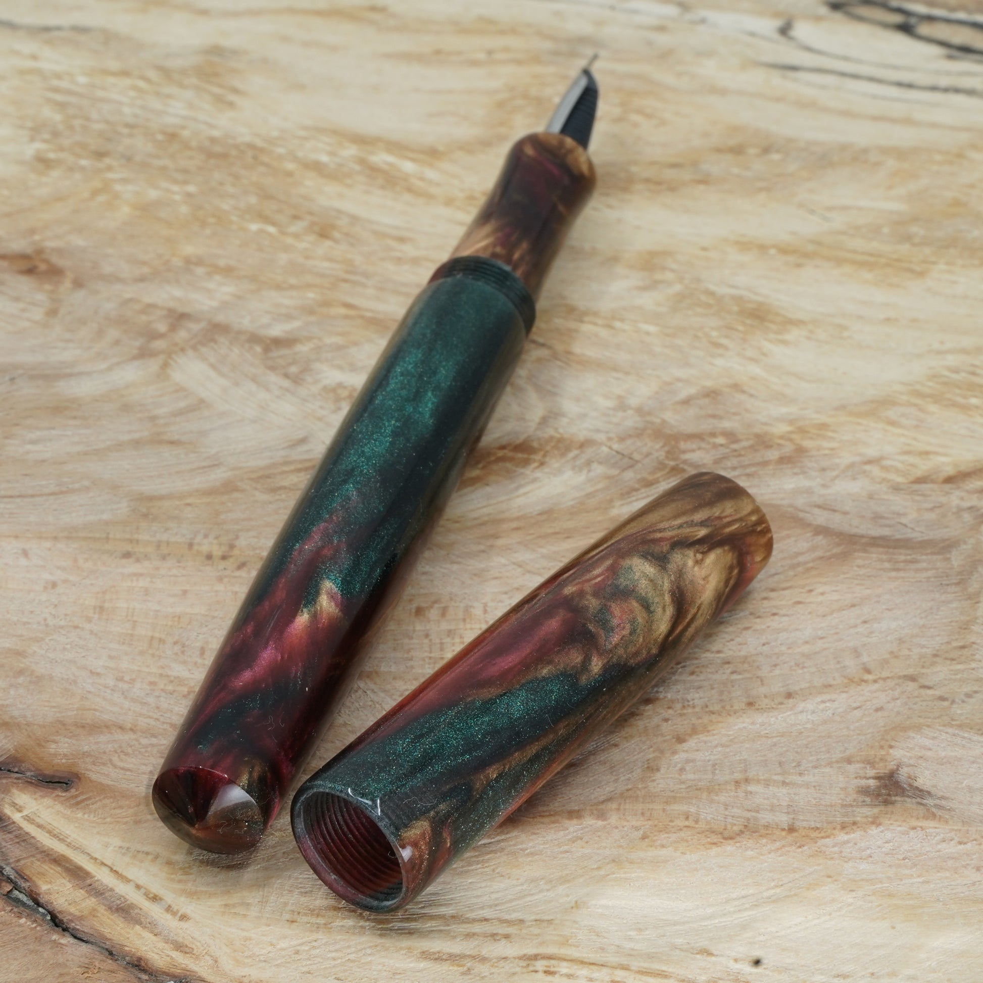 Yule Tidings, fitted with a size six Jowo nib and Schmidt K5 ink converter. Comes standard with a polished steel nib in the tip size of your choosing. Other nibs are available; please contact john@silverburlpens.com to discuss alternatives and prices. I`ll be pleased to offer advice.