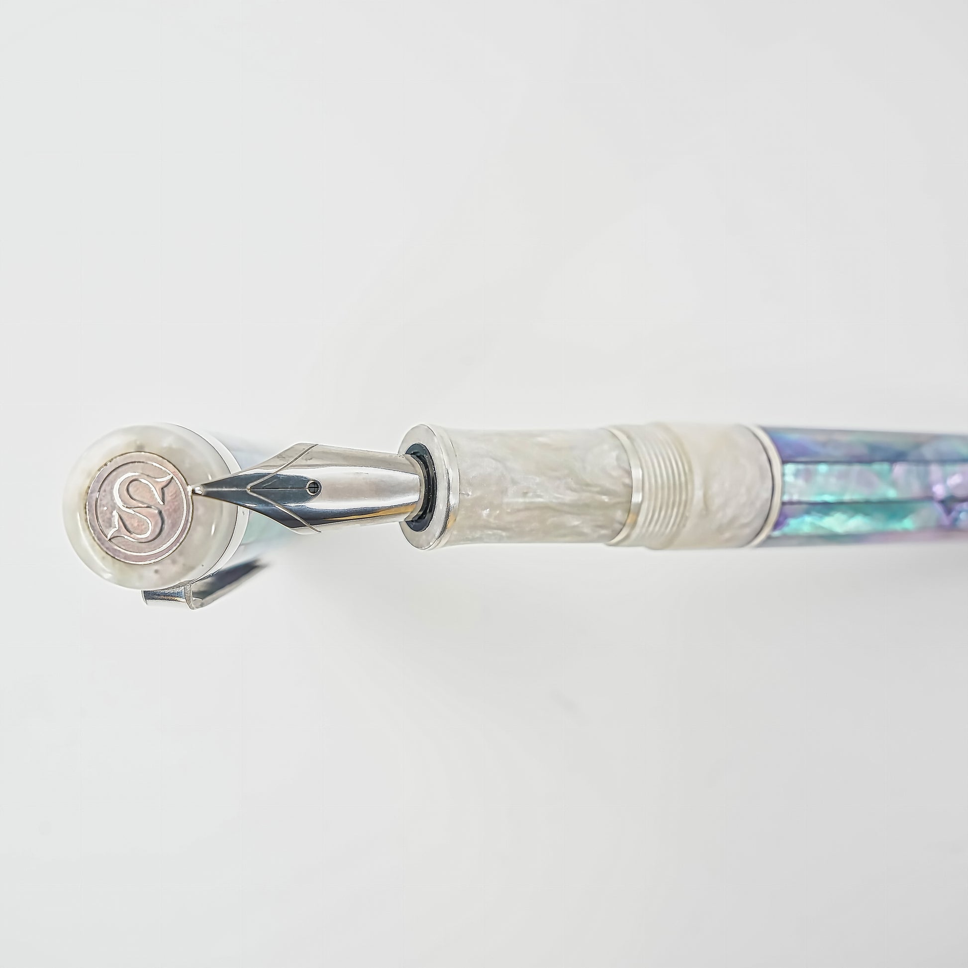 This exquisite fountain pen is a true work of art, meticulously handcrafted with inspiration from the stunning beauty of Cornwall's St Ives Bamaluz Beach. Made with real sea shell and Argentium silver, the Bamaluz series offers a unique and luxurious writing experience.