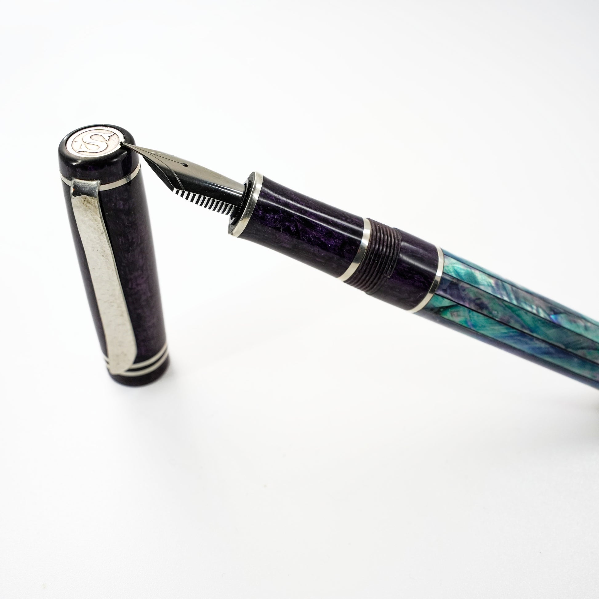 This exceptional fountain pen is a finely crafted tribute to the natural beauty of Cornwall’s St Ives Bamaluz Beach. Constructed from authentic sea shell and Solid Argentium silver, the Bamaluz series delivers a refined and distinctive writing experience. The pen features natural Mother of pearl dark strip shell, complimented with solid Argentium silver, ensuring smooth, precise ink flow for effortless writing. Its design reflects the serene coastal environment, combining acrylic resin with abalone shell to balance durability and elegance. Measuring 145mm in length with a 135mm nib-to-finial span, it offers optimal comfort. Equipped with a Jowo size six nib and Schmidt K5 converter, it accommodates various nib sizes—from extra fine to broad—catering to diverse writing preferences and applications.