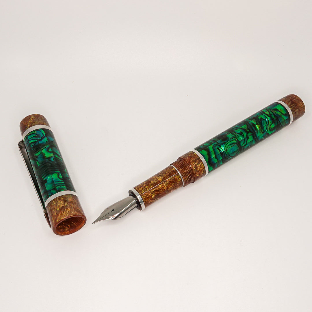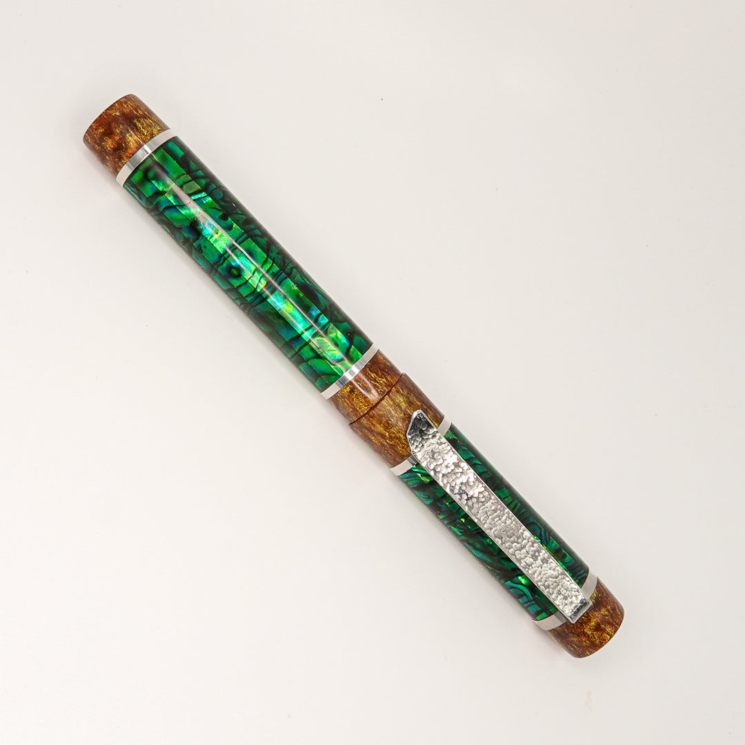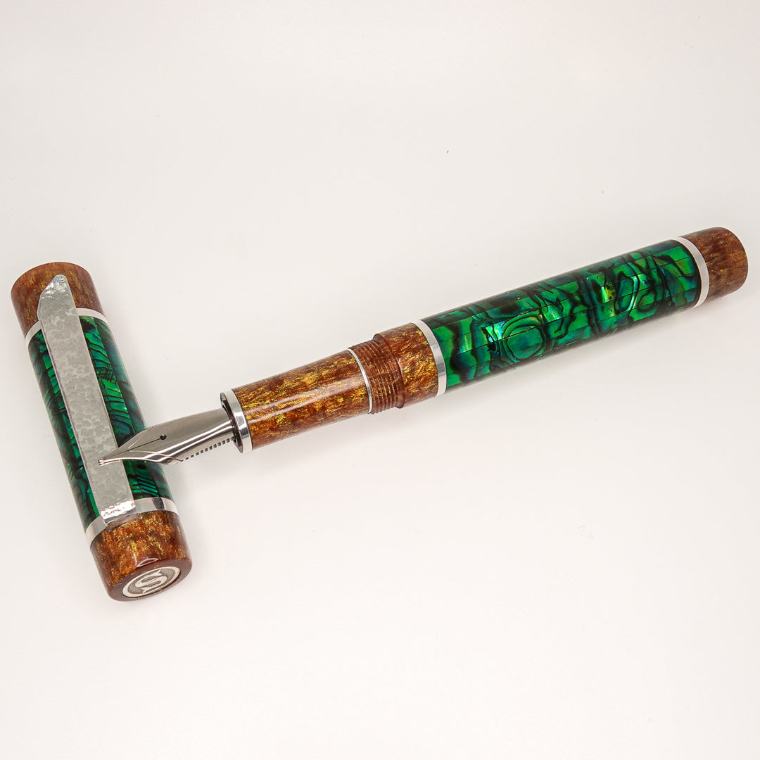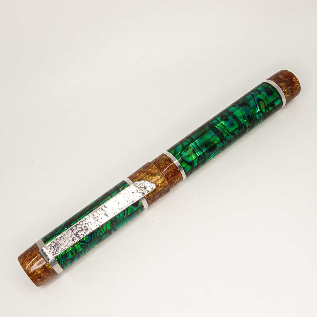 The fusion of acrylic resin and natural abalone shell creates a tranquil coastal landscape design, with the iridescence of the shell adding a touch of oceanic allure. The pen measures 145m/m in length, with a nib to finial end measurement of 135m/m, a body diameter of 15.5m/m, and a section diameter of 12m/m. It features a Jowo size six nib and a Schmidt K5 ink converter.