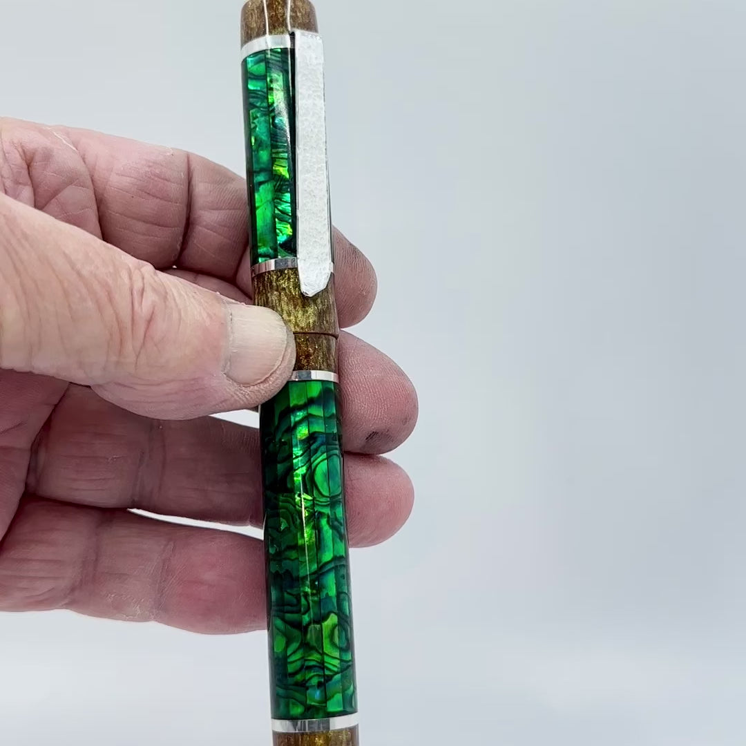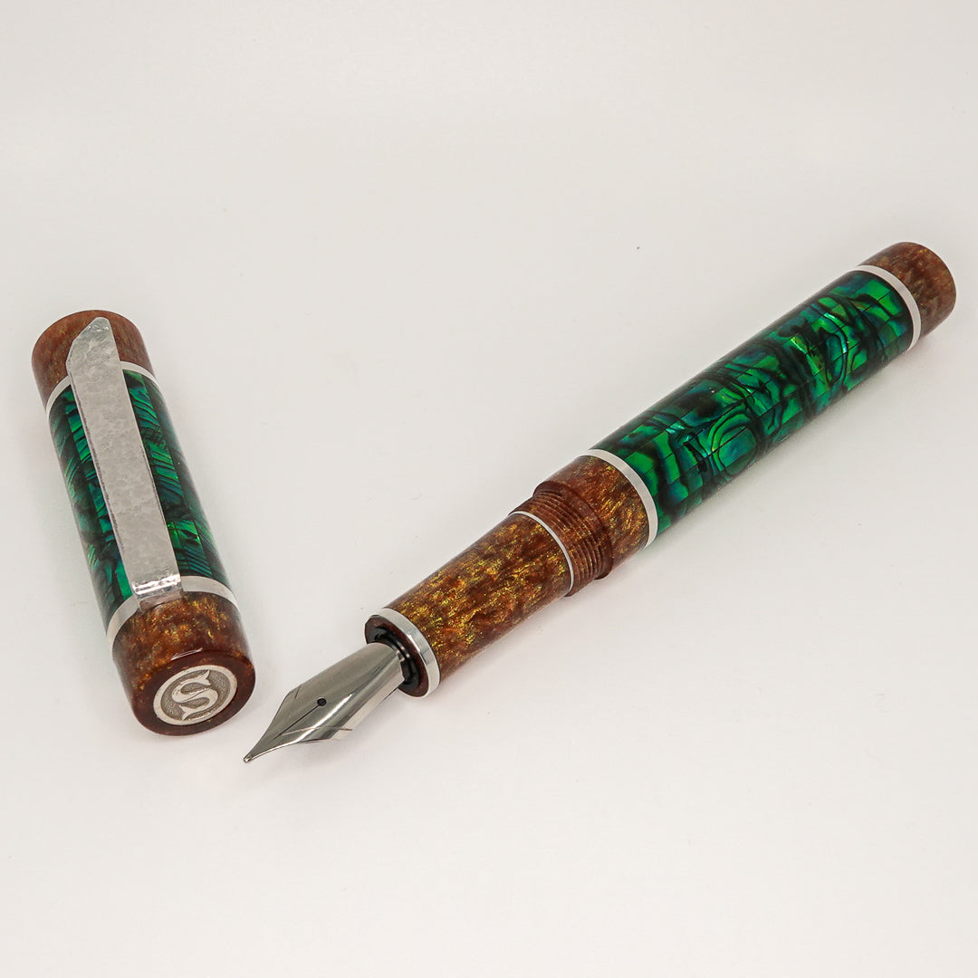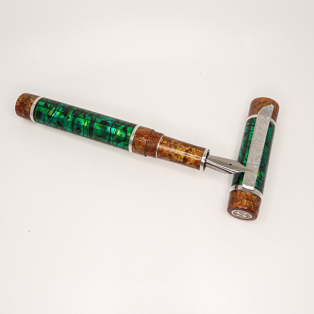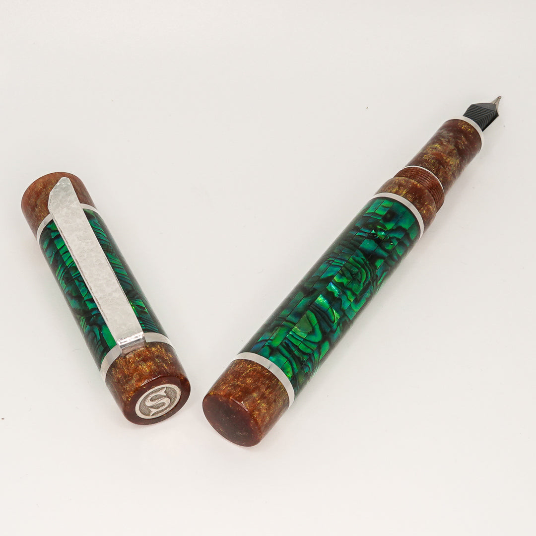 The fusion of acrylic resin and natural abalone shell creates a tranquil coastal landscape design, with the iridescence of the shell adding a touch of oceanic allure. The pen measures 145m/m in length, with a nib to finial end measurement of 135m/m, a body diameter of 15.5m/m, and a section diameter of 12m/m. It features a Jowo size six nib and a Schmidt K5 ink converter.