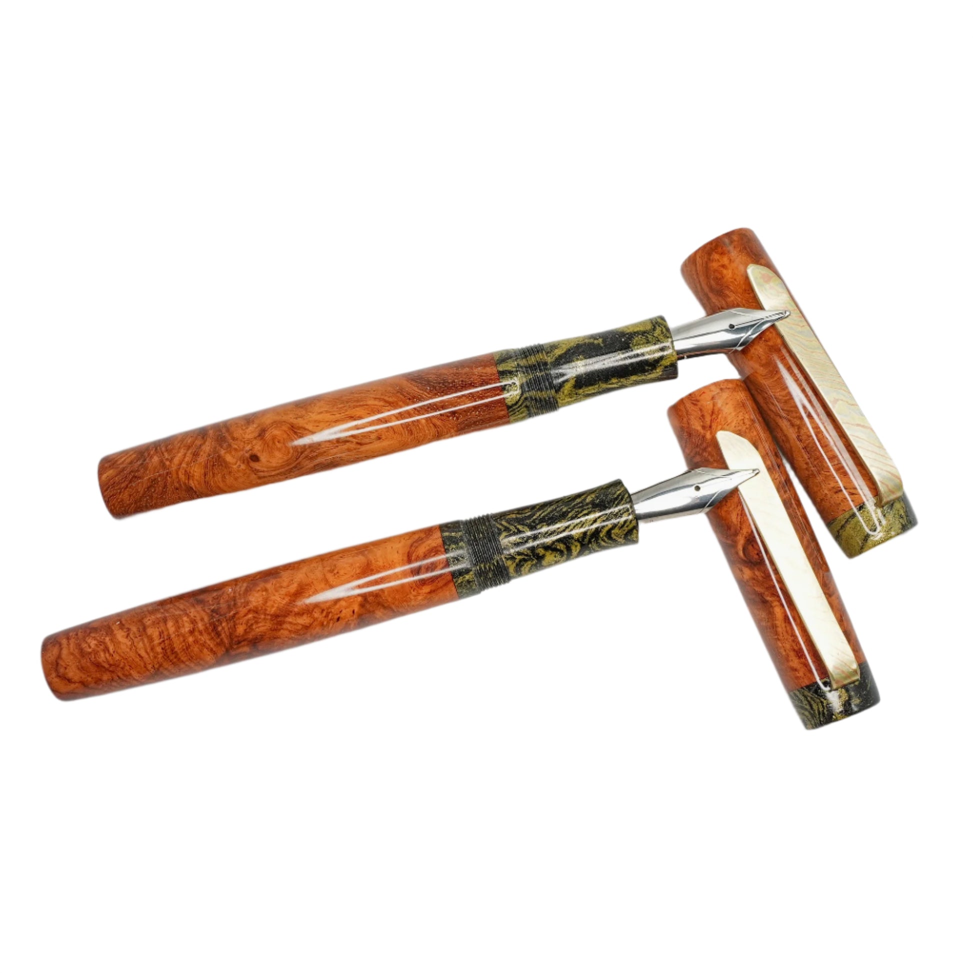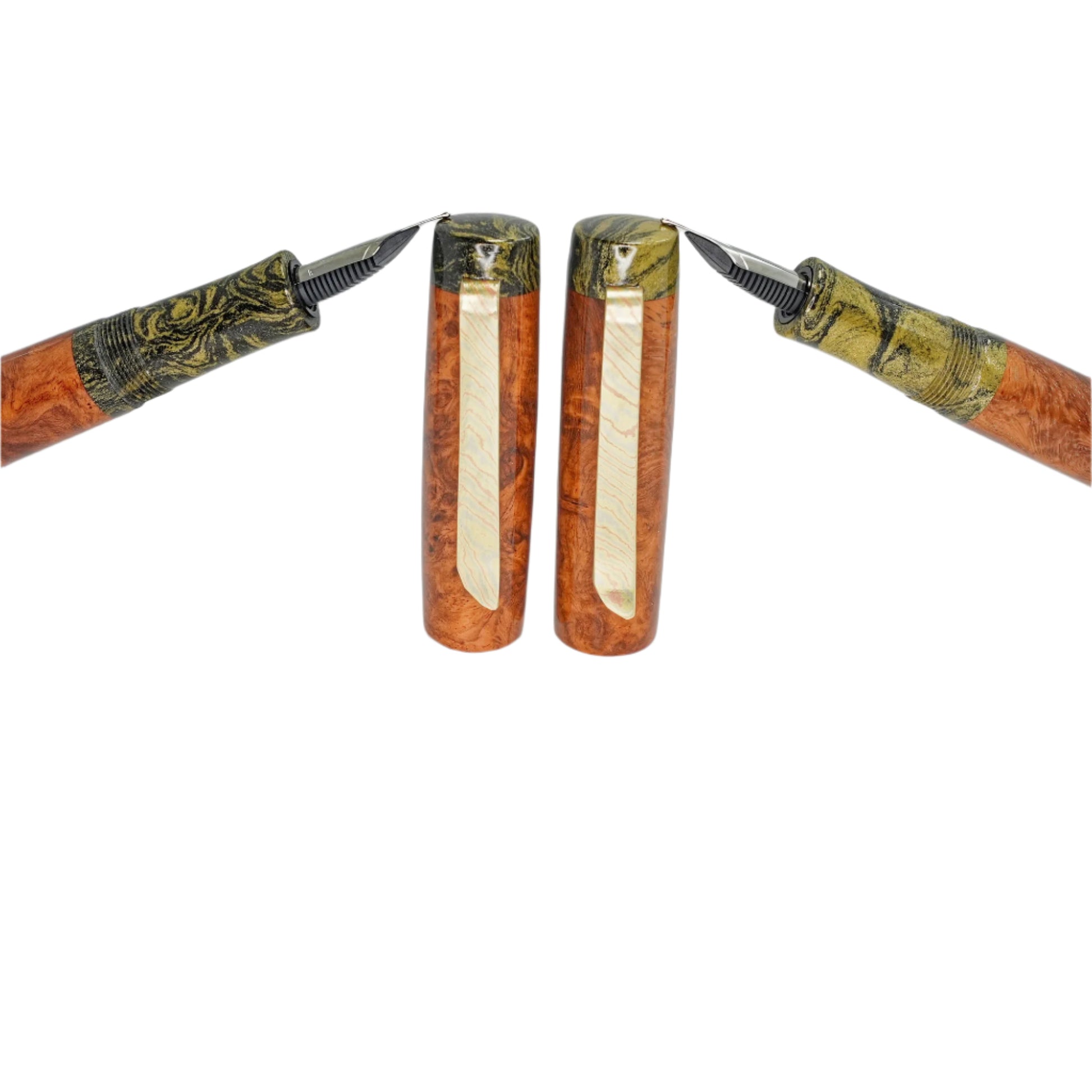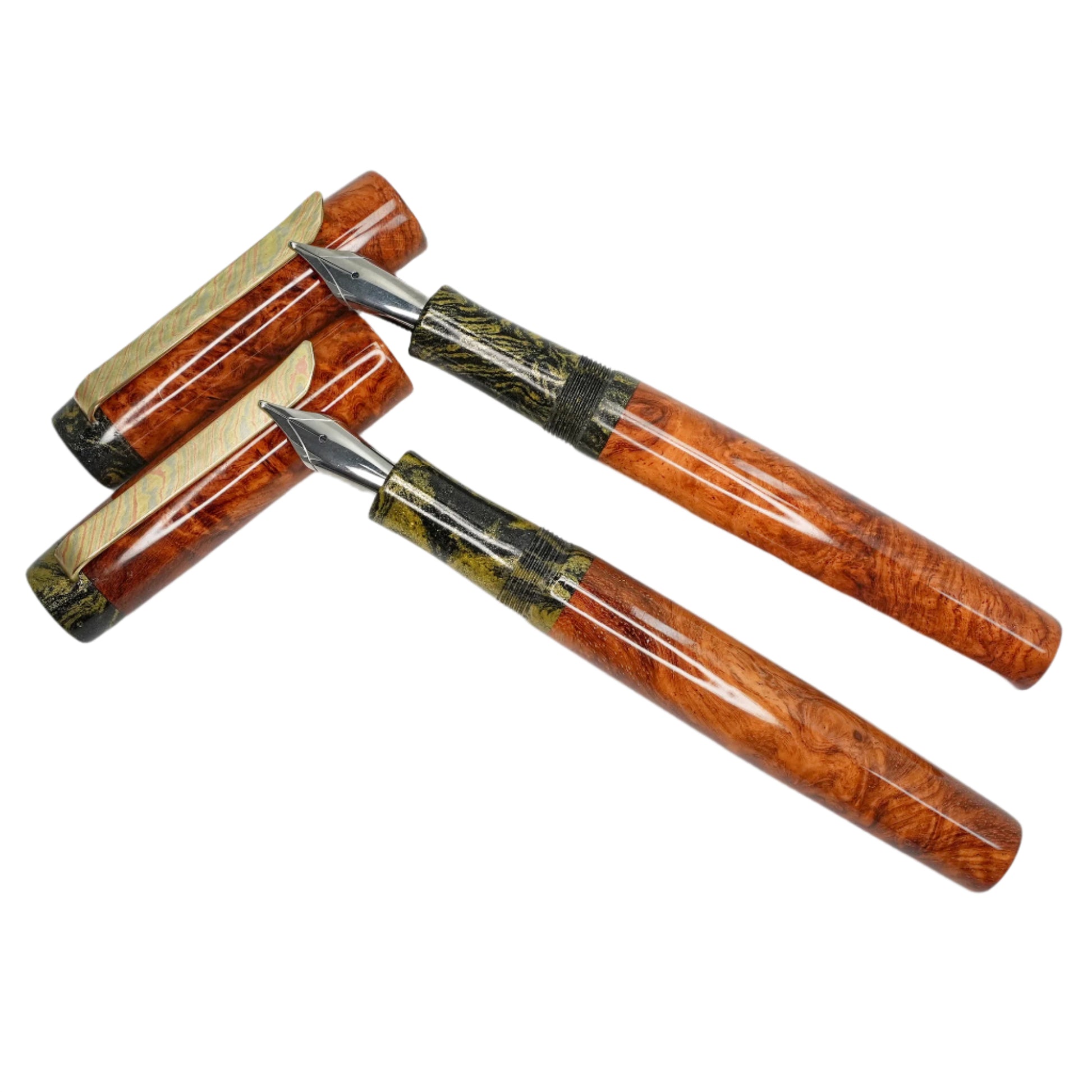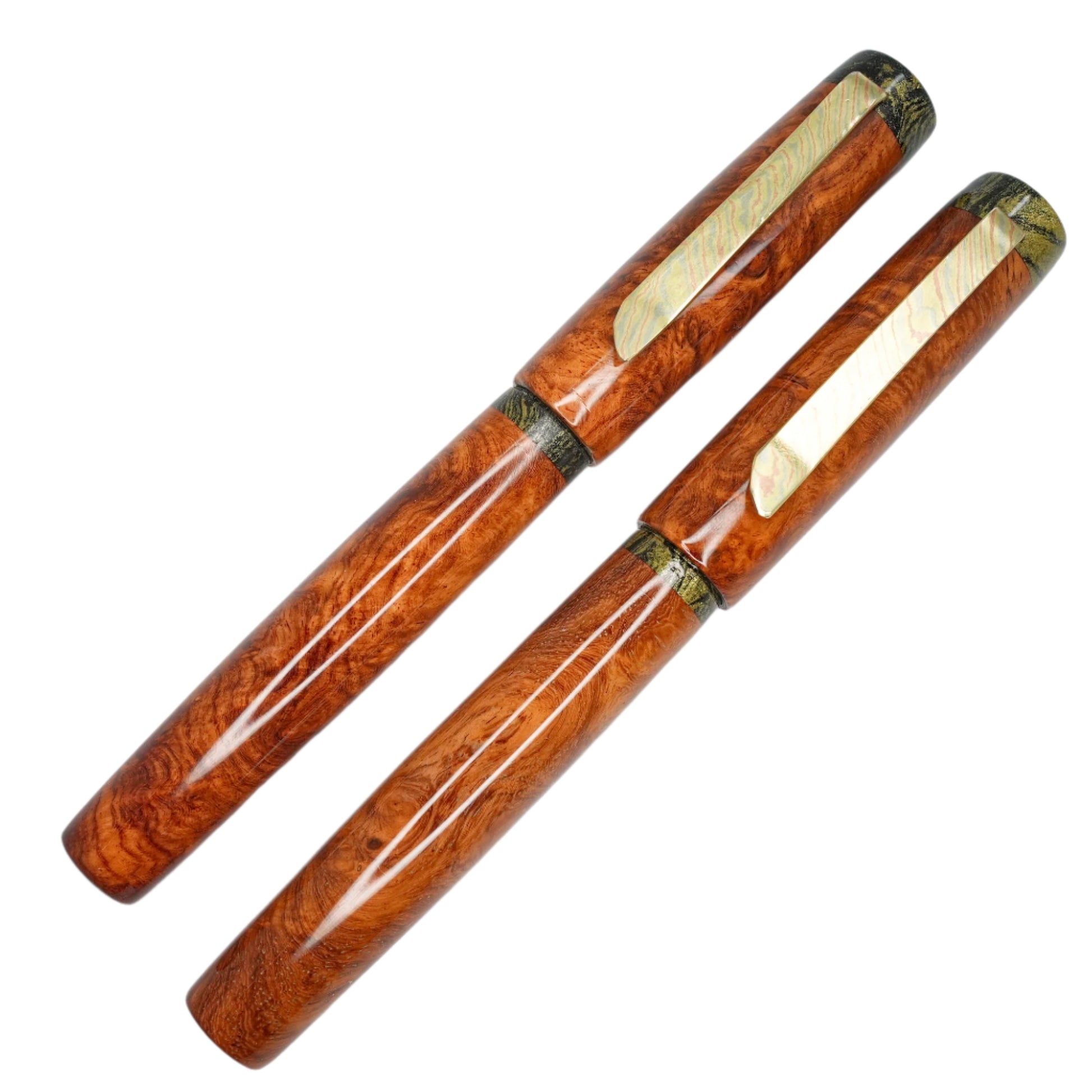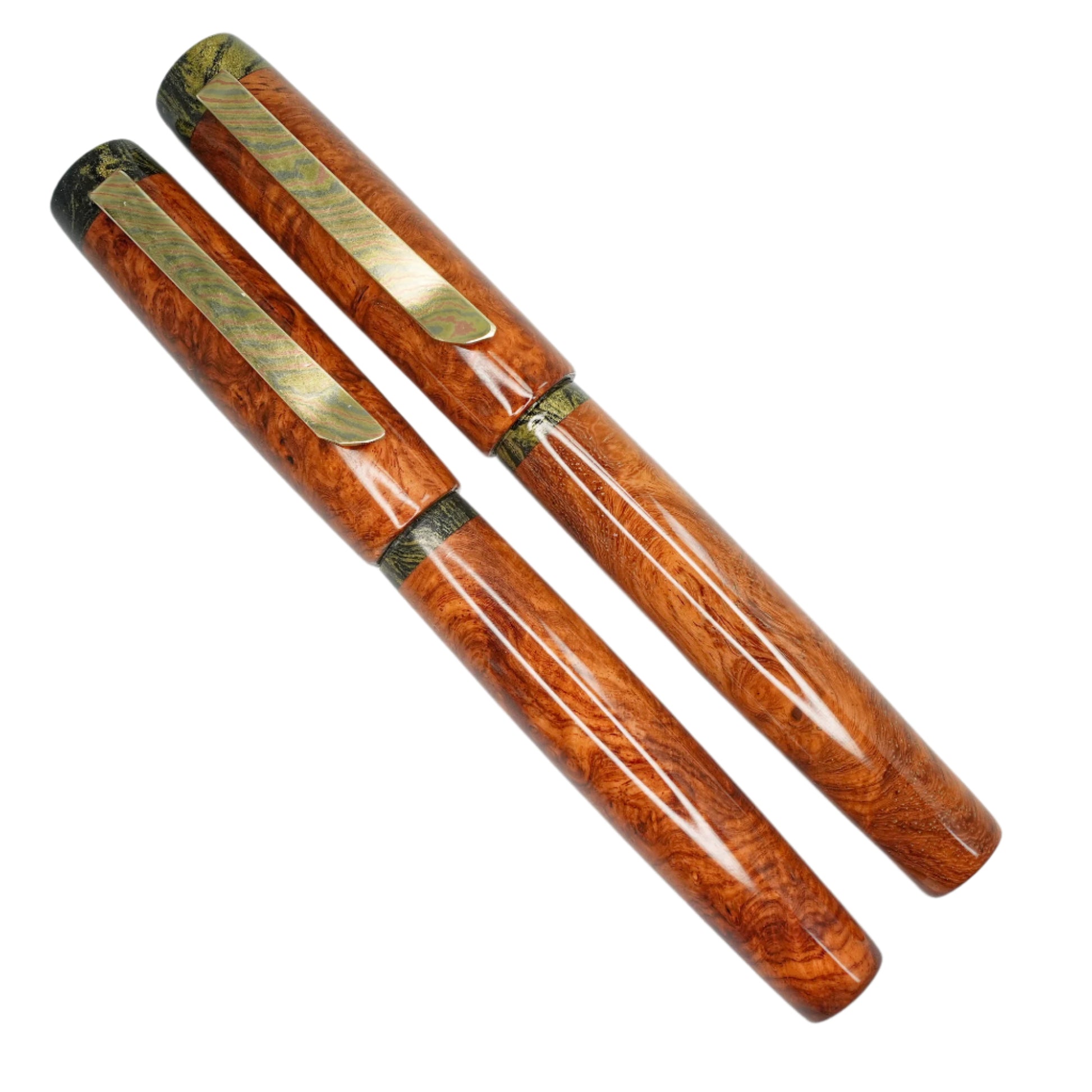 Afzelia Burl wood with Black Titanium and Brass lining and cap finial, pocket clip handmade Mokume gain, fitted with a Jowo size six nib and K5 ink converter.