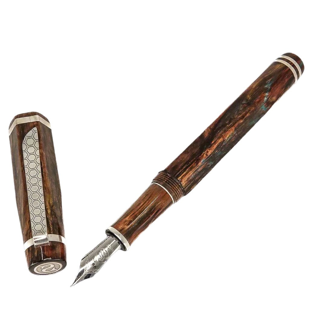 Introducing the Forged Patina Hexagon with complimentary finials, fitted with a polished steel Bock nib size 6. Pen size approximately is 145m/m long including cap. 135m/m nib to body end. Body diameter 15m/m with a 13m/m thread. Cap diameter 16m/m. Nib make fitted is a Jowo size six polished steel medium tip other tip sizes available at no extra cost extra fine, fine, broad.