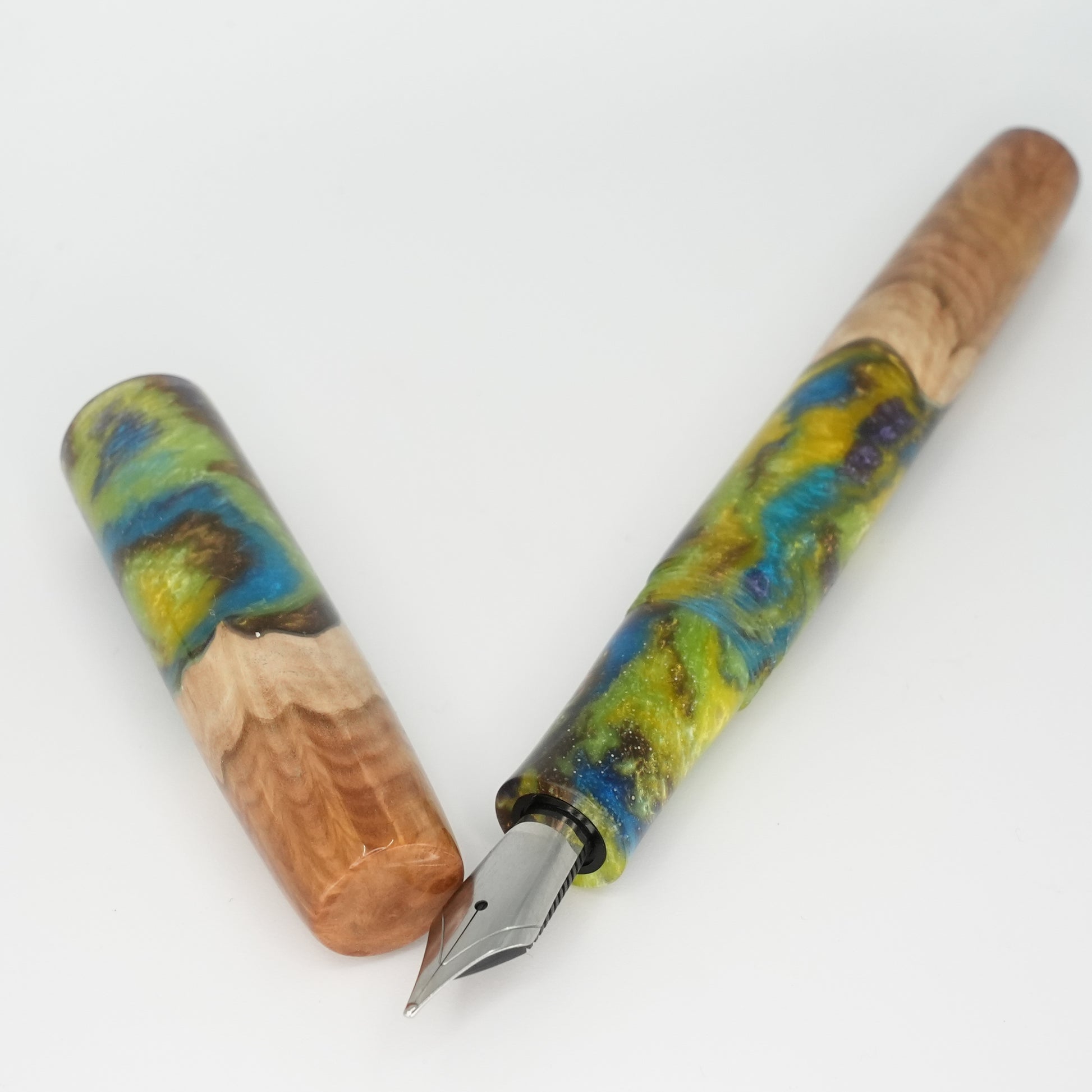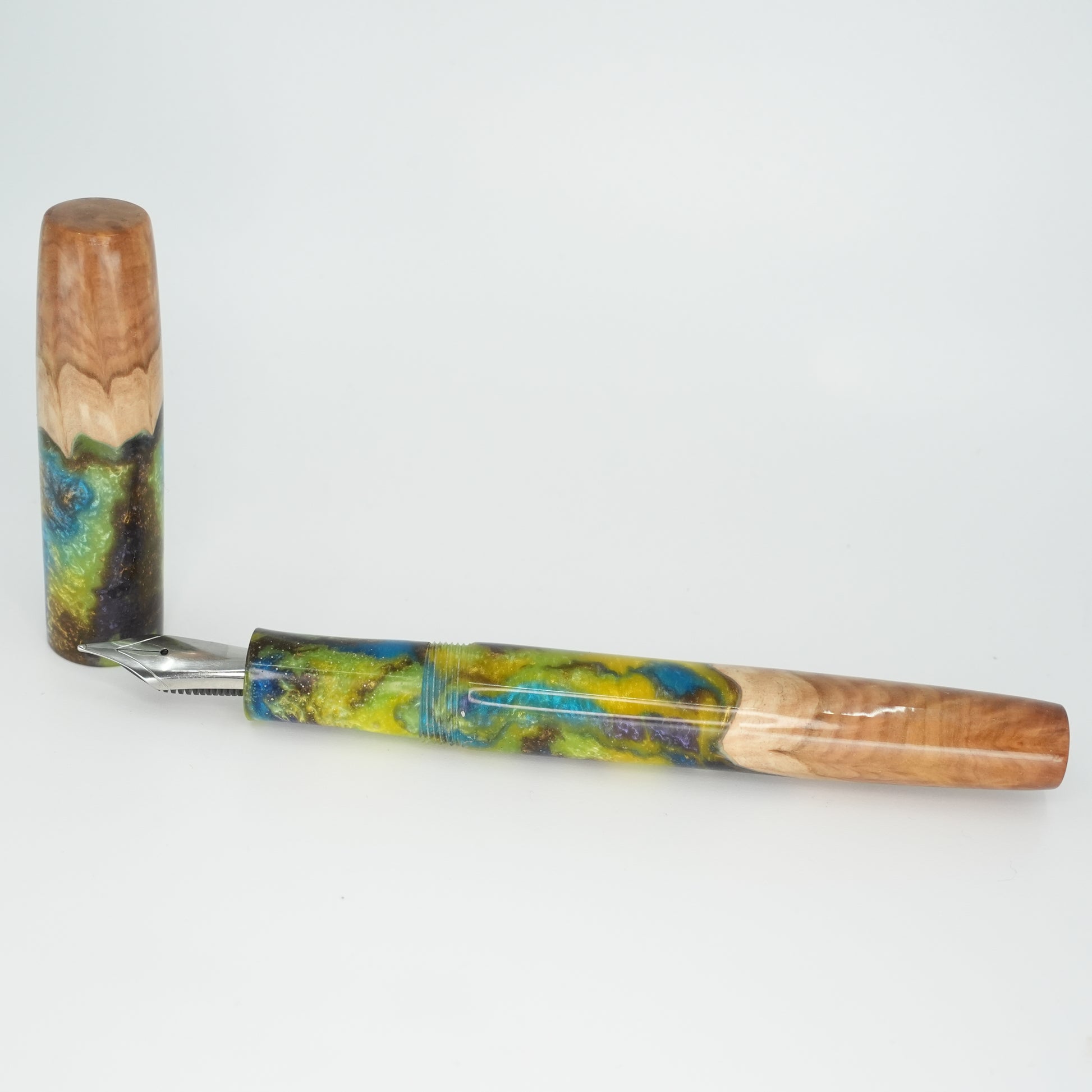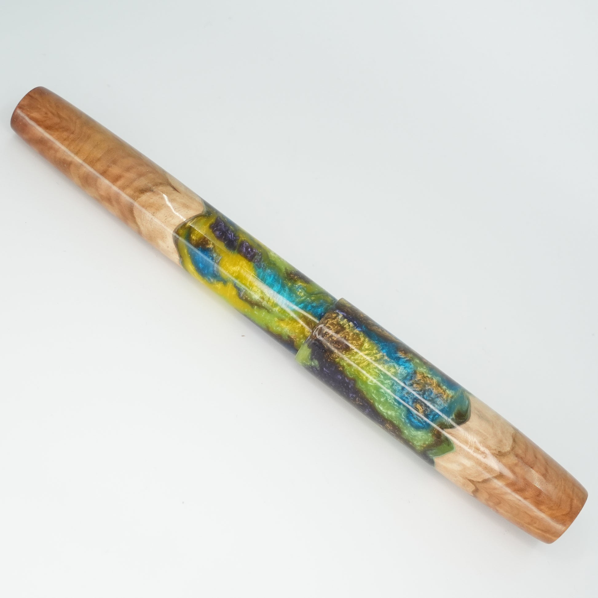 Experience the stunning and unique appearance of Golden Glow Wood Hybrid, made with exquisite Brown Mallee Burl wood. Each pen is handcrafted with the wood's natural identity and features, making every piece truly one-of-a-kind. From the grip and nib section to the triple start thread, every detail is meticulously done by all handmade by John here in Cornwall. Rest assured that no pen kit has been used in the making of these pens, showcasing the level of craftsmanship and quality that is reflected in the price. With a polished steel iridium tip Jowo nib and a Schmidt K5 premium ink converter filling system, our pen offers versatility and convenience. Contact us in advance to learn more about custom options, shipping times, and pricing. PEN SIZE: Overall length including cap 140m/m Nib tip to body end 135m/m Body diameter 14m/m body to cap thread 14m/m triple start. Cap diameter 15.5m/m Section diameter at narrowest point 11.5