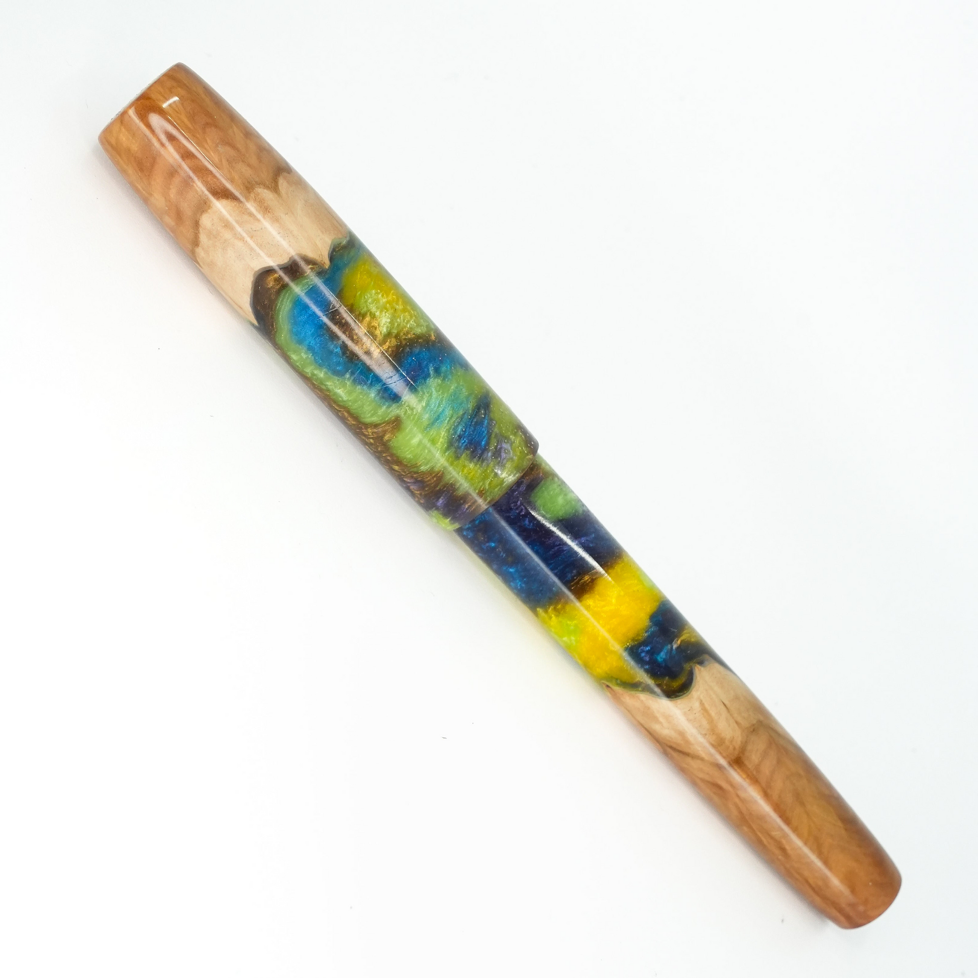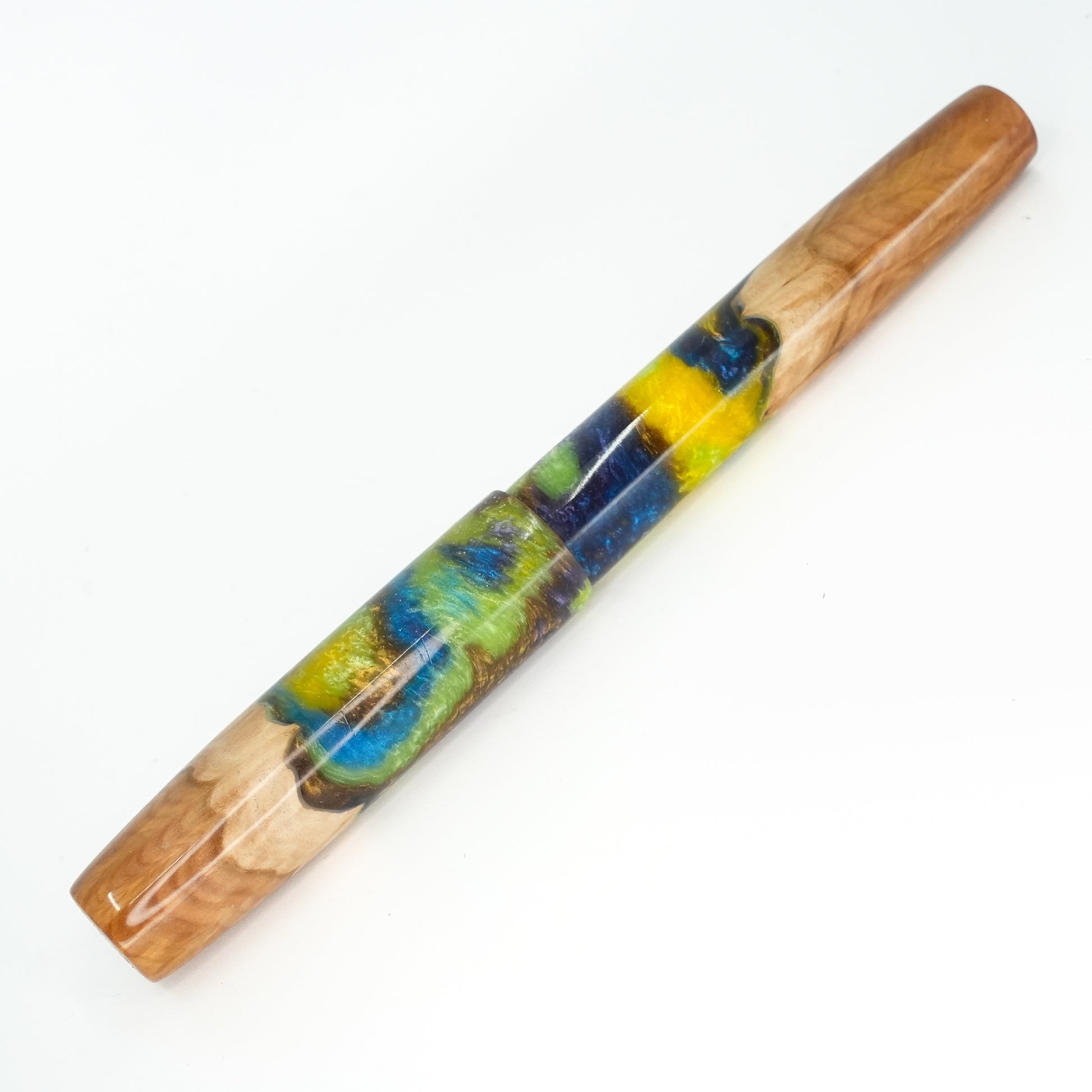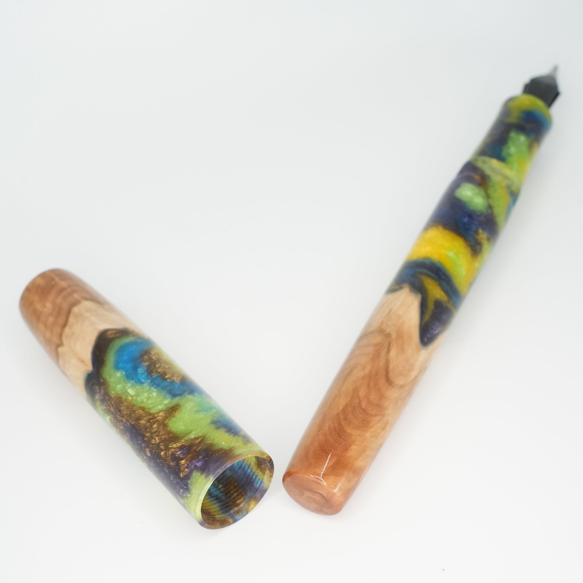 Experience the stunning and unique appearance of Golden Glow Wood Hybrid, made with exquisite Brown Mallee Burl wood. Each pen is handcrafted with the wood's natural identity and features, making every piece truly one-of-a-kind. From the grip and nib section to the triple start thread, every detail is meticulously done by all handmade by John here in Cornwall. Rest assured that no pen kit has been used in the making of these pens, showcasing the level of craftsmanship and quality that is reflected in the price. With a polished steel iridium tip Jowo nib and a Schmidt K5 premium ink converter filling system, our pen offers versatility and convenience. Contact us in advance to learn more about custom options, shipping times, and pricing. PEN SIZE: Overall length including cap 140m/m Nib tip to body end 135m/m Body diameter 14m/m body to cap thread 14m/m triple start. Cap diameter 15.5m/m Section diameter at narrowest point 11.5