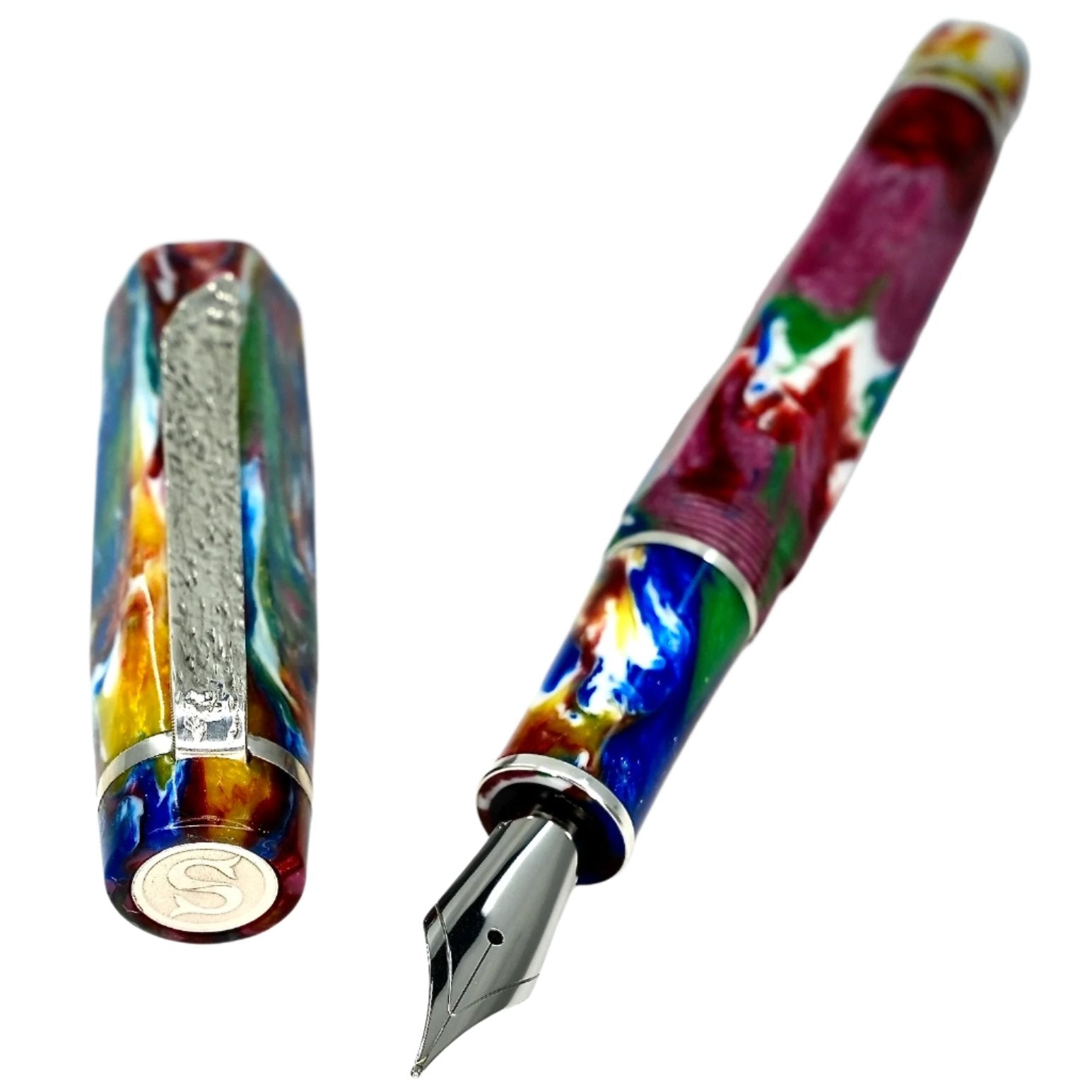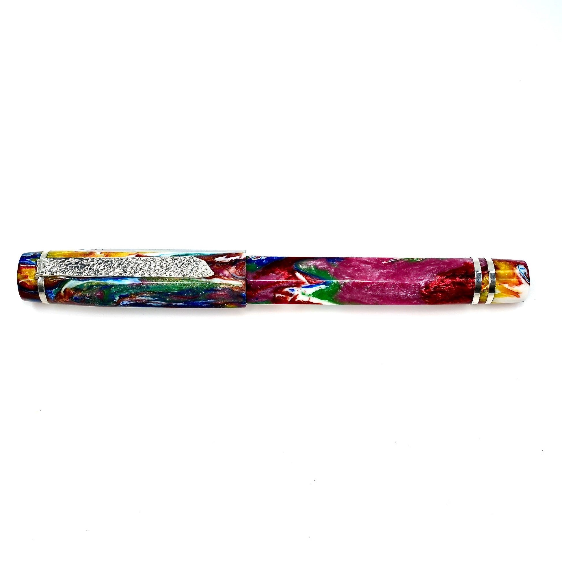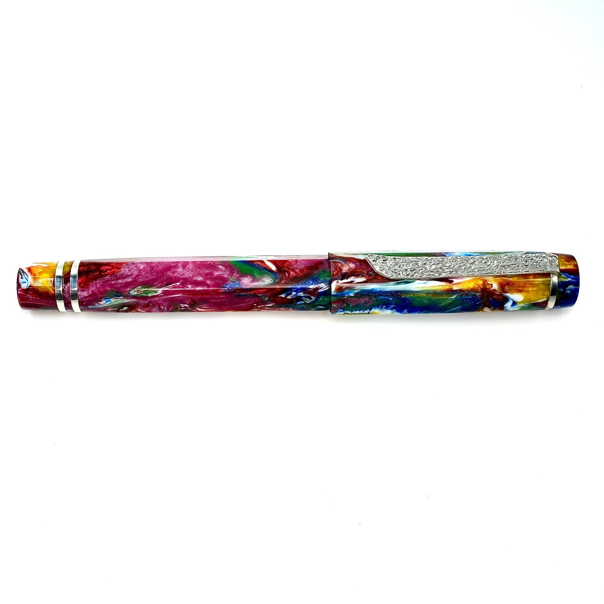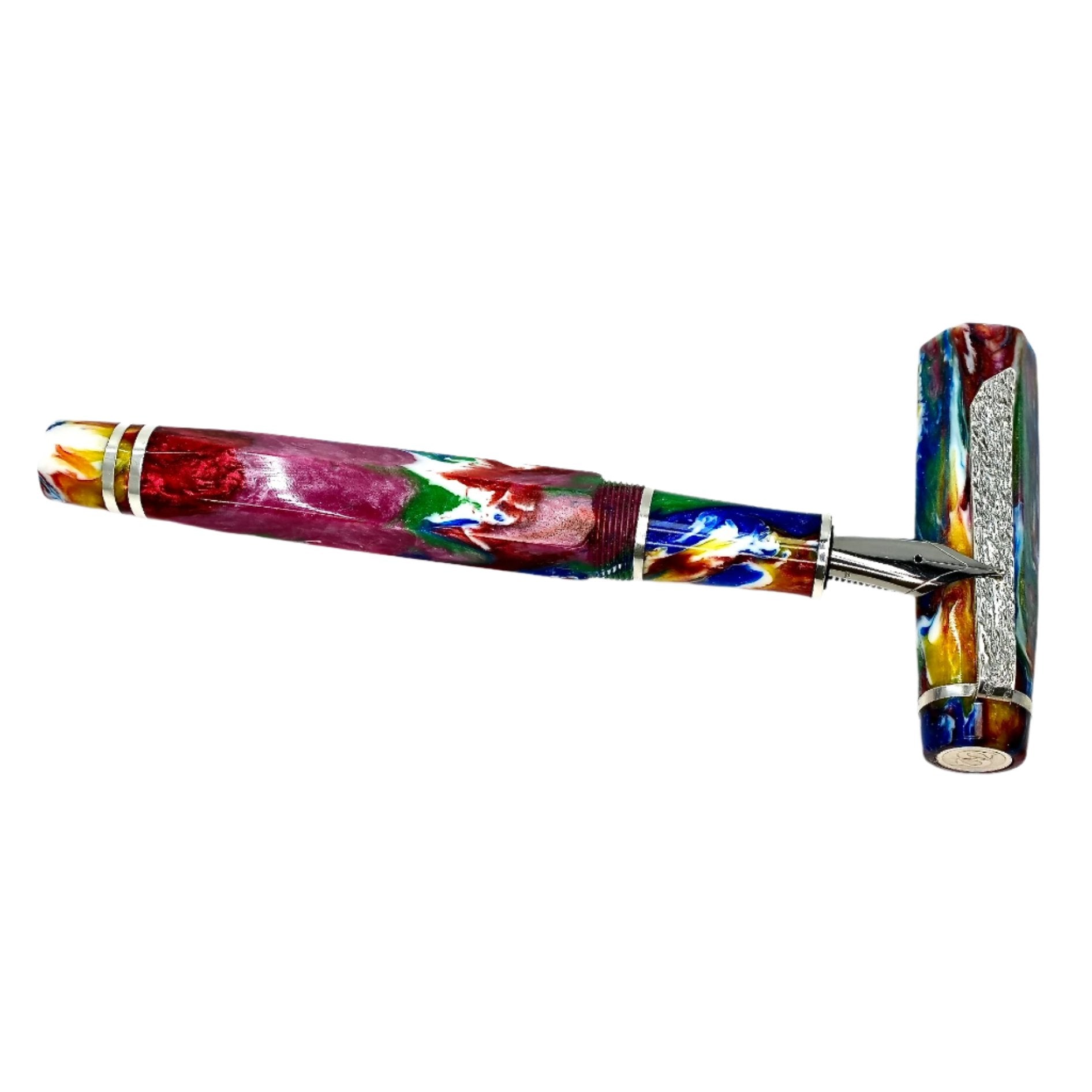 Hexagon fitted with a polished steel Jowo nib size 6. PEN SIZE: Approximately is 145m/m long including cap. 135m/m nib to body end. Body diameter 15m/m with a 13m/m thread. Cap diameter 16m/m. Nib make fitted is a Jowo size six polished steel medium tip other tip sizes available at no extra cost extra fine, fine, broad. The pen comes with a Schmidt K5 ink converter, other nibs are available; please contact john@silverburlpens.com to discuss alternatives and prices. I`ll be pleased to offer advice. A totally hand crafted pen including all the silver work.
