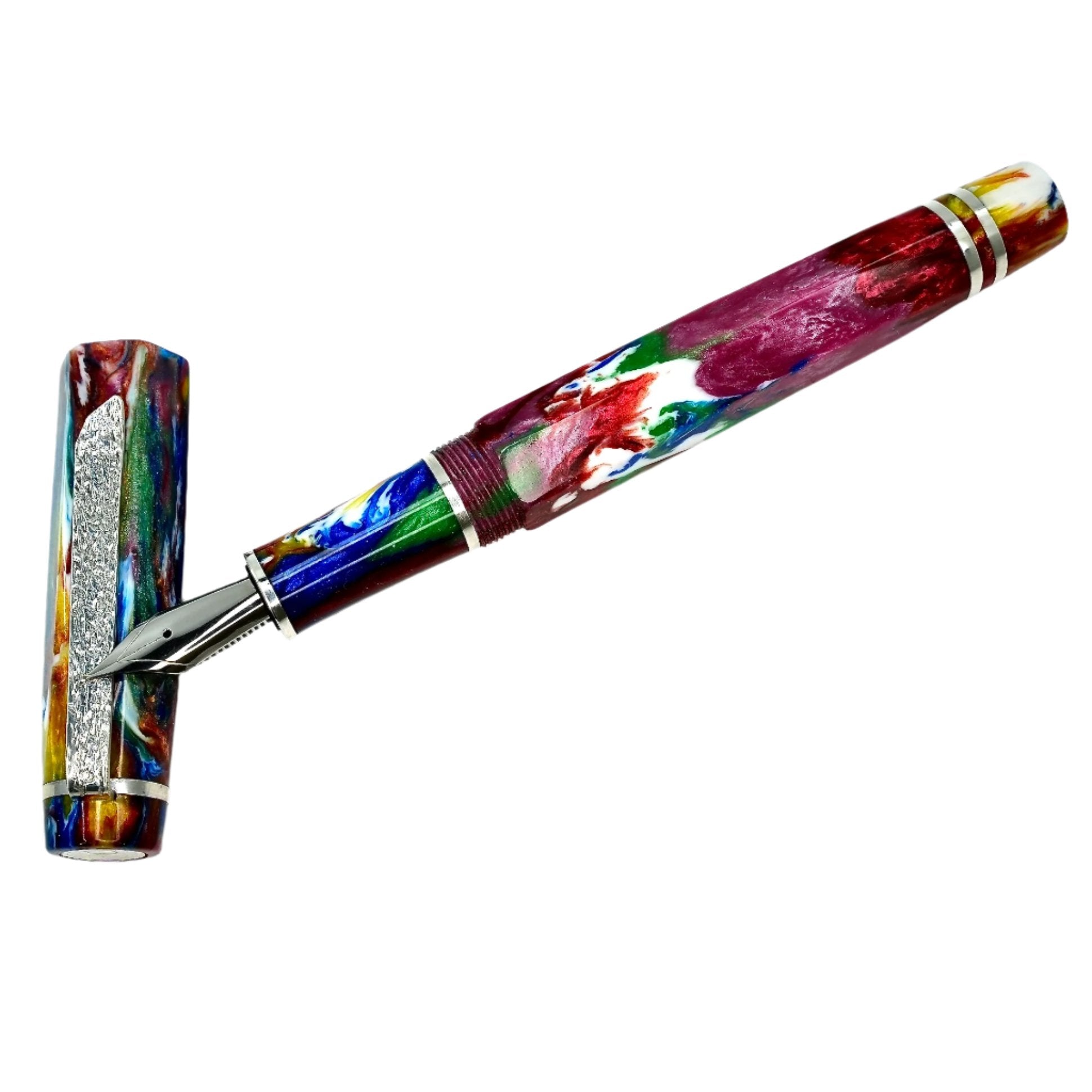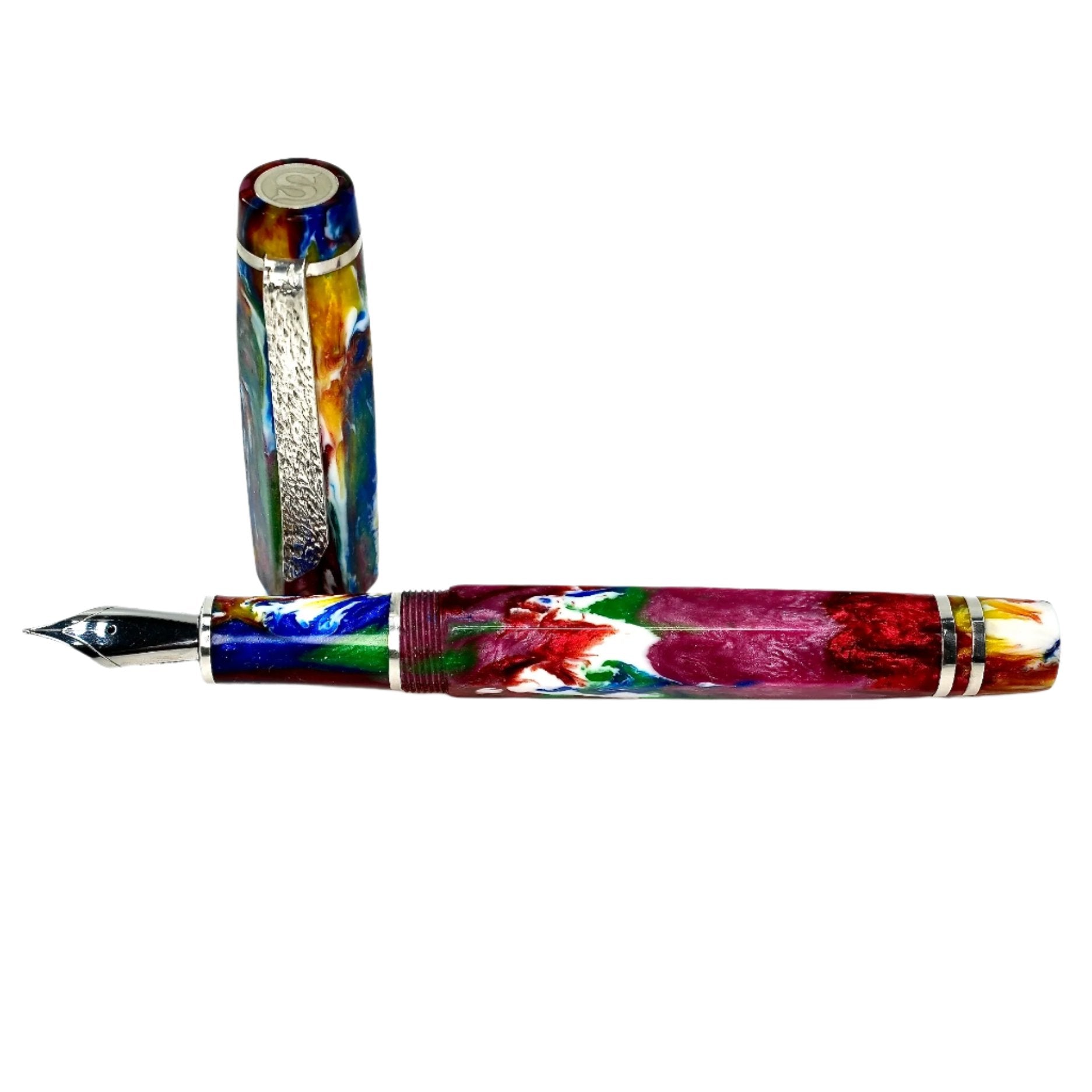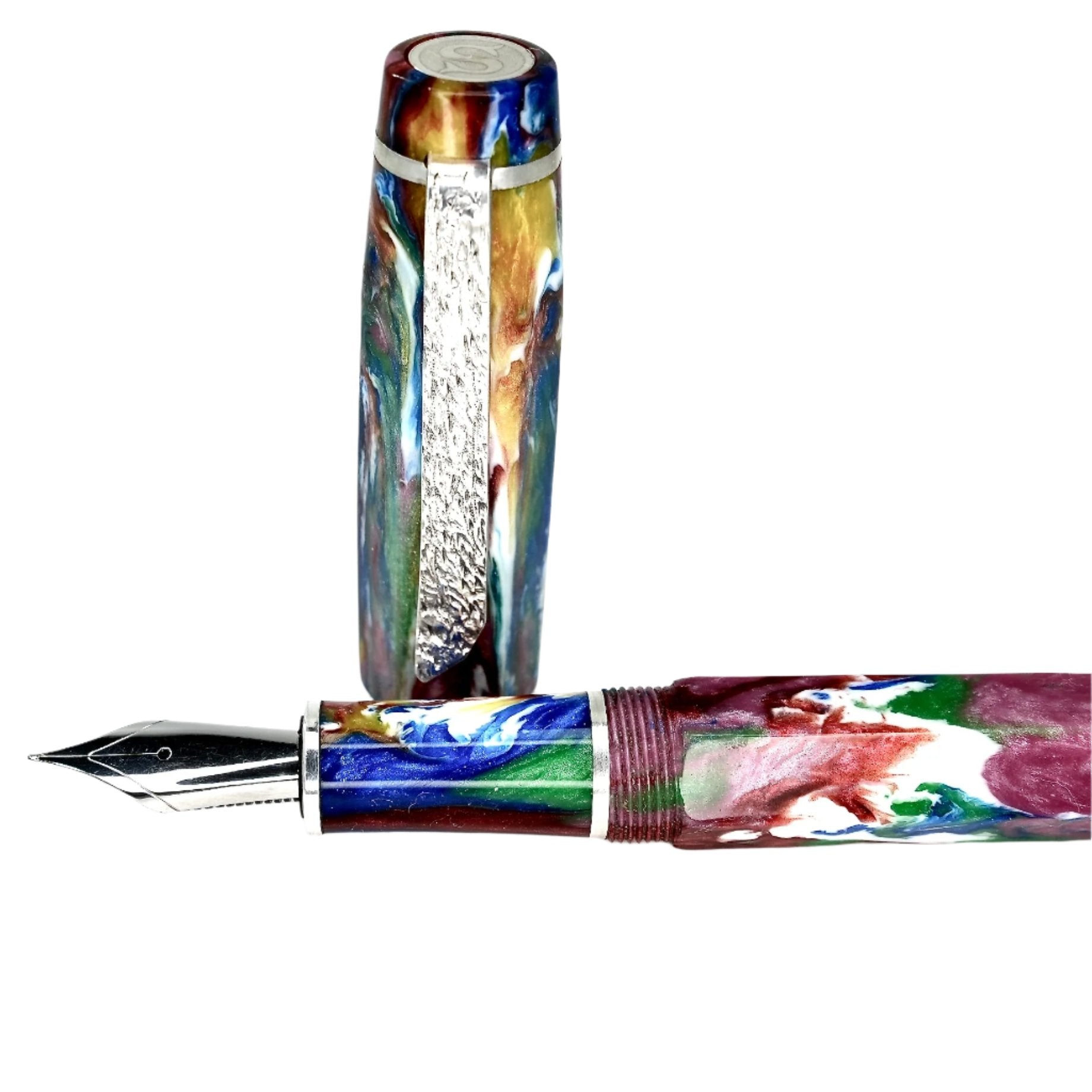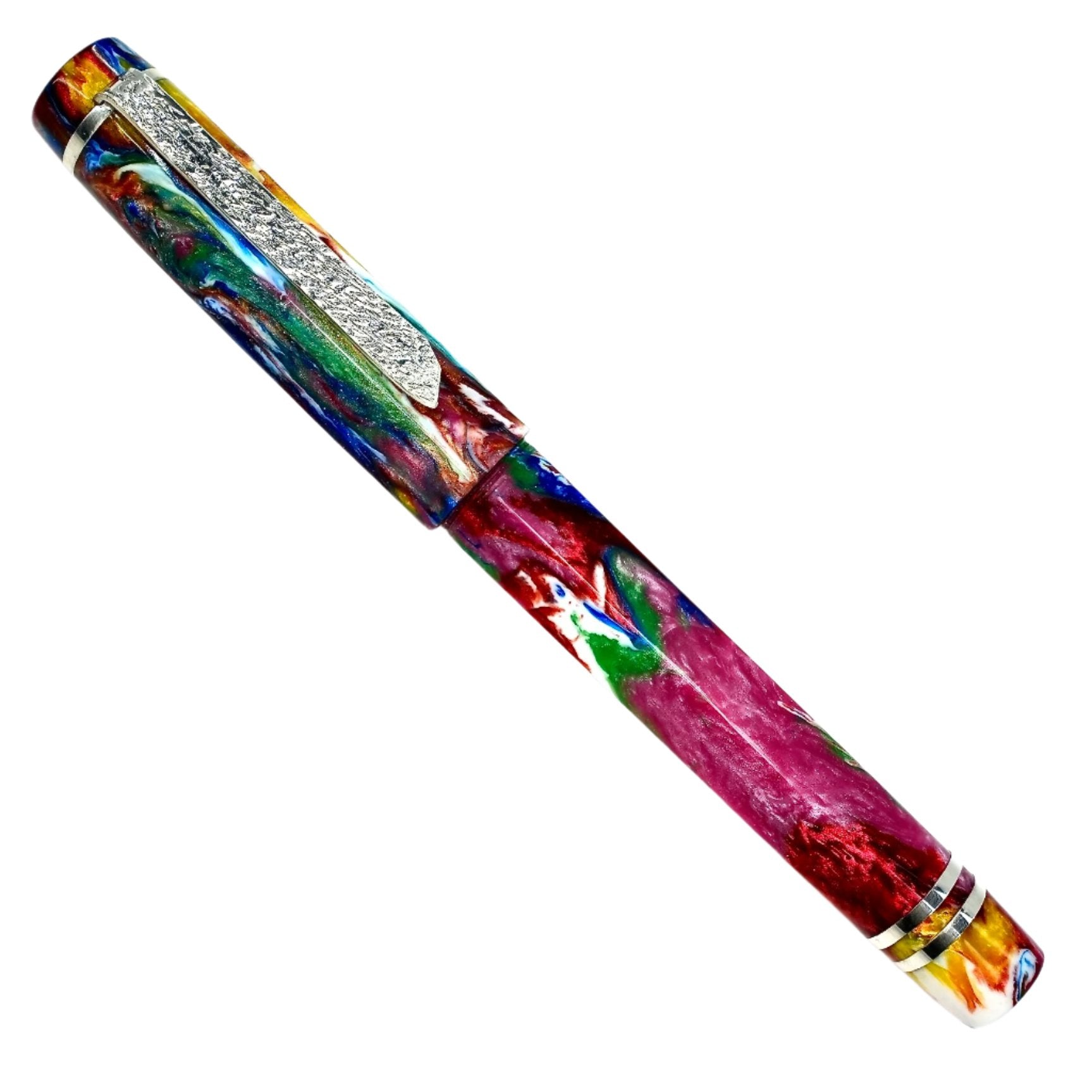 Hexagon fitted with a polished steel Jowo nib size 6. PEN SIZE: Approximately is 145m/m long including cap. 135m/m nib to body end. Body diameter 15m/m with a 13m/m thread. Cap diameter 16m/m. Nib make fitted is a Jowo size six polished steel medium tip other tip sizes available at no extra cost extra fine, fine, broad. The pen comes with a Schmidt K5 ink converter, other nibs are available; please contact john@silverburlpens.com to discuss alternatives and prices. I`ll be pleased to offer advice. A totally hand crafted pen including all the silver work.