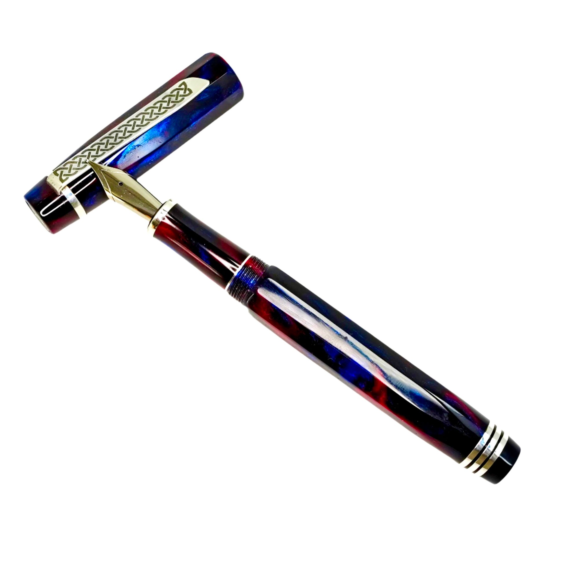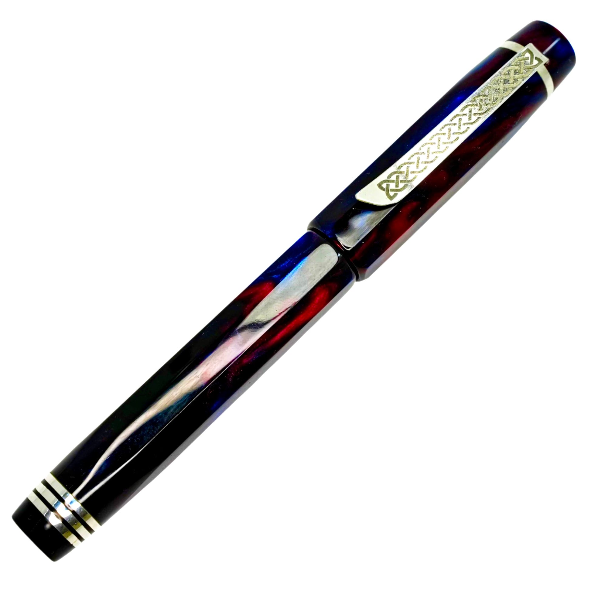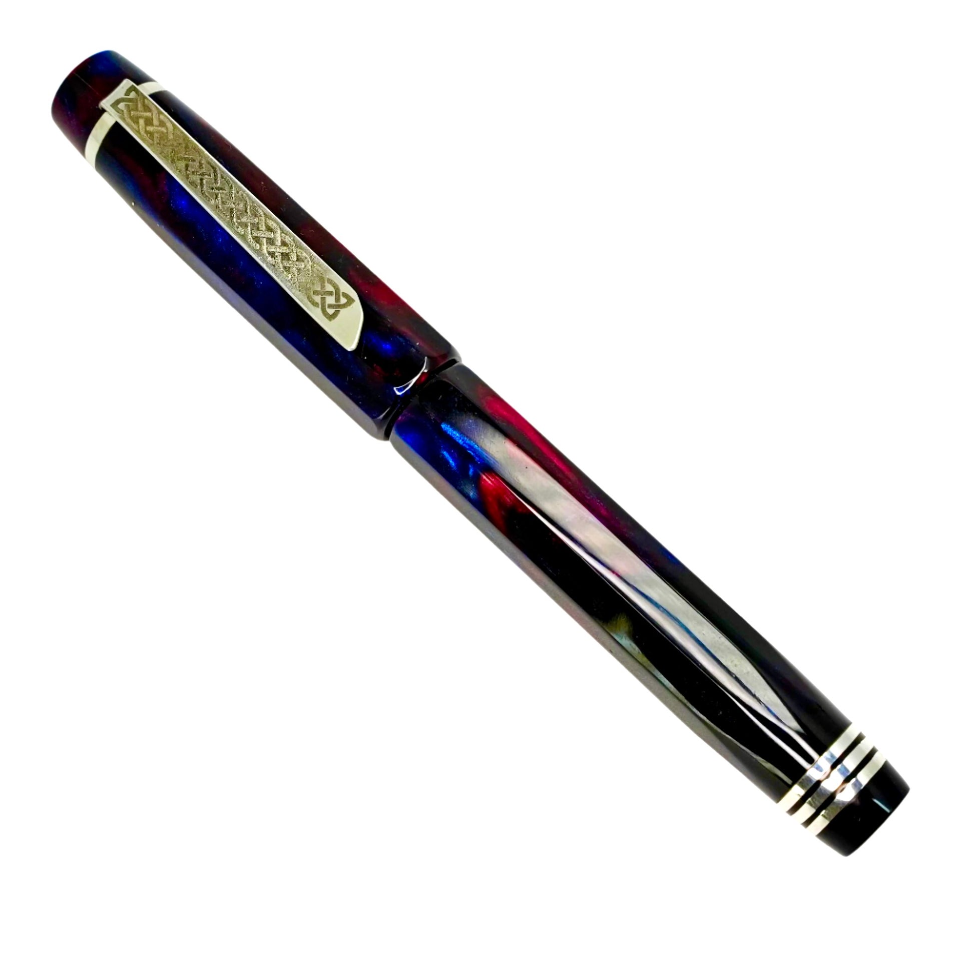 Introducing Blushing Blue Nonagon, a totally hand crafted pen fitted with a polished steel Jowo nib size 6. This pen measures approximately 145m/m long including cap, 135m/m nib to body end, with a body diameter of 15m/m and a cap diameter of 16m/m. It comes with a Schmidt K5 ink converter, and other nibs are available upon request. The silver used is Argentium .940, whiter and brighter than traditional .925 sterling and much more tarnish resistant. Argentium is hypoallergenic and has antibacterial properties, and does not contain nickel.