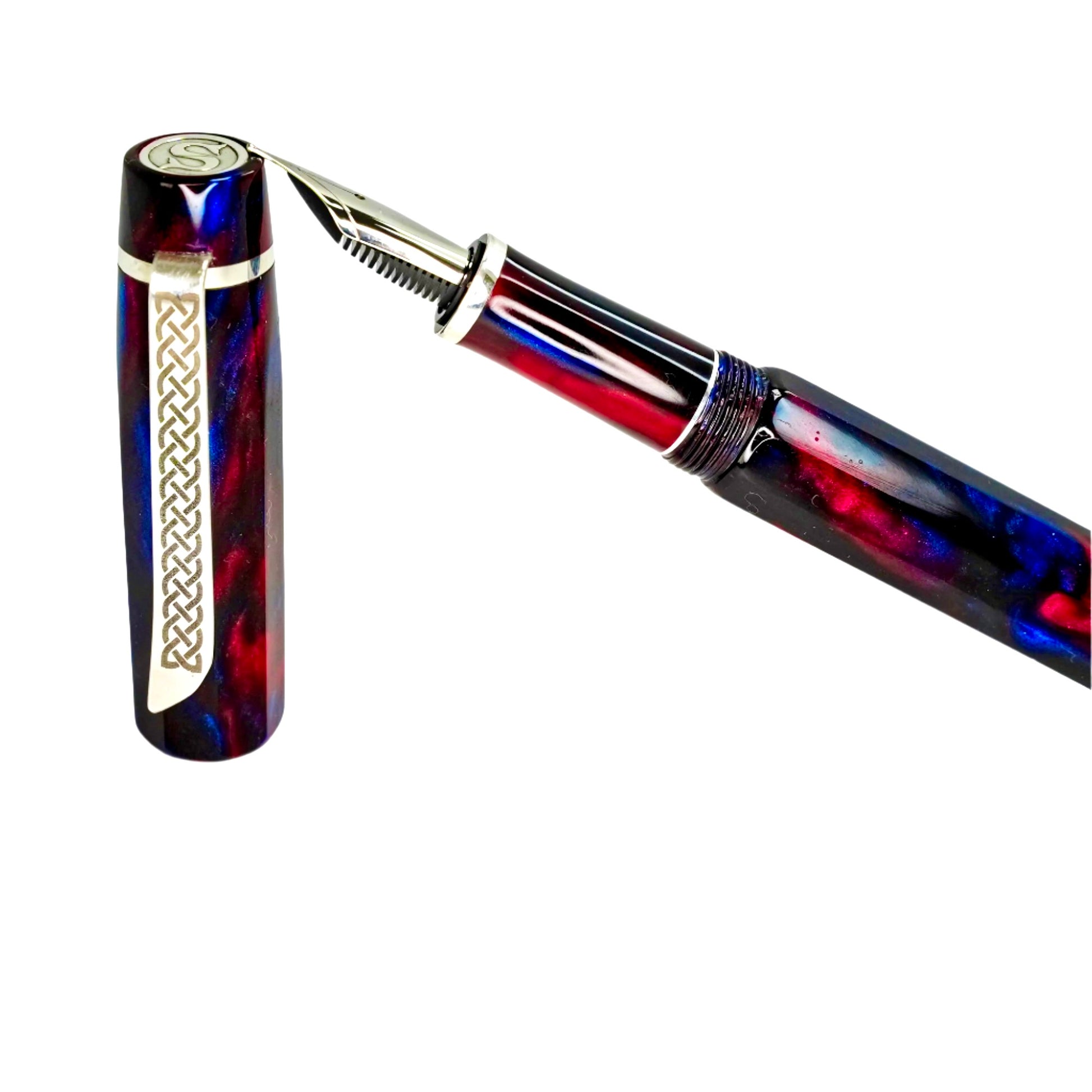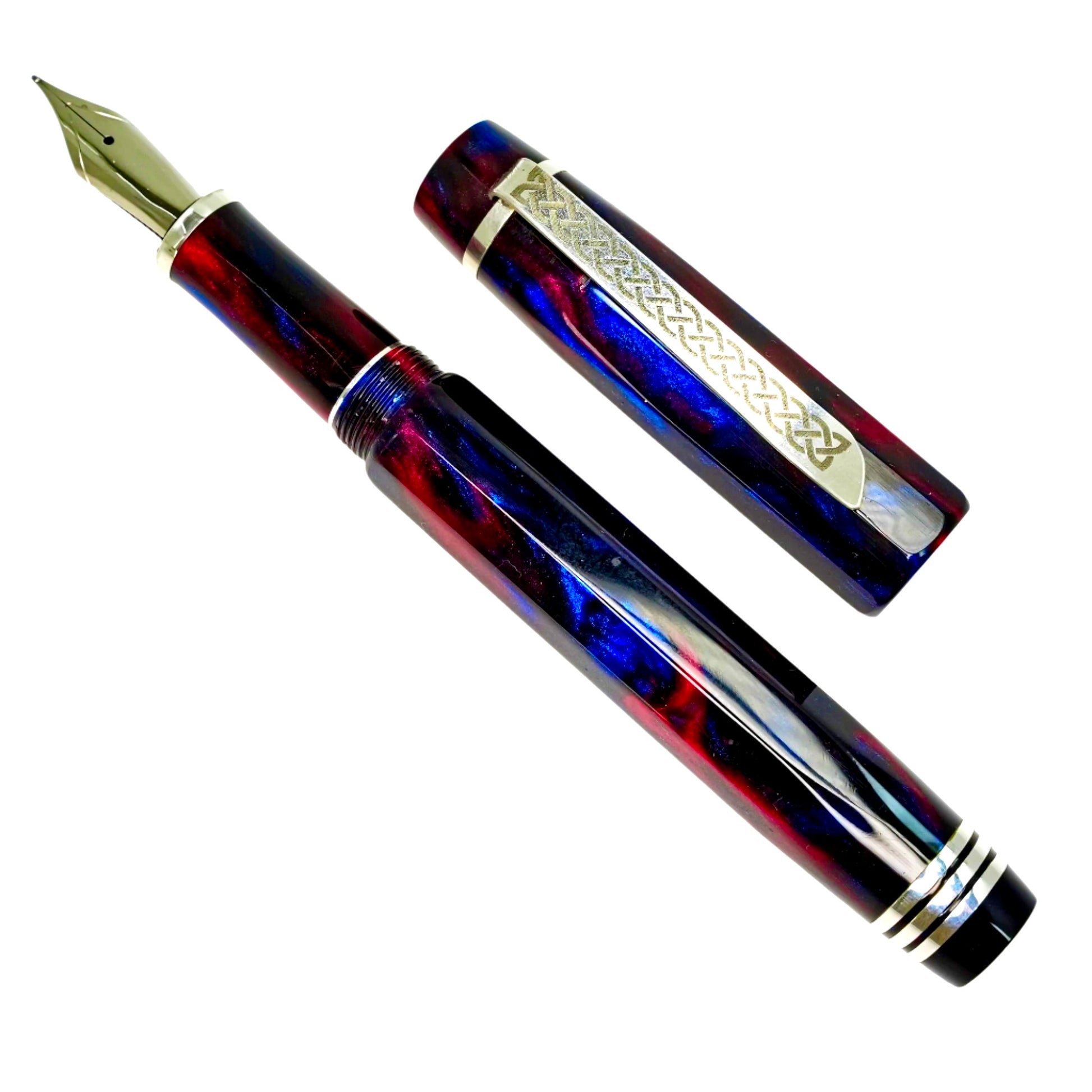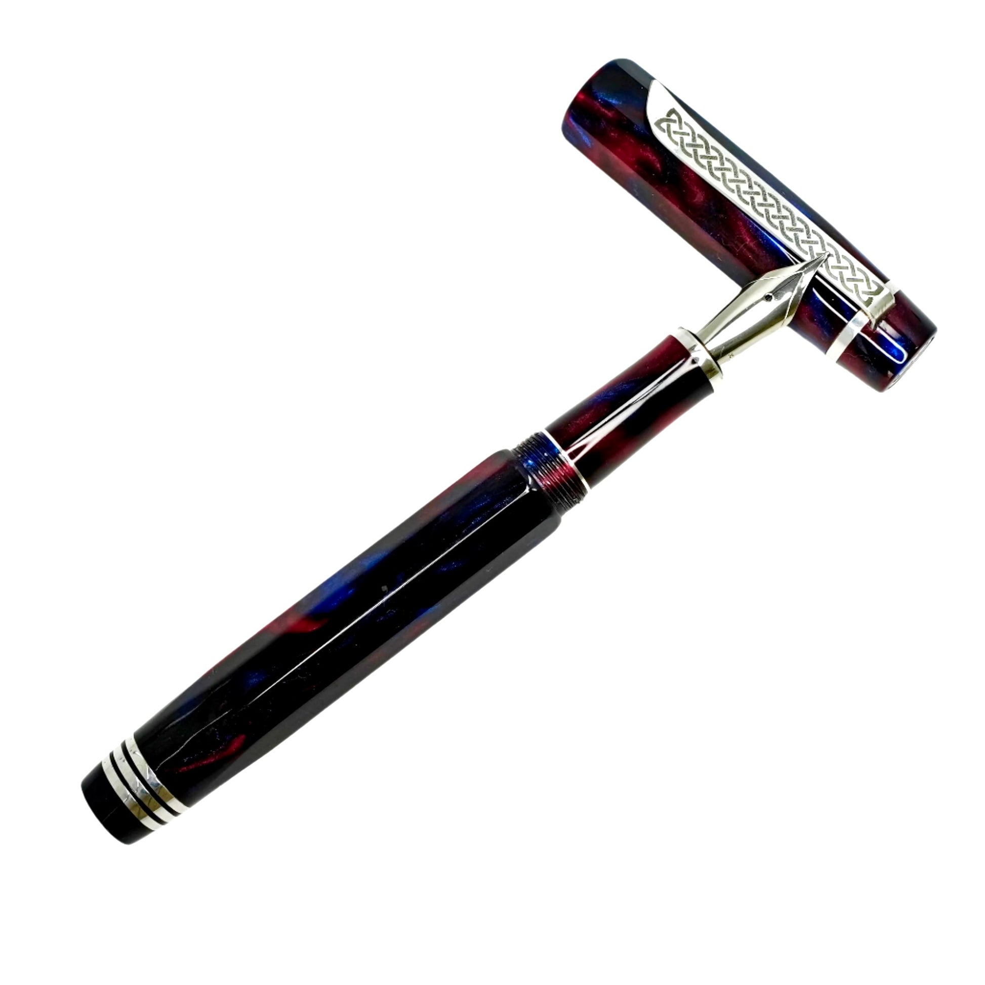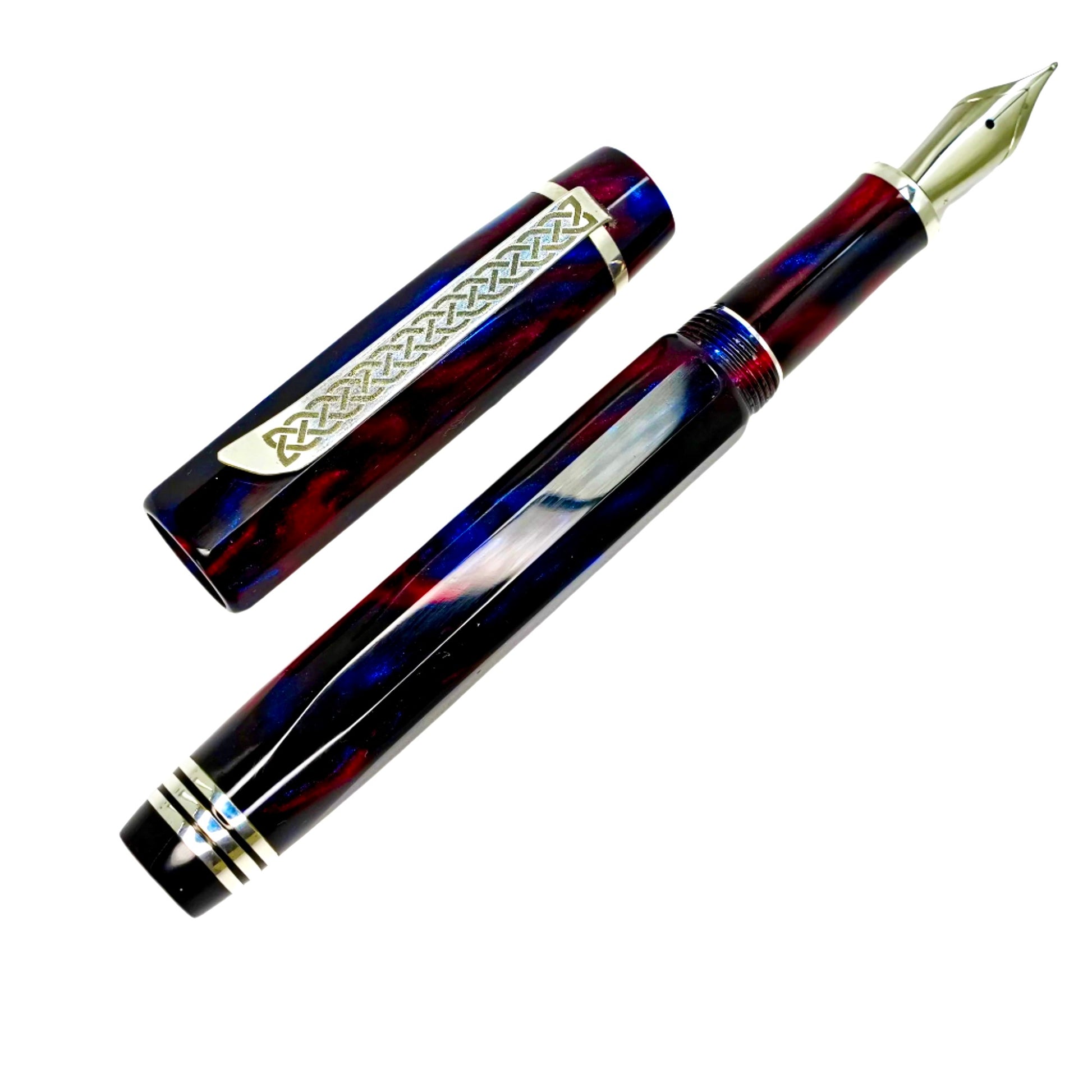 Introducing Blushing Blue Nonagon, a totally hand crafted pen fitted with a polished steel Jowo nib size 6. This pen measures approximately 145m/m long including cap, 135m/m nib to body end, with a body diameter of 15m/m and a cap diameter of 16m/m. It comes with a Schmidt K5 ink converter, and other nibs are available upon request. The silver used is Argentium .940, whiter and brighter than traditional .925 sterling and much more tarnish resistant. Argentium is hypoallergenic and has antibacterial properties, and does not contain nickel.