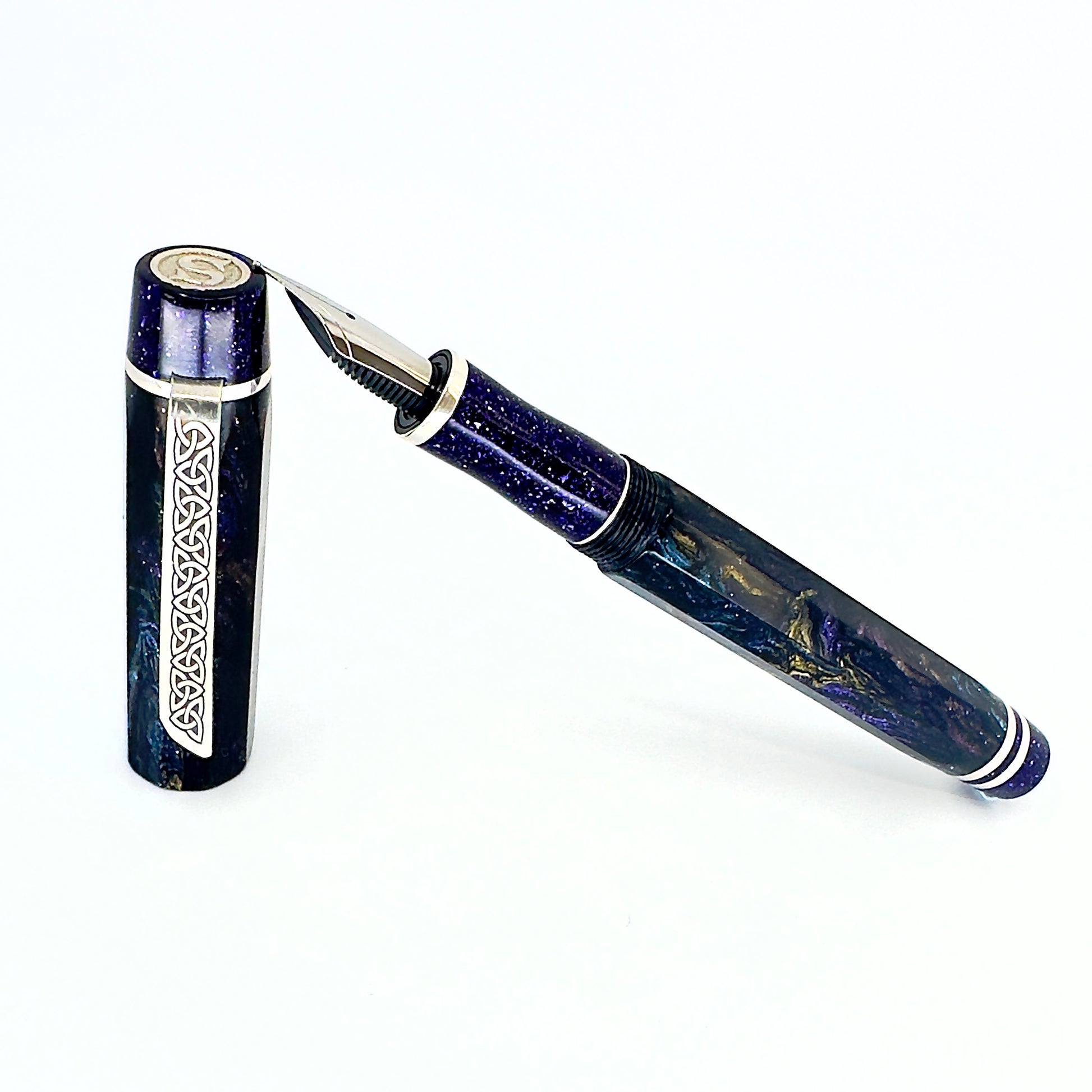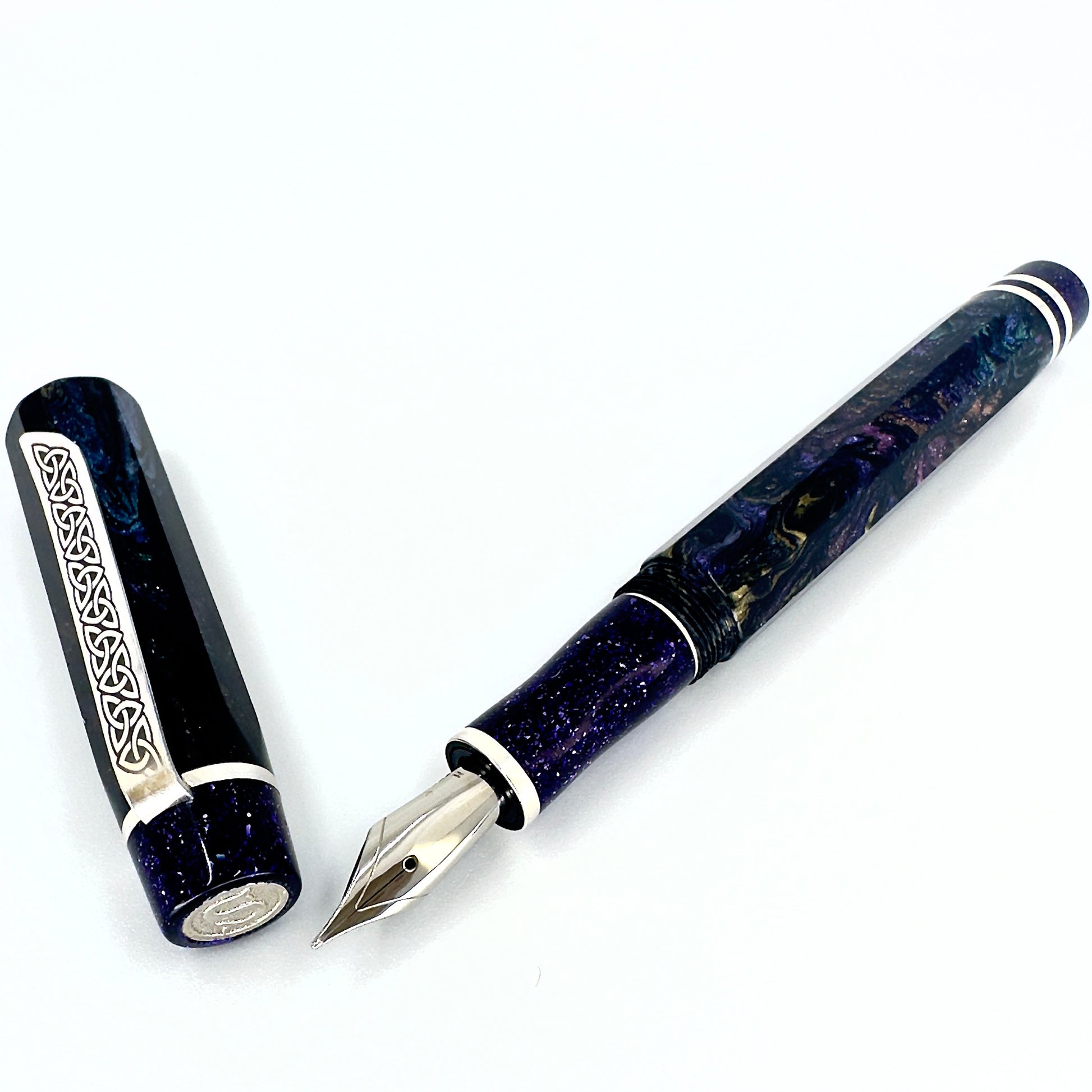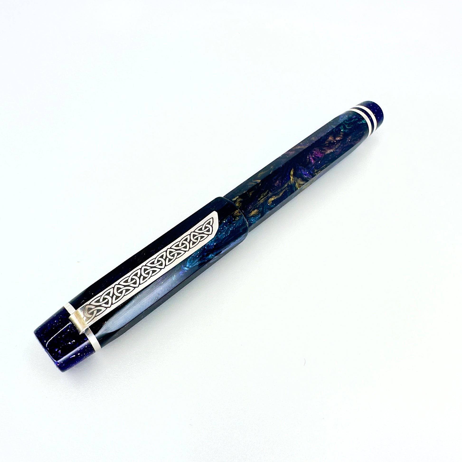 The Midnight Oil Nonagon is a totally hand crafted pen fitted with a polished steel Jowo nib size 6. It measures approximately 145m/m long including cap and 135m/m nib to body end. The body diameter is 15.5m/m with a 13m/m thread and the cap diameter is 16.5m/m. The pen comes with any nib tip size and Schmidt K5 ink converter, other nib options available. The silver used is Argentium .940, whiter and brighter than traditional .925 sterling and much more tarnish resistant. Argentium Silver is hypoallergenic and is well-suited for those who are unable to wear traditional Sterling silver jewellery. Argentium also has antibacterial properties and does not contain nickel.