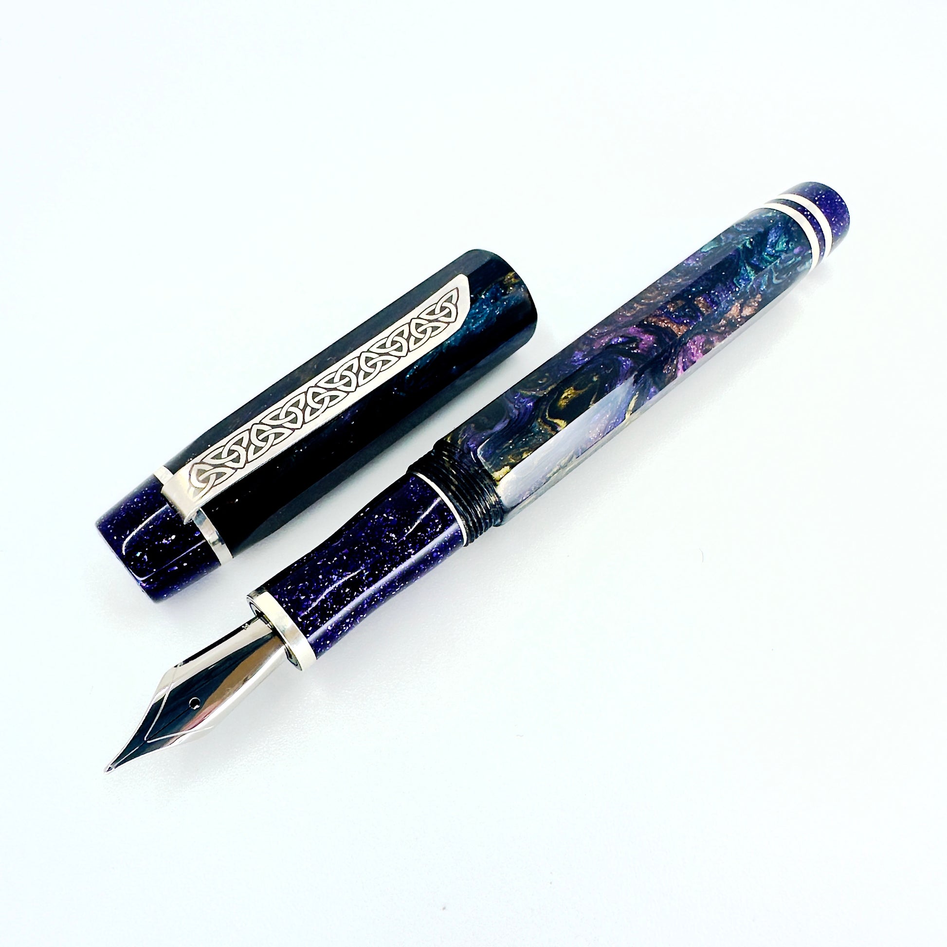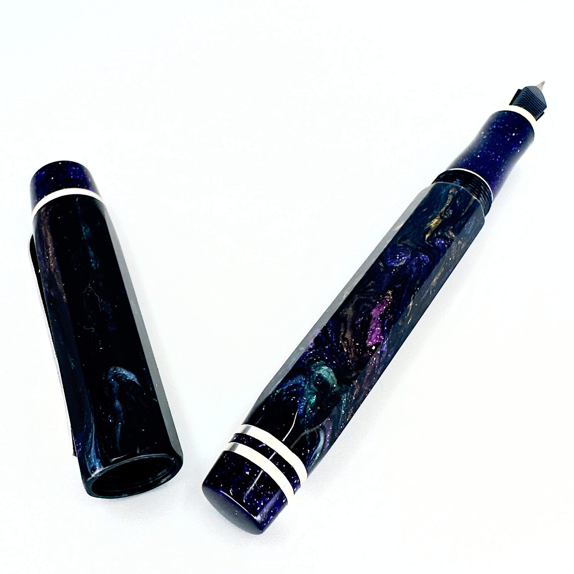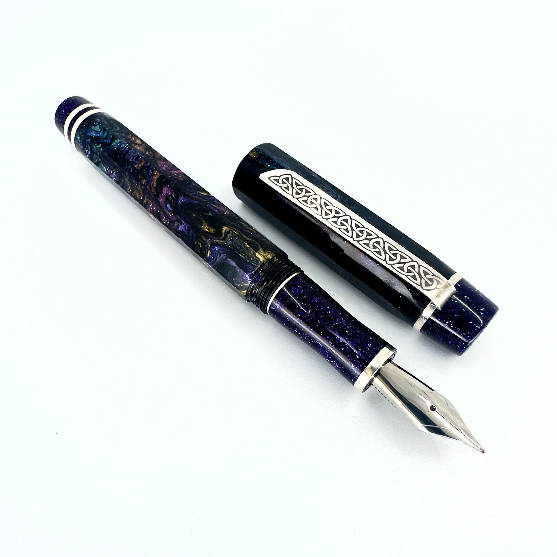 The Midnight Oil Nonagon is a totally hand crafted pen fitted with a polished steel Jowo nib size 6. It measures approximately 145m/m long including cap and 135m/m nib to body end. The body diameter is 15.5m/m with a 13m/m thread and the cap diameter is 16.5m/m. The pen comes with any nib tip size and Schmidt K5 ink converter, other nib options available. The silver used is Argentium .940, whiter and brighter than traditional .925 sterling and much more tarnish resistant. Argentium Silver is hypoallergenic and is well-suited for those who are unable to wear traditional Sterling silver jewellery. Argentium also has antibacterial properties and does not contain nickel.