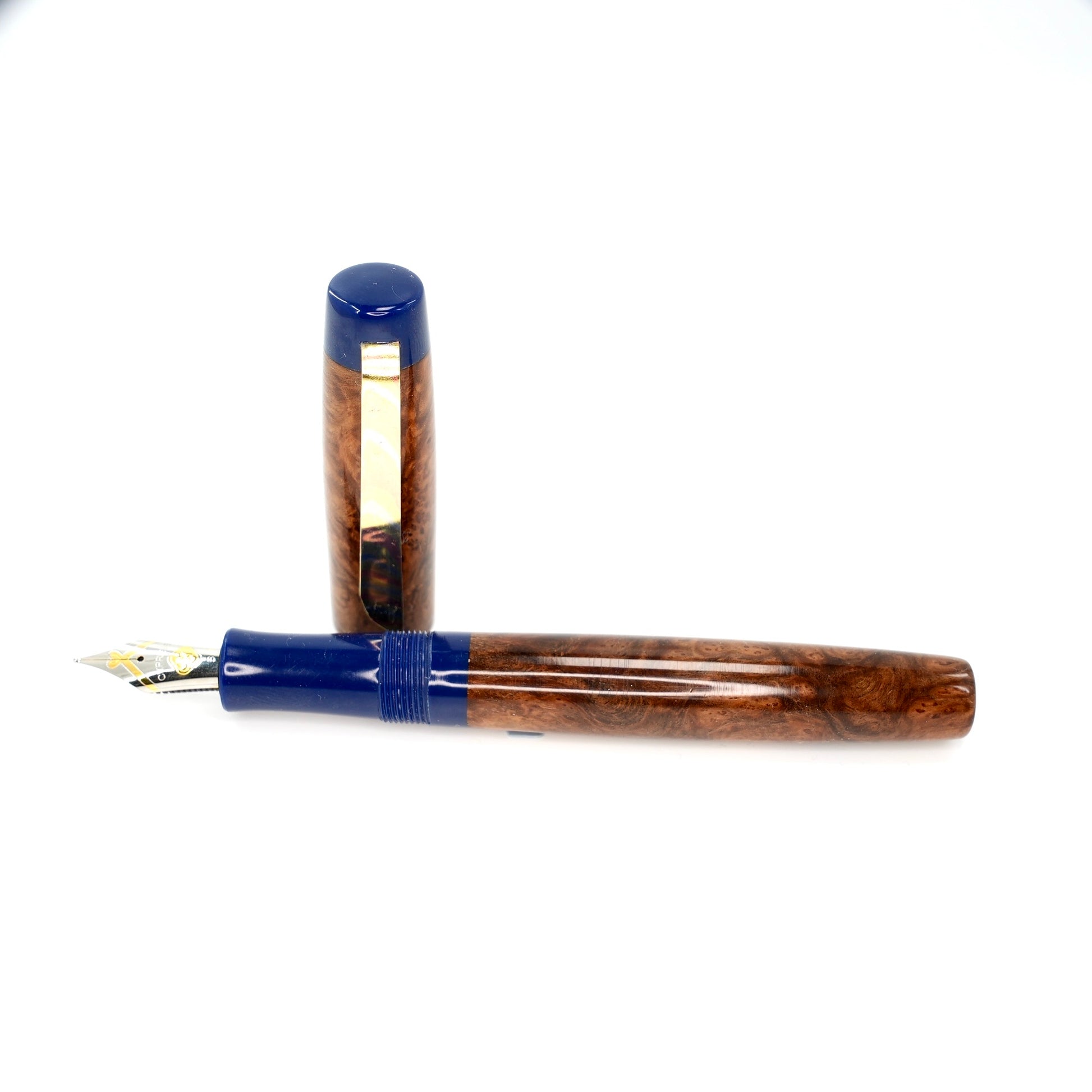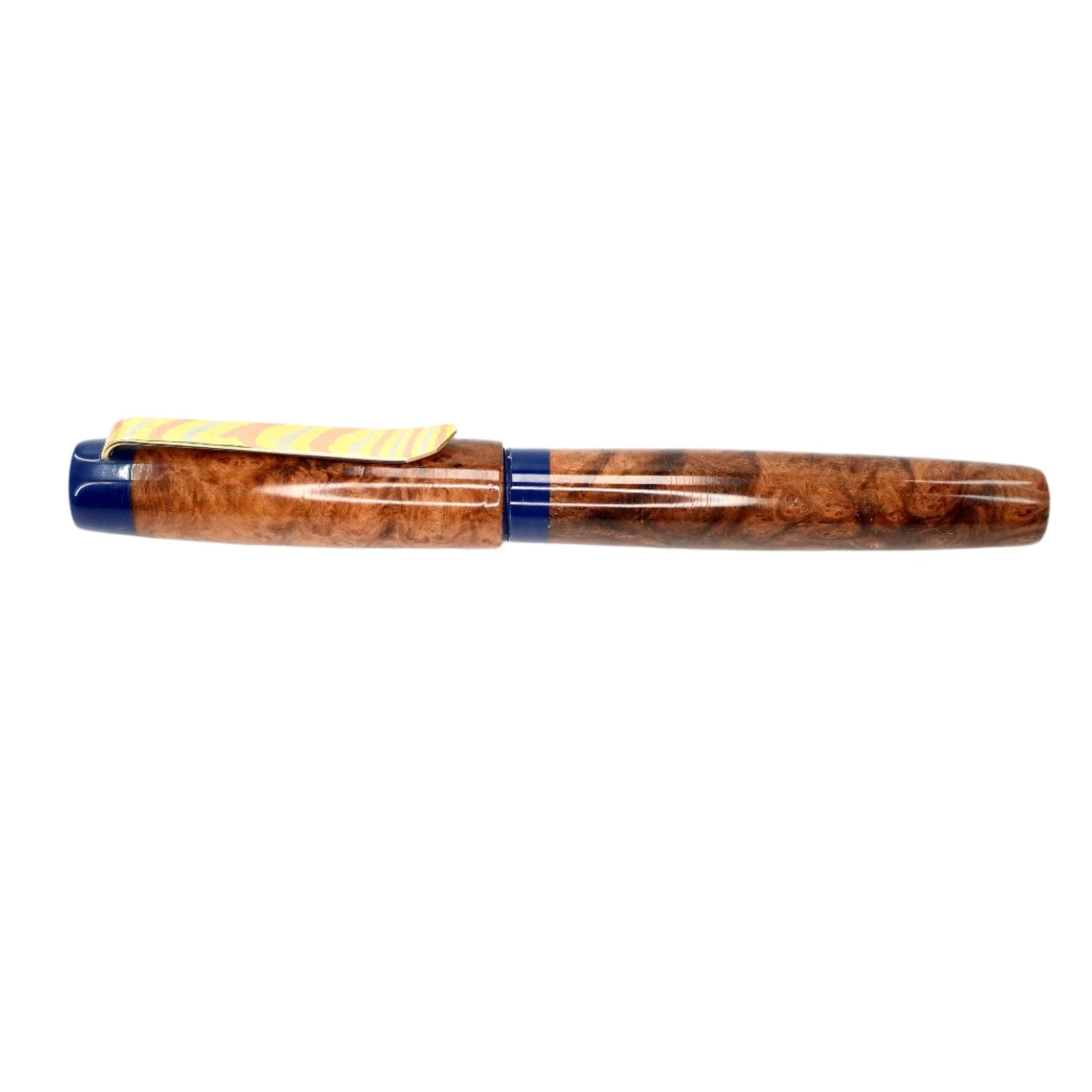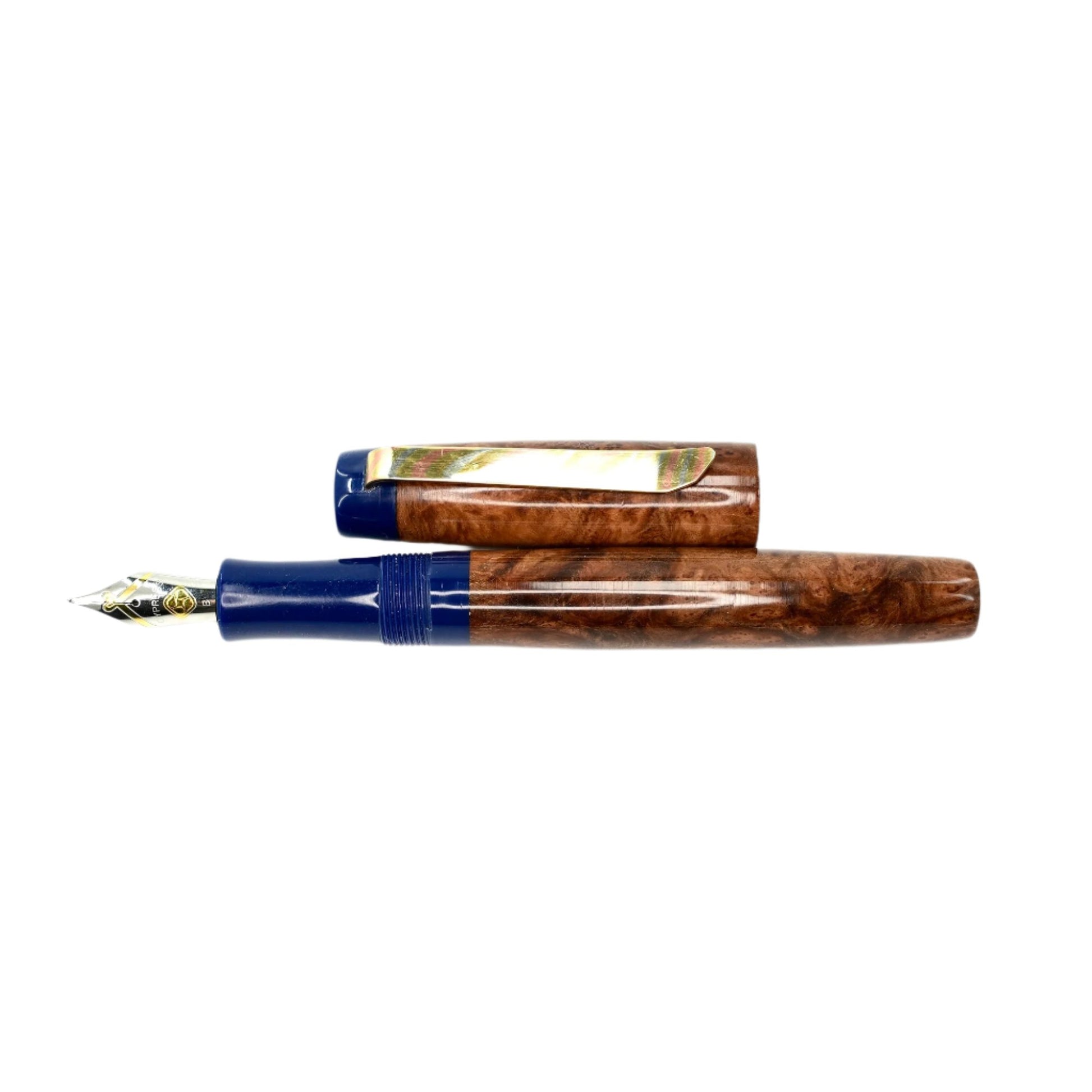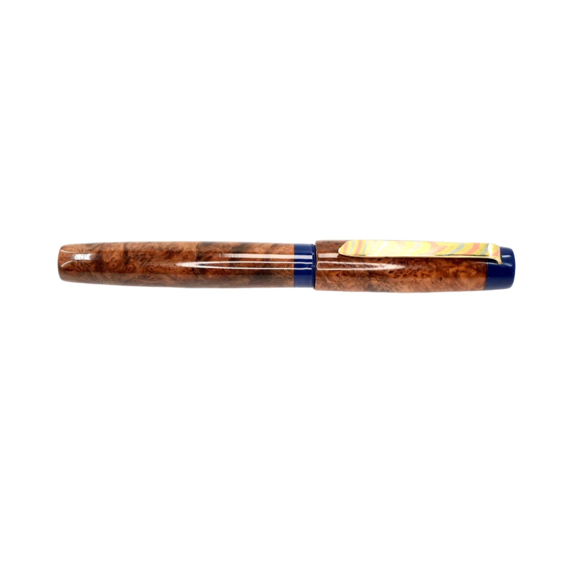 Norther Rock Gum Burl and midnight blue acrylic with a handmade Mokume Gain pocket clip, the exquisite beauty and exceptional craftsmanship with Silverburl pens. Our commitment to quality and durability is reflected in every aspect of this pen, from the elegant polished steel Jowo nib size 6 to the option to choose from various nib tip sizes. At 145m/m long including the cap and 135m/m from nib to body end, with a body diameter of 15m/m and a 14m/m thread, and a cap diameter of 16m/m, this pen is perfectly sized for comfortable writing. However, what truly makes this pen stand out is the use of Argentium .940 silver, known for its superior brightness and durability compared to traditional .925 sterling silver. Not only is it highly tarnish resistant, but it also has antibacterial properties and is free from nickel, making it an ideal choice for those with allergies or sensitive skin.