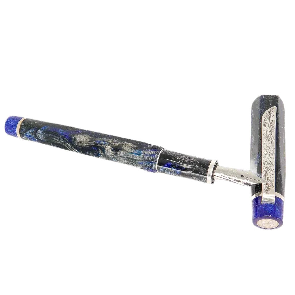 Queen City Hexagon with complimentary finials, fitted with a polished steel bock nib size 6. PEN SIZE: Approximately is 145m/m long including cap. 135m/m nib to body end. Body diameter 15m/m with a 13m/m thread. Cap diameter 16m/m. Nib make fitted is a Jowo size six polished steel medium tip other tip sizes available at no extra cost extra fine, fine, broad. The pen comes with a Schmidt K5 ink converter, other nibs are available; please contact john@silverburlpens.com to discuss alternatives and prices. I`ll be pleased to offer advice. A totally hand crafted pen including all the silver work.
