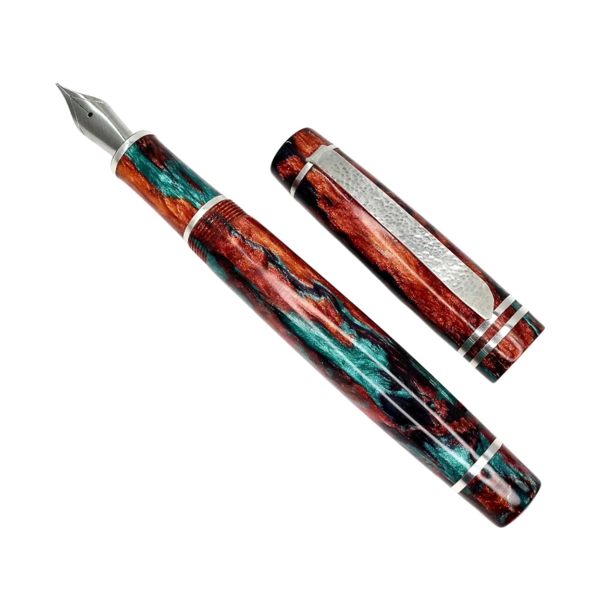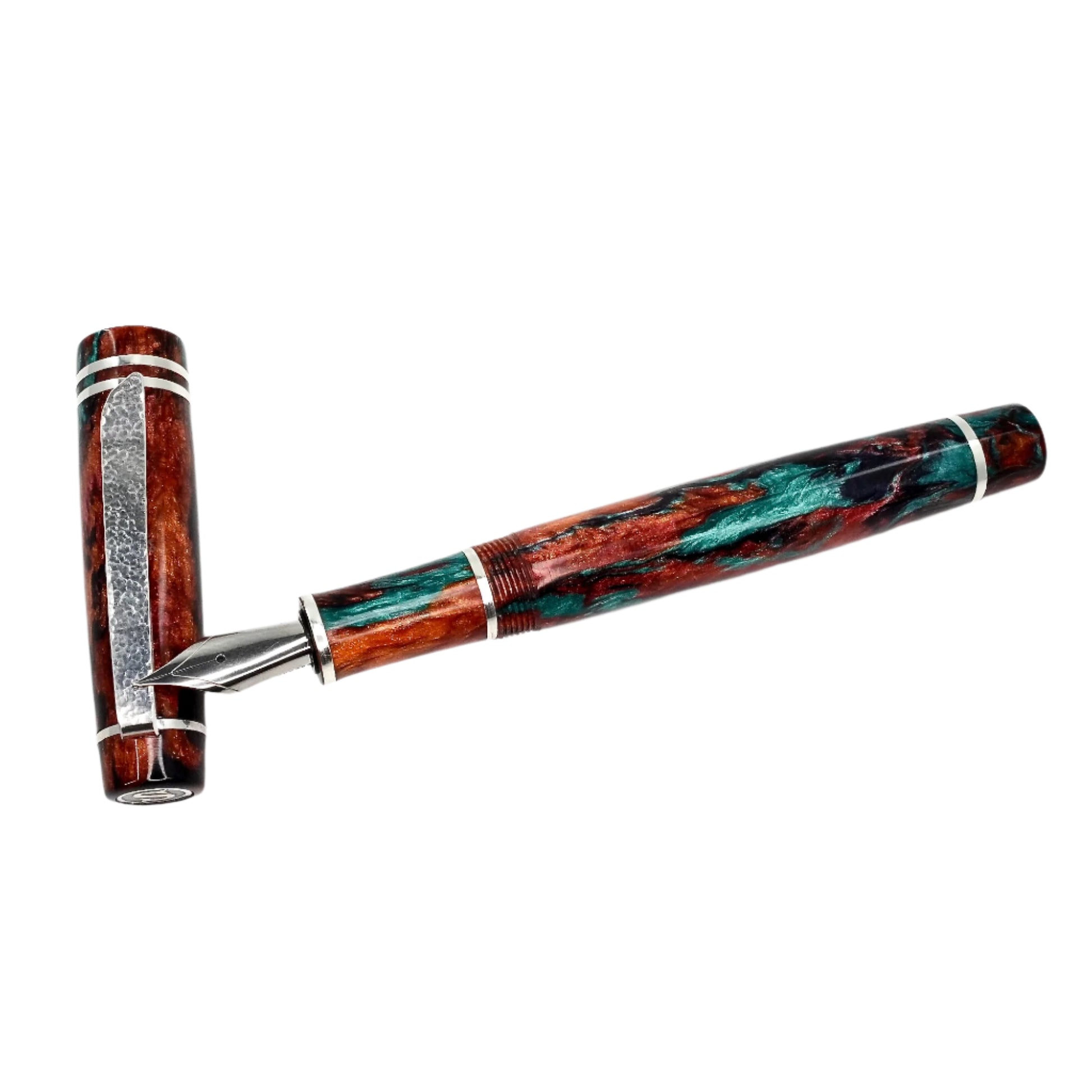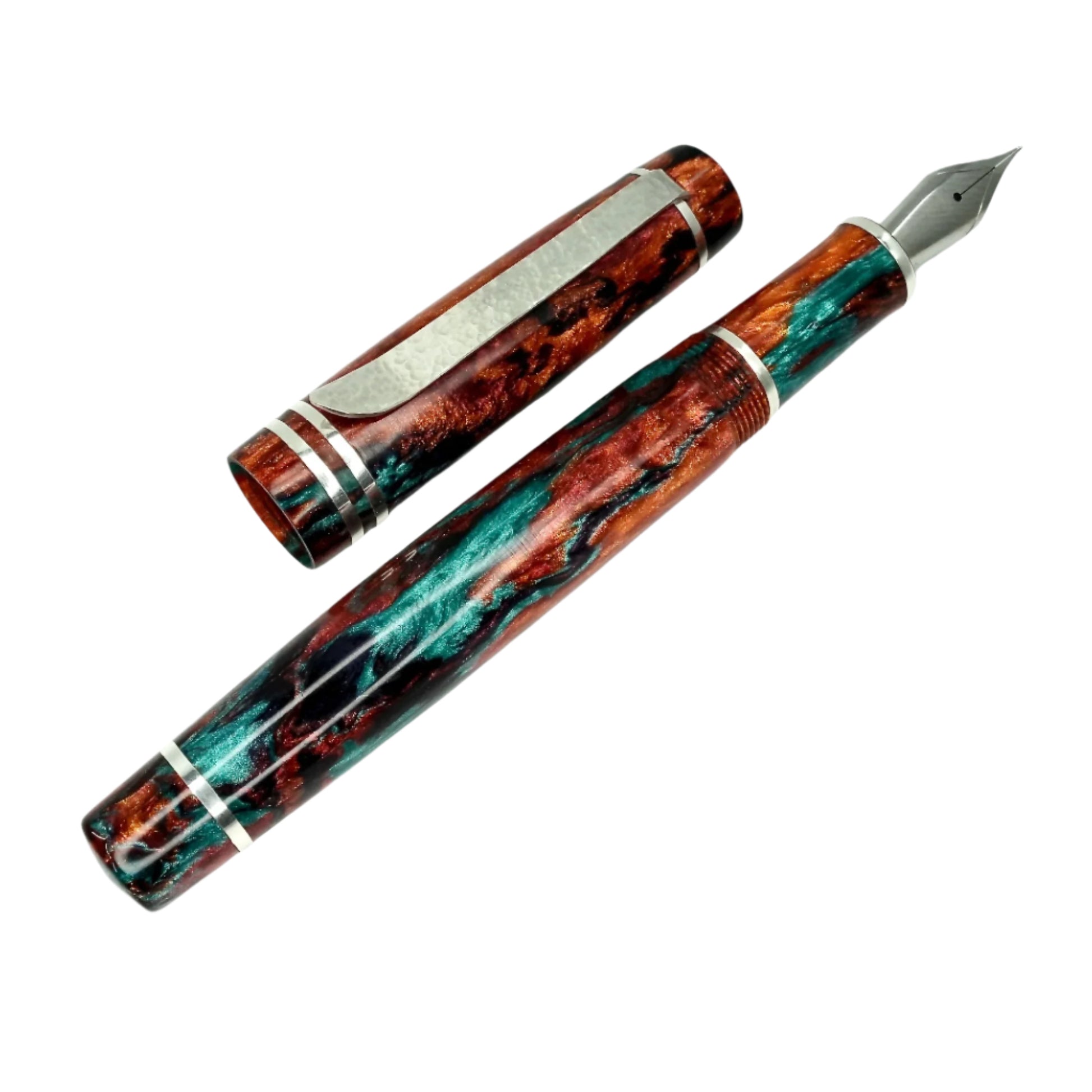 A pen made from material created by the Carolina pen co, It features a polished steel Jowo nib size 6 and comes with a Schmidt K5 ink converter. Other nib sizes are available upon request. The pen measures approximately 145m/m long including the cap, 135m/m from nib to body end, and has a body diameter of 15m/m with a 14m/m thread. The cap diameter is 16m/m.