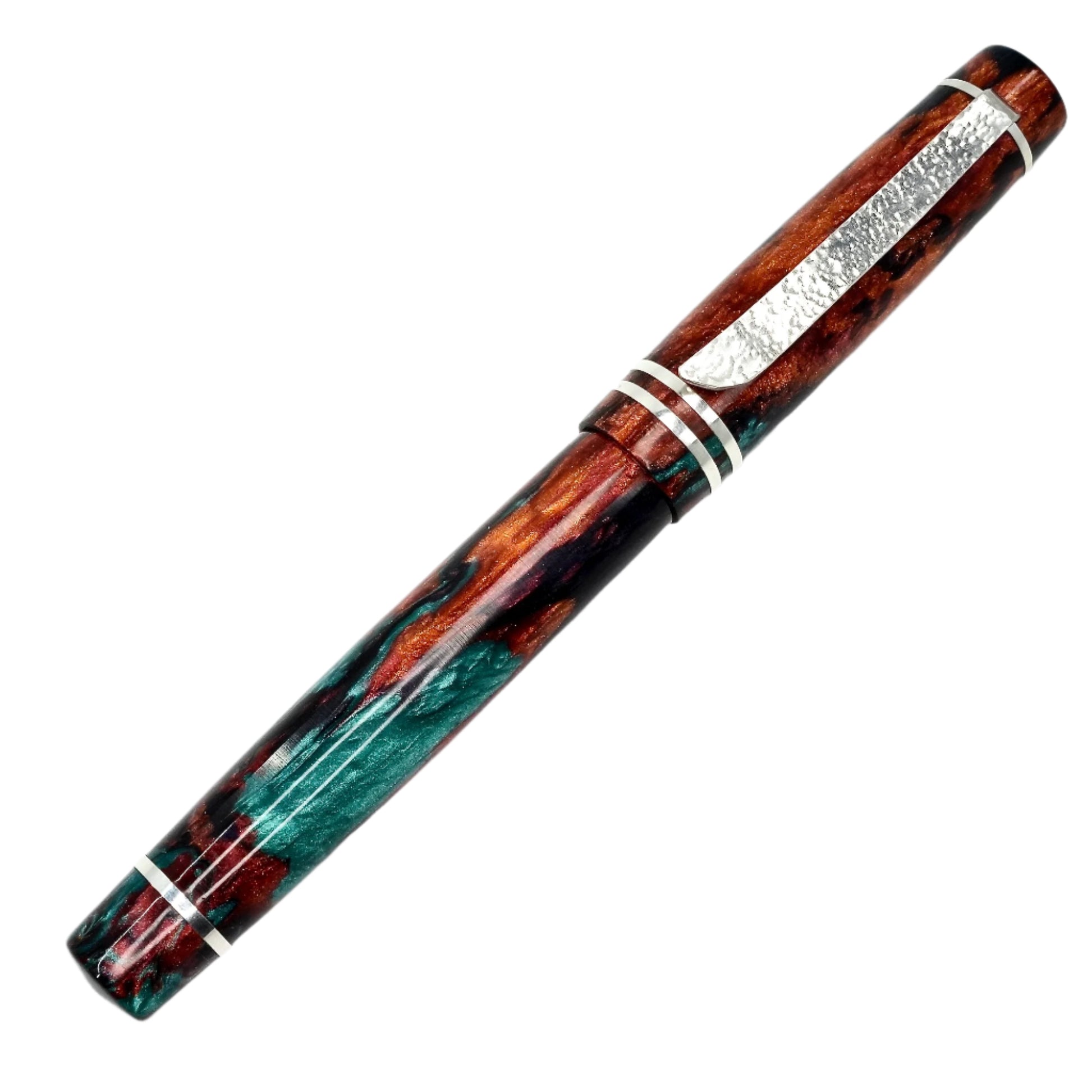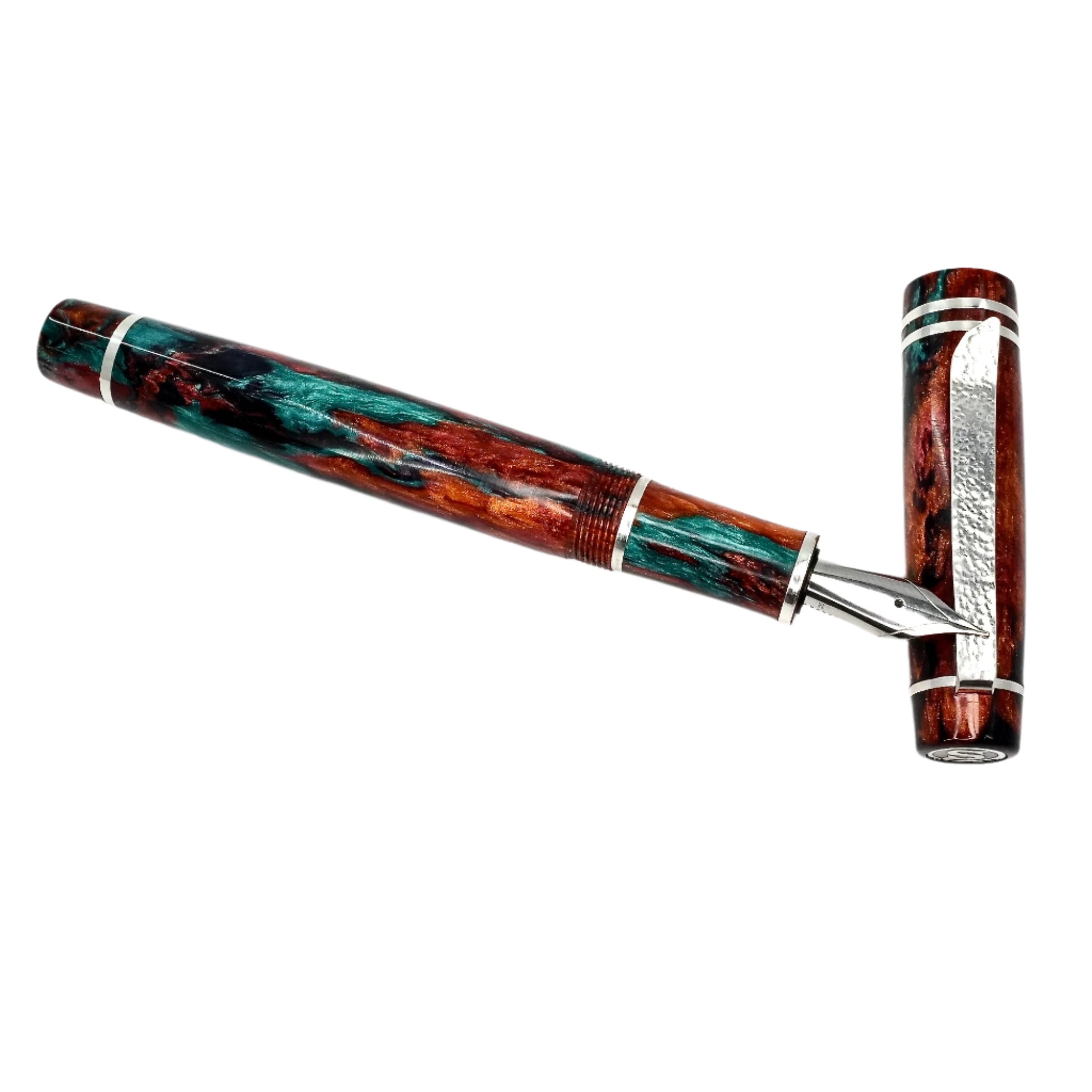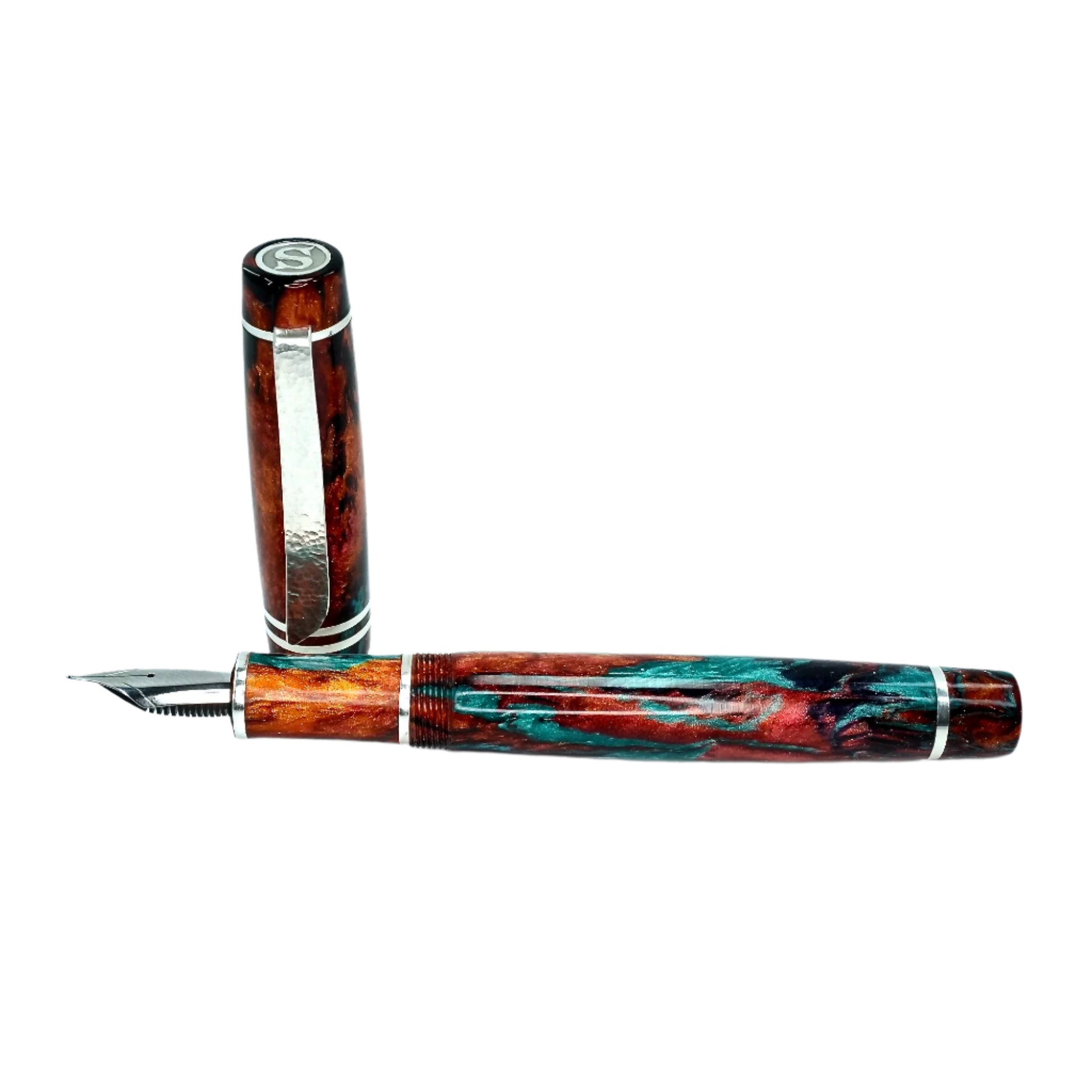 A pen made from material created by the Carolina pen co, It features a polished steel Jowo nib size 6 and comes with a Schmidt K5 ink converter. Other nib sizes are available upon request. The pen measures approximately 145m/m long including the cap, 135m/m from nib to body end, and has a body diameter of 15m/m with a 14m/m thread. The cap diameter is 16m/m.
