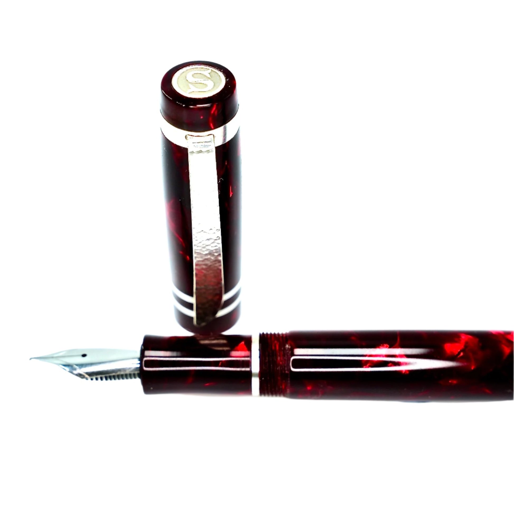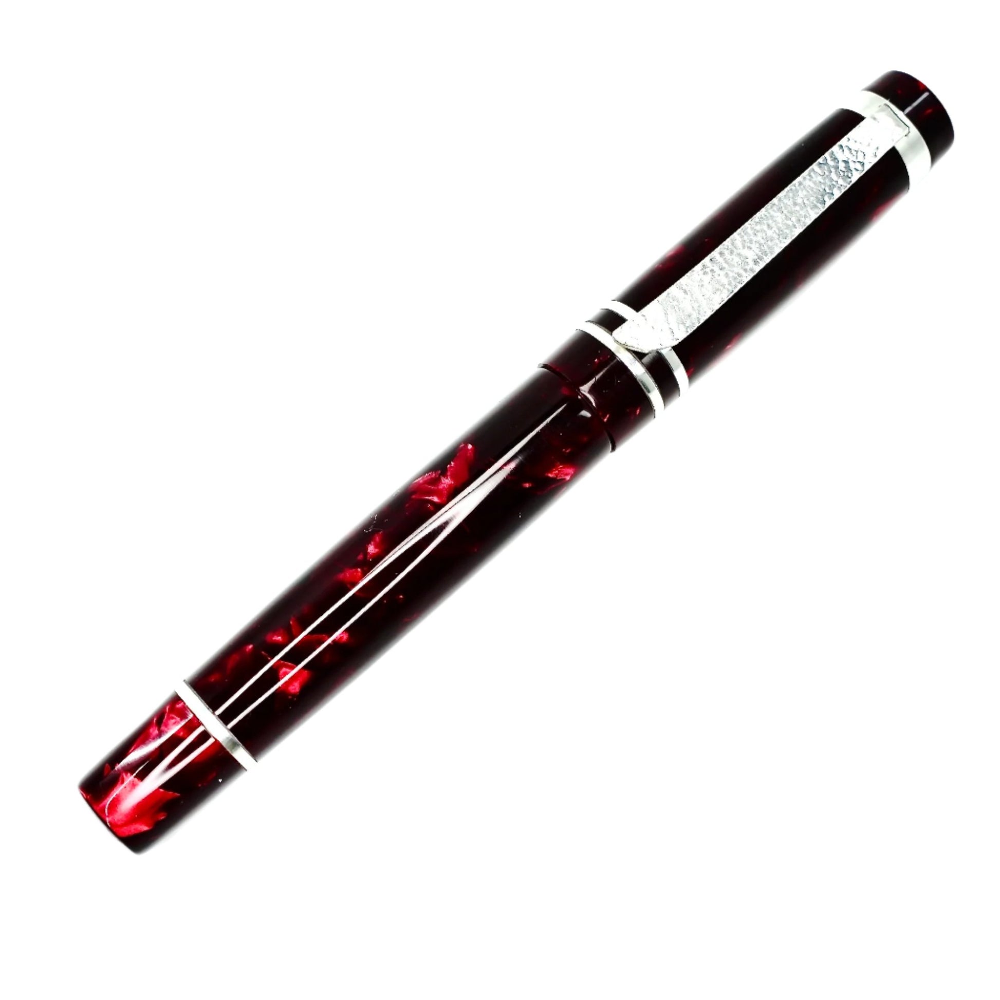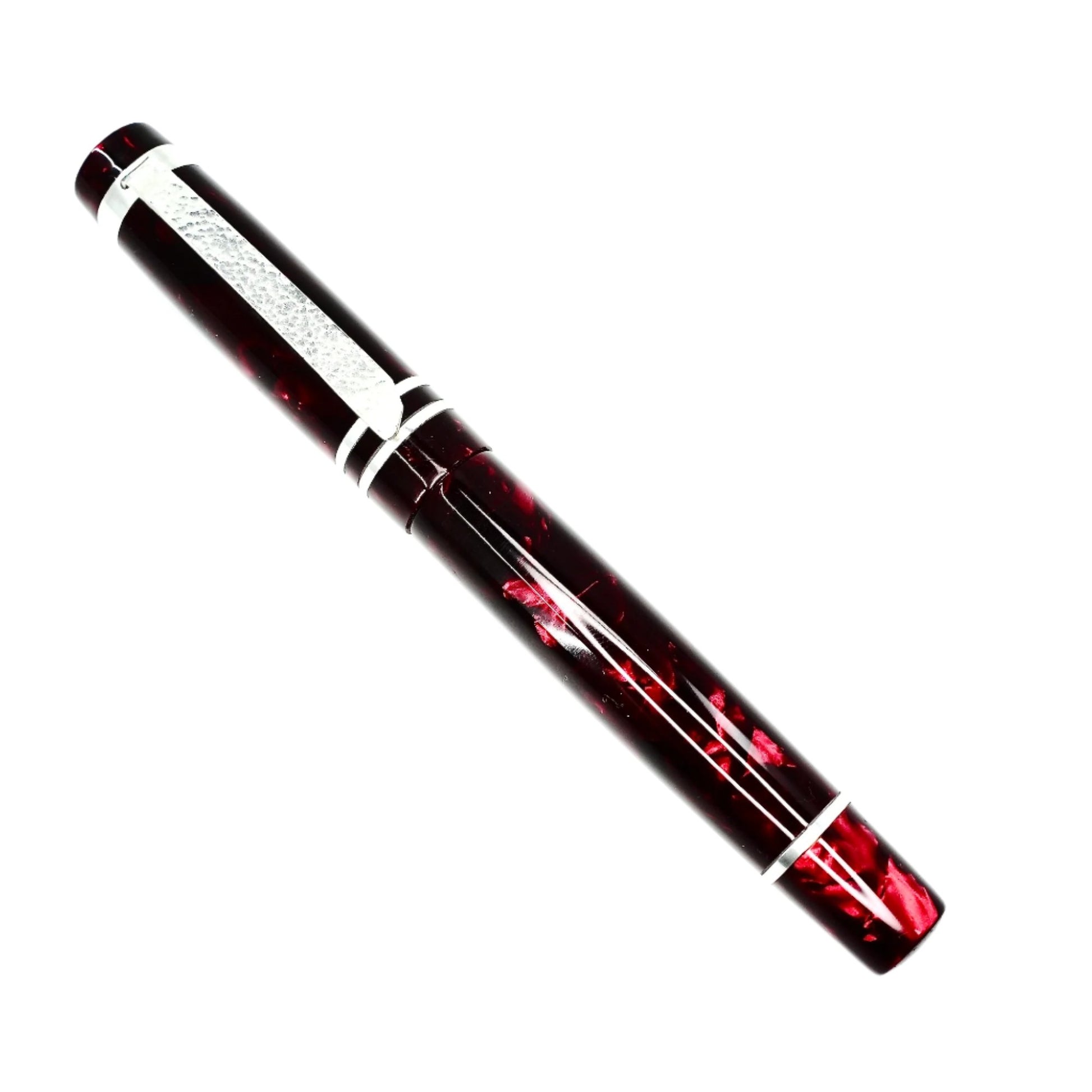 Indulge in the luxurious elegance of this Italian Celluloid pen enjoy the impeccable craftsmanship of Silverburl pens. Our unparalleled commitment to excellence and longevity is evident in every detail of this writing instrument, from the sophisticated polished steel Jowo nib size 6 to the array of nib tip options available. Measuring 145m/m in length with the cap, and 135m/m from nib to body end, with a body diameter of 15m/m and a 14m/m thread, and a cap diameter of 16m/m, this pen offers a perfectly comfortable writing experience. But what truly sets this pen apart is the use of Argentium .940 silver, renowned for its superior luster and durability compared to traditional .925 sterling silver. In addition to being highly resistant to tarnishing, it also boasts antibacterial properties and is free of nickel, making it a perfect choice for those with allergies or sensitive skin. Elevate your writing to a whole new level with this exceptional fountain pen.