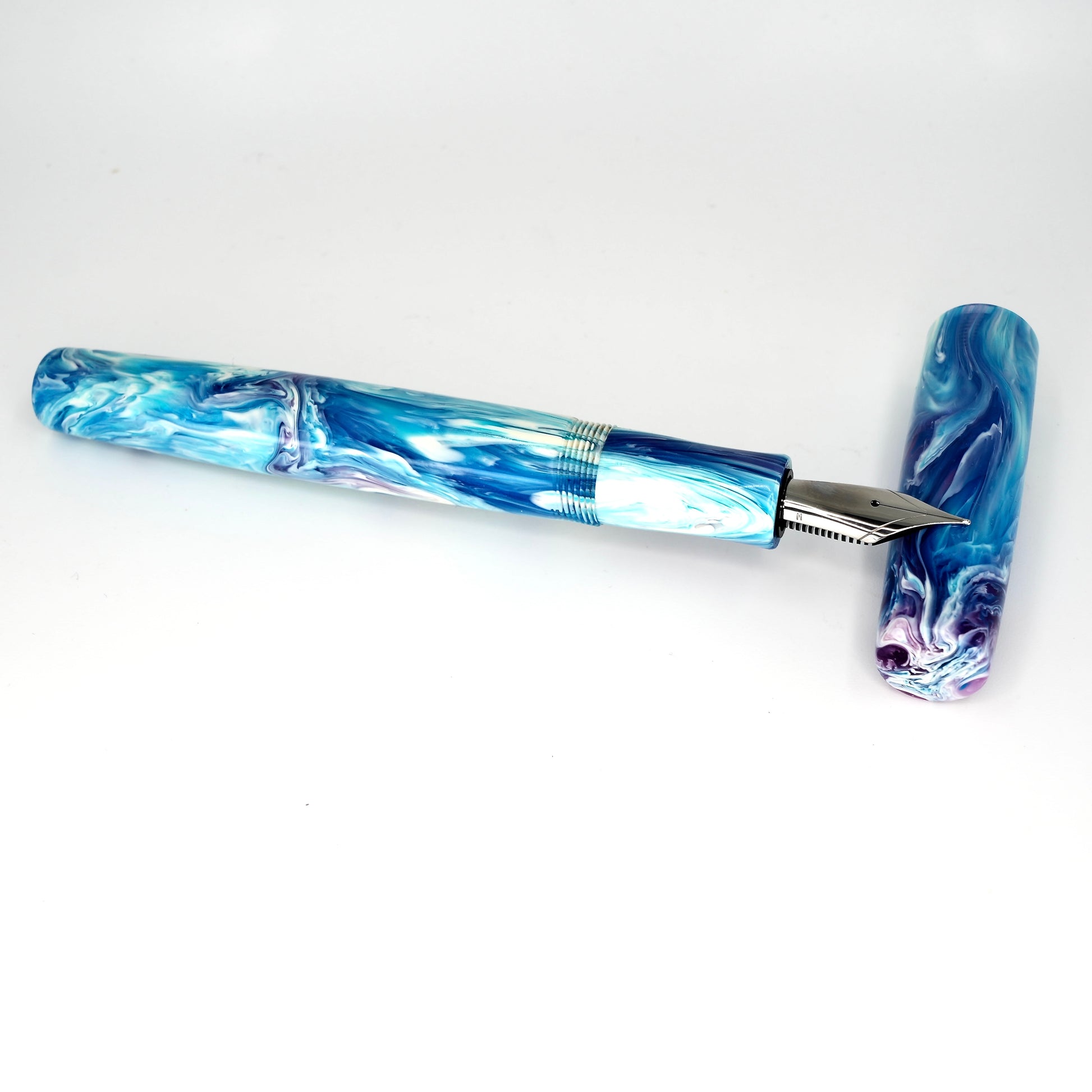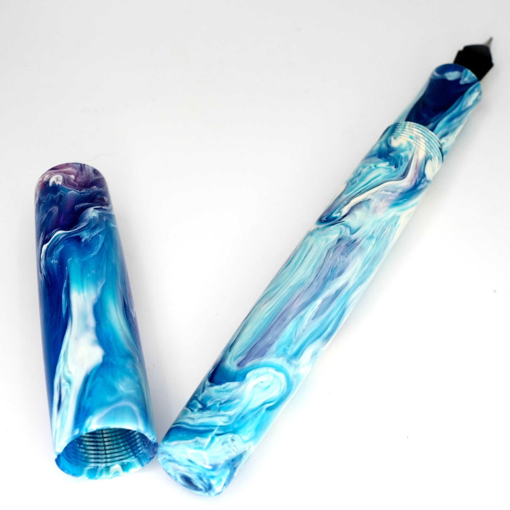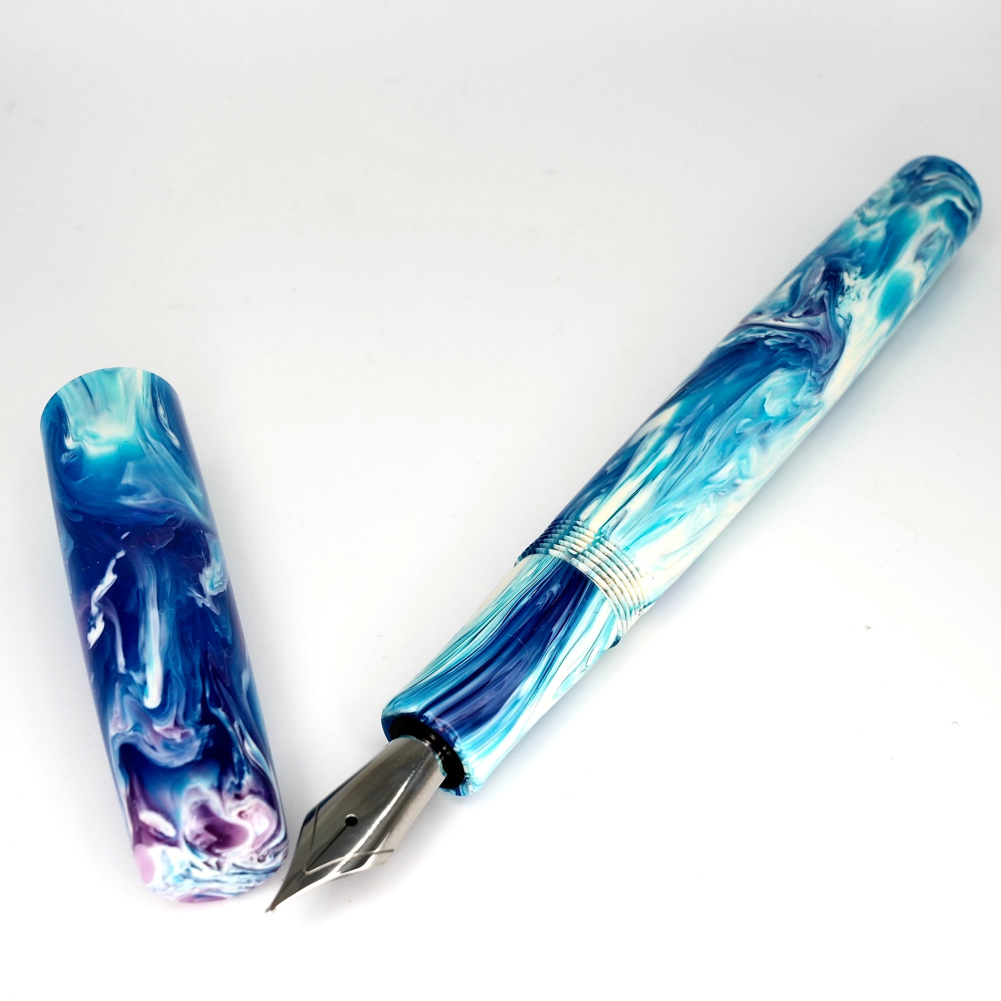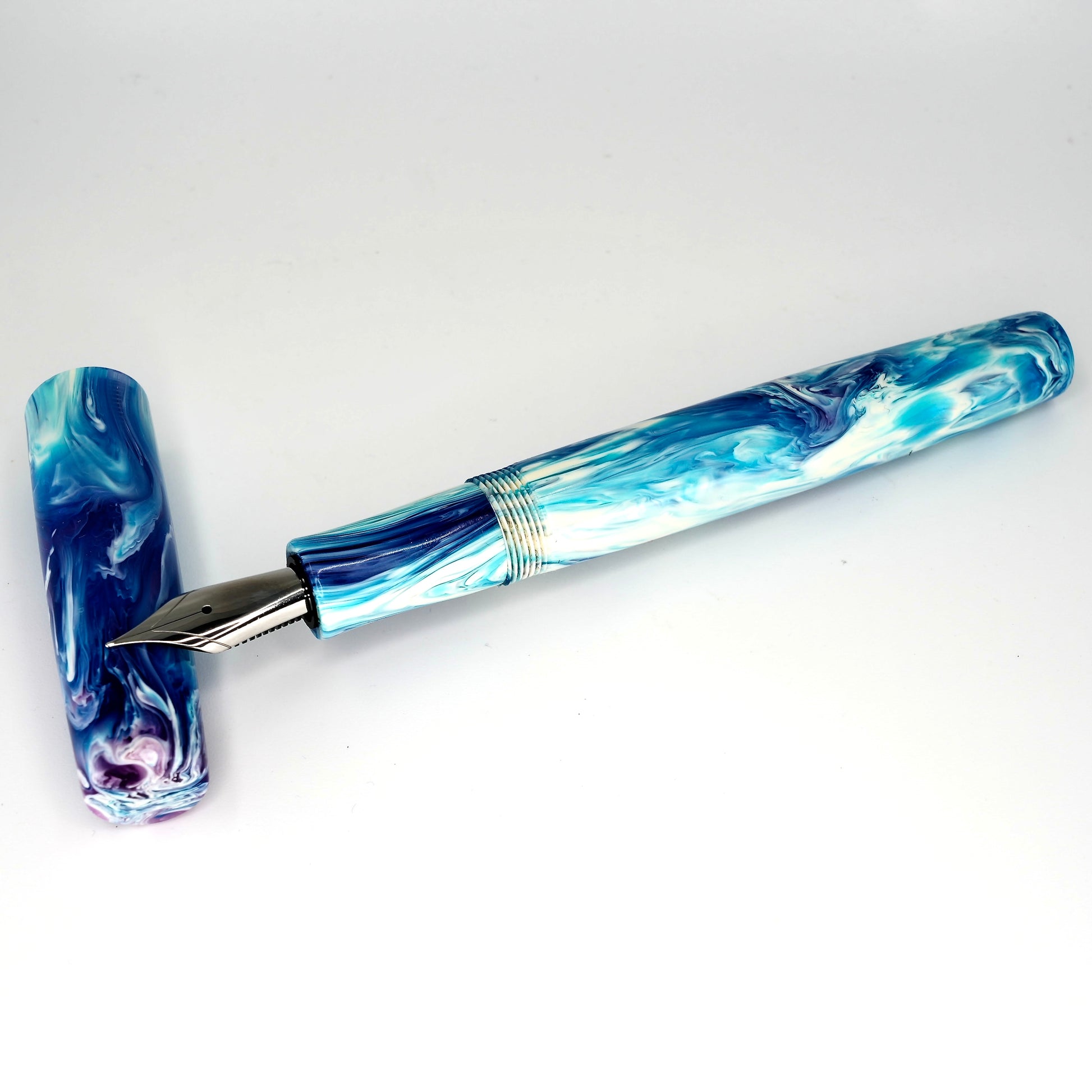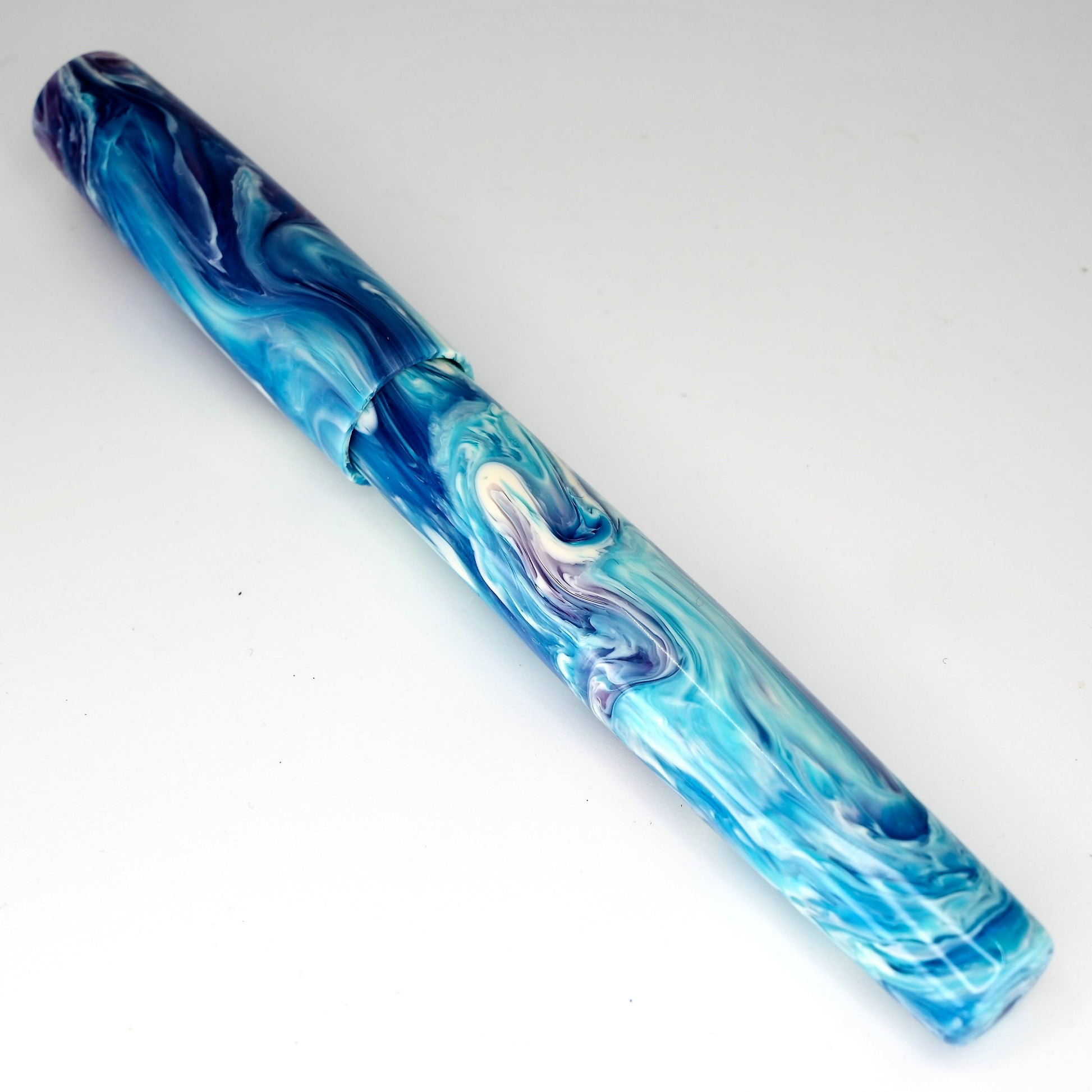 Presenting this stunning Peacock Koi blank cast by Carolina pen co a Stepless 14mm pen from Silver Burl Pens. Part of the Simply Elegant series, this pen is made for writers who appreciate both comfort and style. Its sleek design is perfect for carrying in a pocket or bag, or displaying on a desk. Each pen is carefully crafted to the highest standards and includes a size six Jowo nib and Schmidt K5 ink converter. The polished steel nib is offered in different tip sizes, and other nib options are available by contacting john@silverburlpens.com.