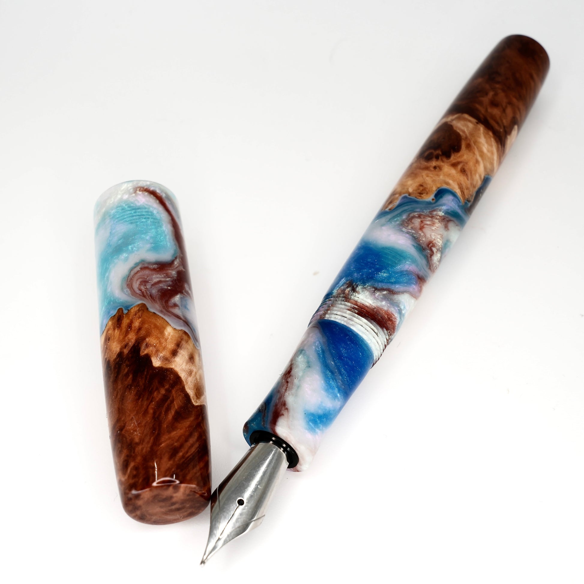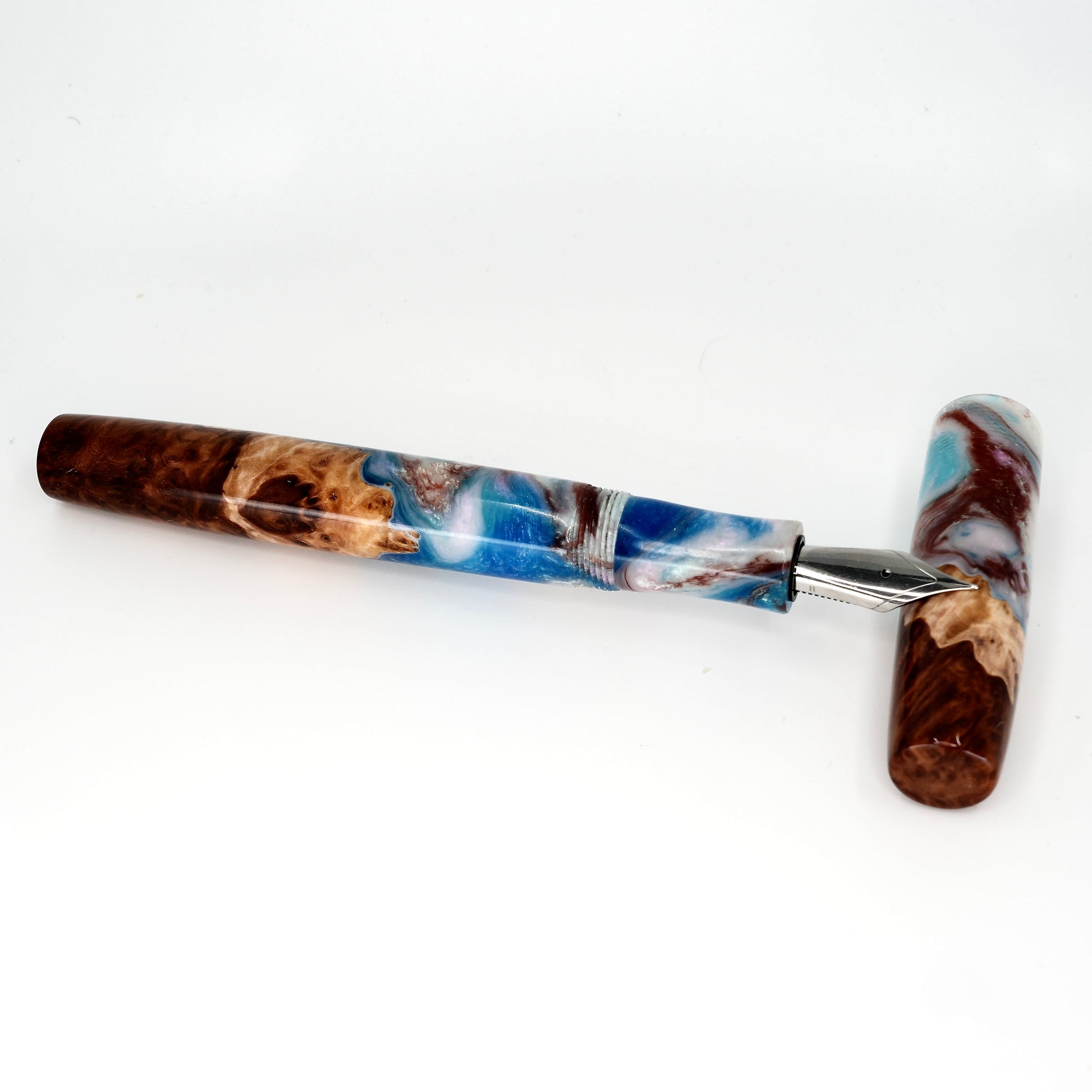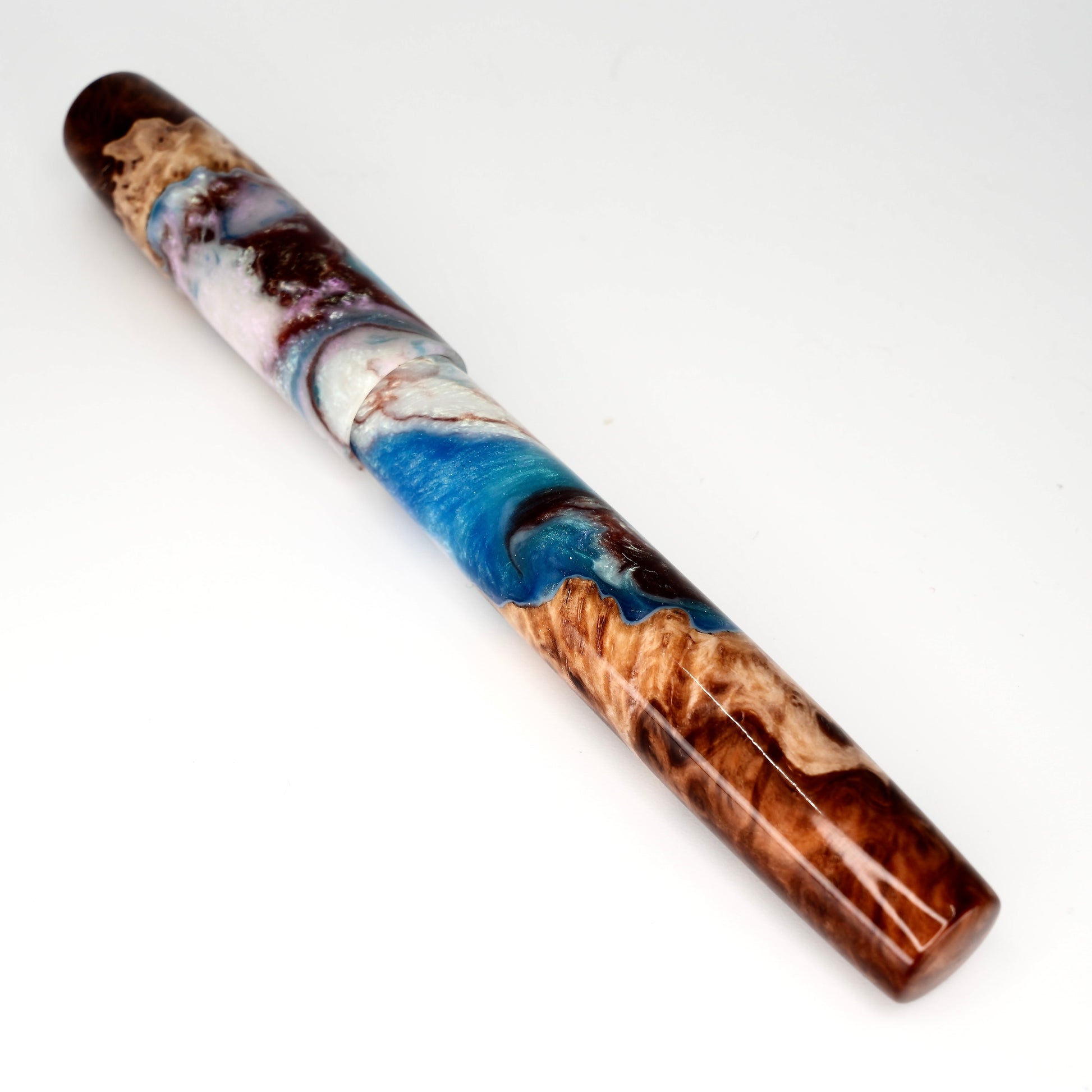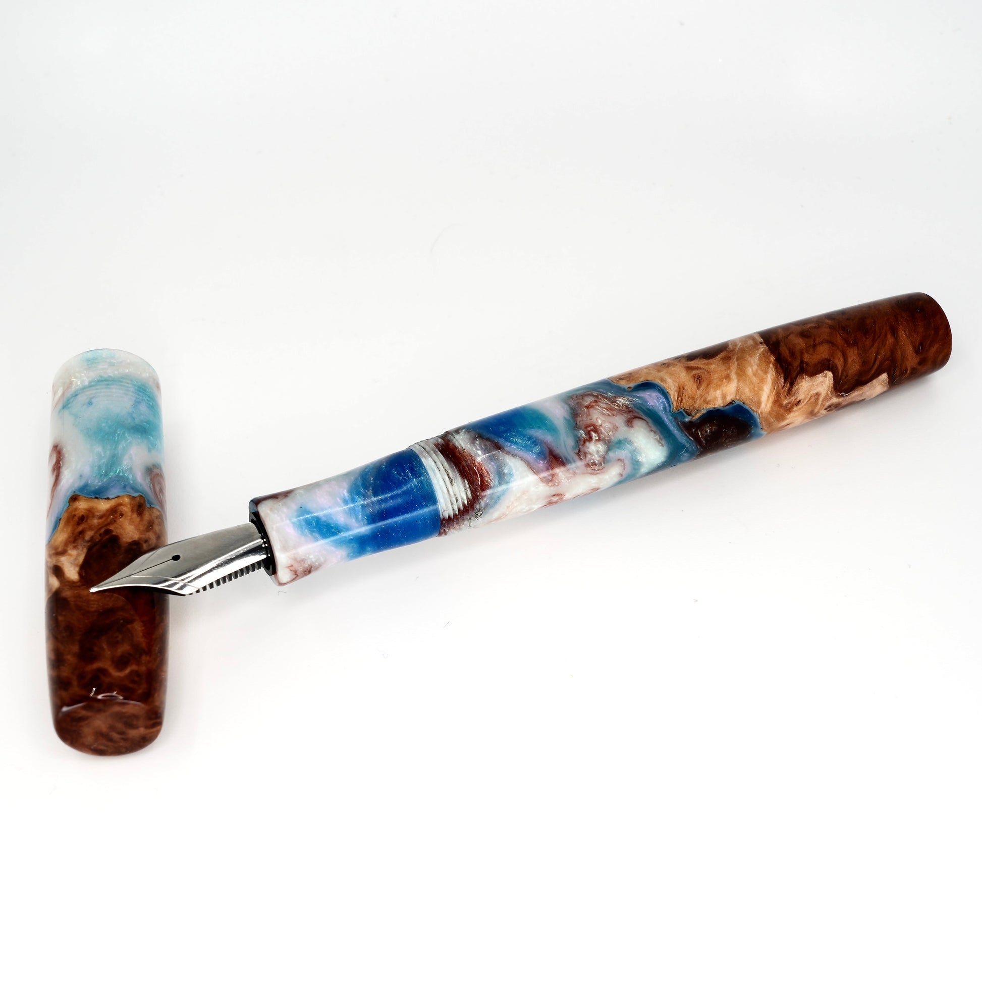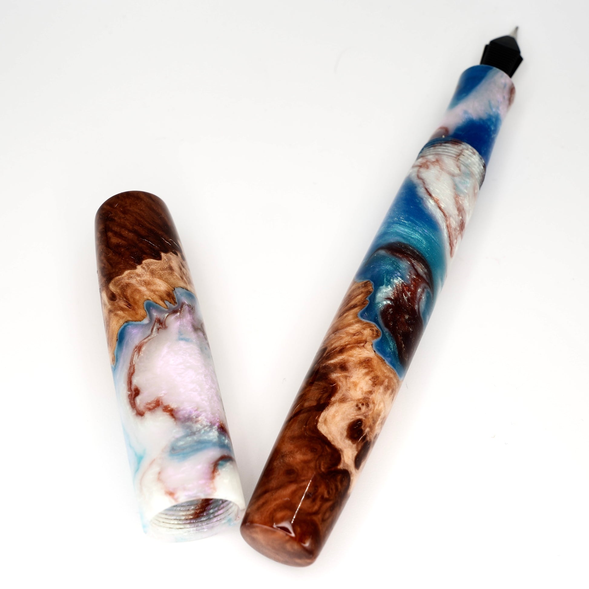 Experience the stunning and unique appearance of Burl Hybrid, made with exquisite Red Mallee Burl wood. Each pen is handcrafted with the wood's natural identity and features, making every piece truly one-of-a-kind. From the grip and nib section to the triple start thread, every detail is meticulously done by all handmade by John here in Cornwall. Rest assured that no pen kit has been used in the making of these pens, showcasing the level of craftsmanship and quality that is reflected in the price. With a polished steel iridium tip Jowo nib and a Schmidt K5 premium ink converter filling system, our pen offers versatility and convenience. Contact us in advance to learn more about custom options, shipping times, and pricing. PEN SIZE: Overall length including cap 140m/m Nib tip to body end 135m/m Body diameter 14m/m body to cap thread 14m/m triple start. Cap diameter 15.5m/m Section diameter at narrowest point 11.4mm